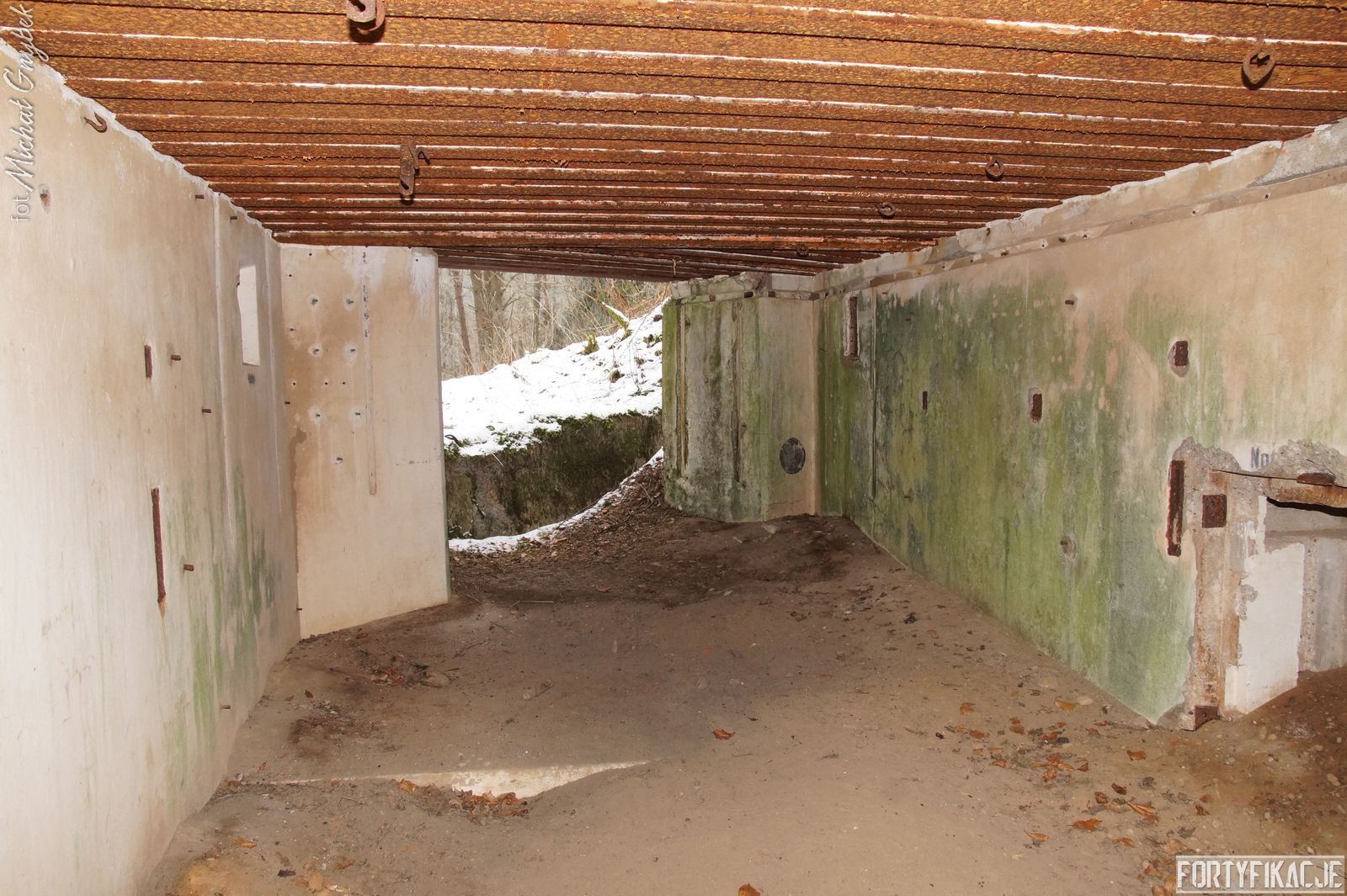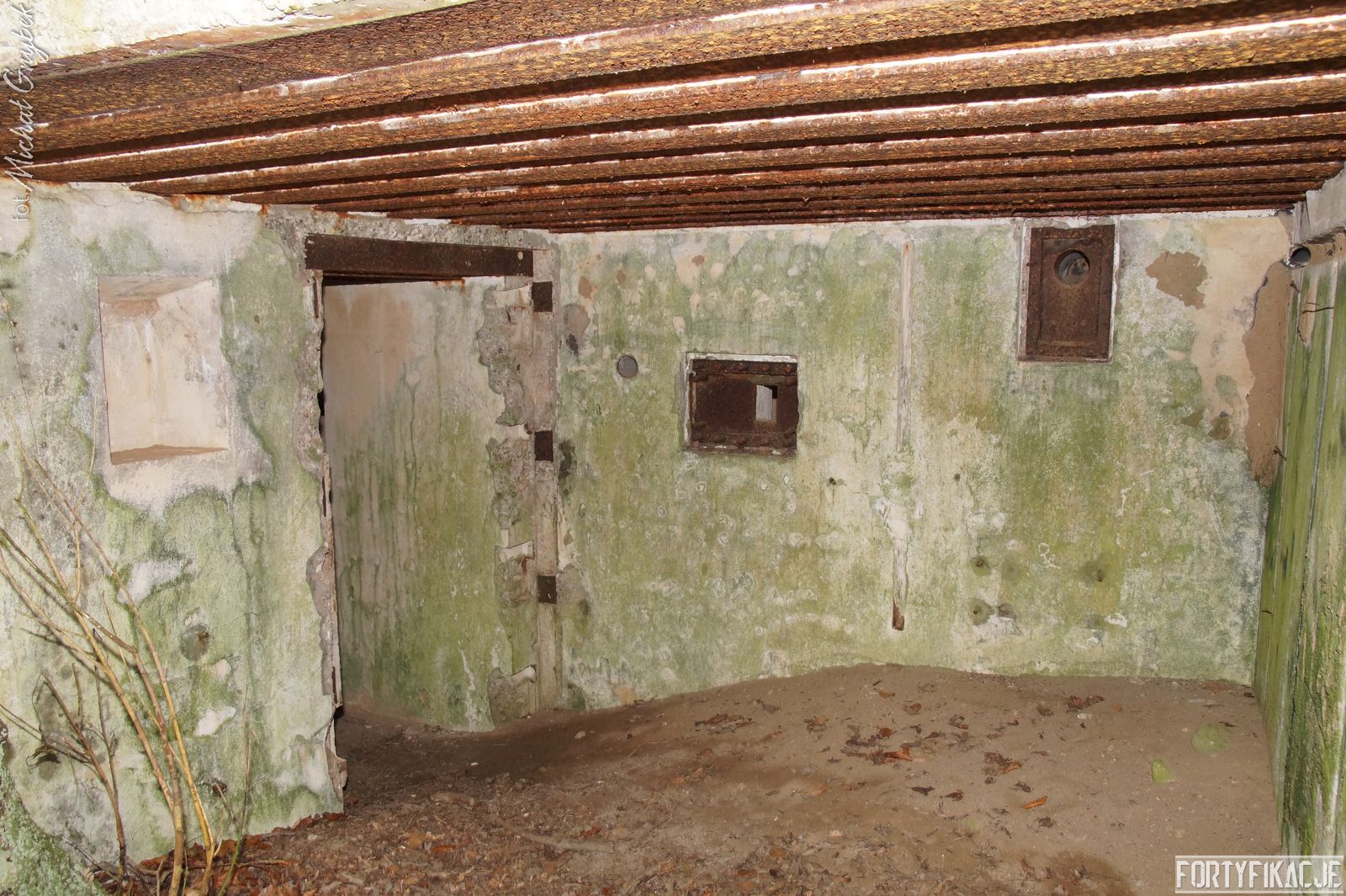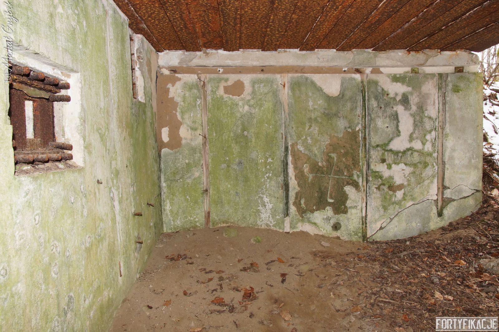 Zajrzyjmy do środka! Mimo, że Stand pokrywał ogniem dwa sektory, to jego wnętrze kryje jedynie trzy pomieszczenia! Blok wejściowy/śluza gazoszczelna był niewielkich rozmiarów. Stąd załoga mogła dostać się do jednego pomieszczenia: Izby bojowej skierowanej na wschód. Było to zdecydowanie największe pomieszczenie schronu. Jego kubatura wskazuje, że mogła być to też izba dla drużyny wypadowej (?). Stąd natomiast załoga mogła się udać do izby bojowej skierowanej ku północnemu-wschodowi, pełniącej również rolę wartowni, znajdziemy tu zachowaną lekką tarczę stalową ze strzelnicą broni ręcznej.