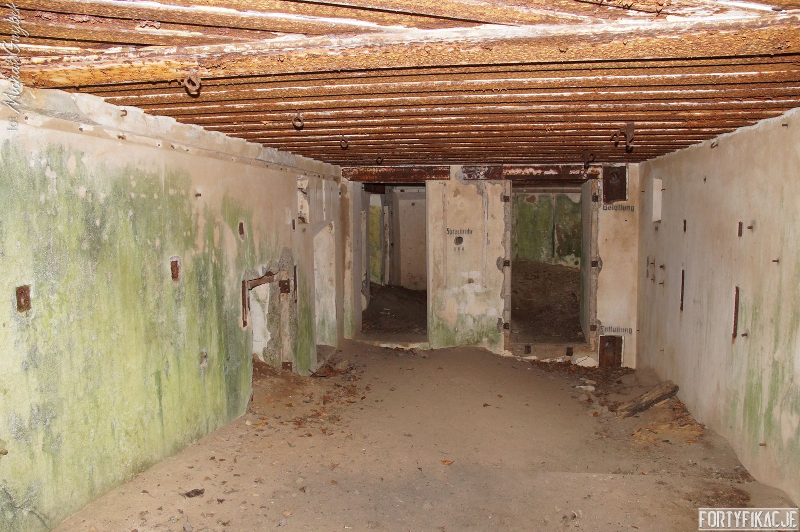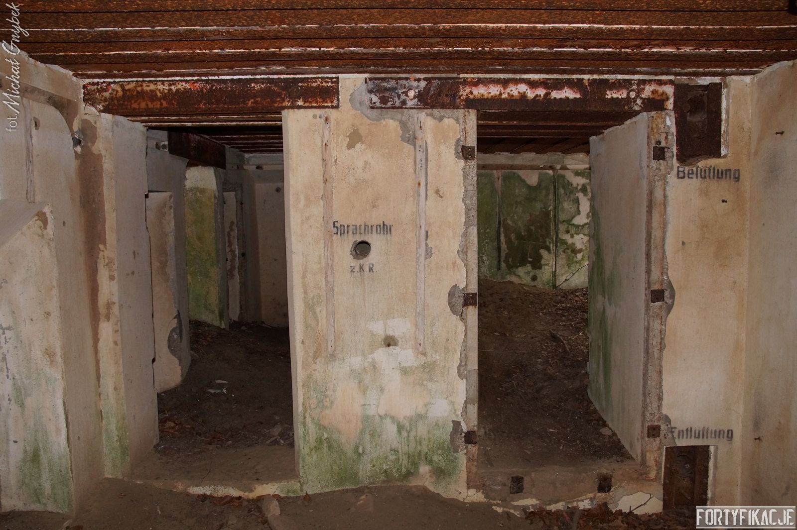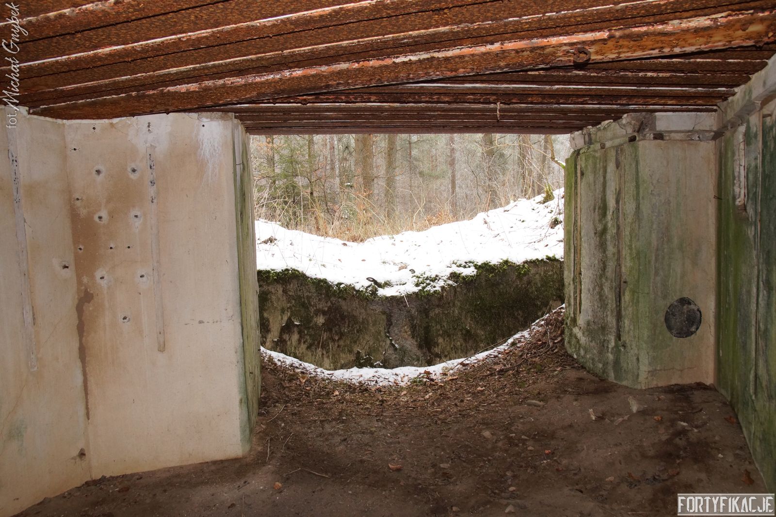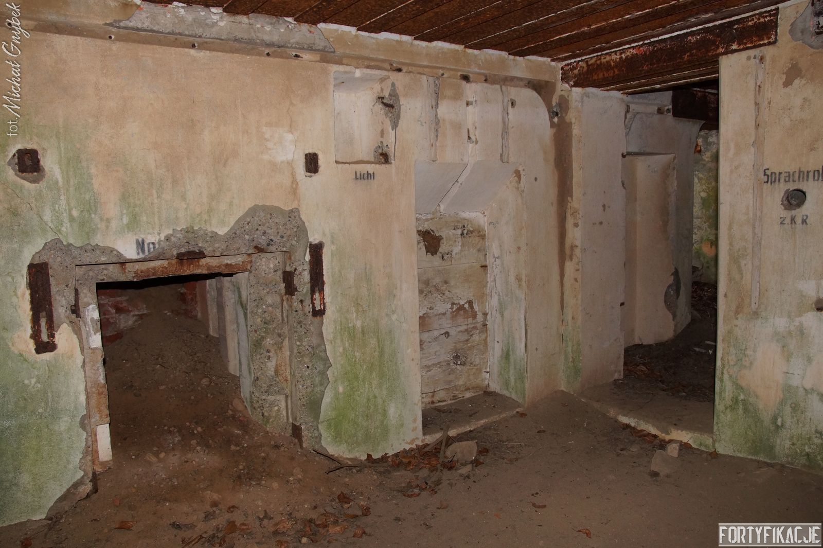 Zajrzyjmy do środka! Mimo, że Stand pokrywał ogniem dwa sektory, to jego wnętrze kryje jedynie trzy pomieszczenia! Blok wejściowy/śluza gazoszczelna był niewielkich rozmiarów. Stąd załoga mogła dostać się do jednego pomieszczenia: Izby bojowej skierowanej na wschód. Było to zdecydowanie największe pomieszczenie schronu. Jego kubatura wskazuje, że mogła być to też izba dla drużyny wypadowej (?). Stąd natomiast załoga mogła się udać do izby bojowej skierowanej ku północnemu-wschodowi, pełniącej również rolę wartowni, znajdziemy tu zachowaną lekką tarczę stalową ze strzelnicą broni ręcznej.