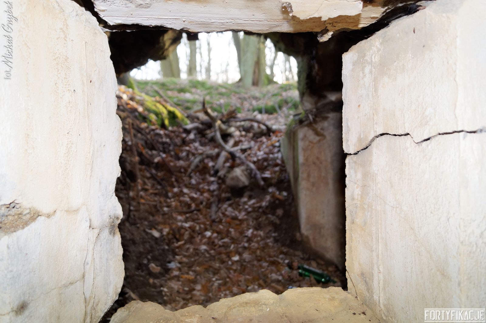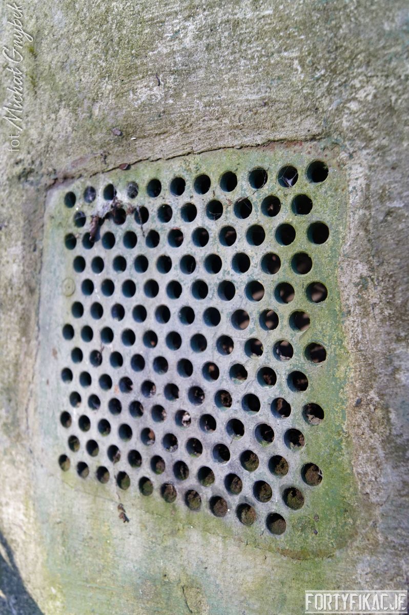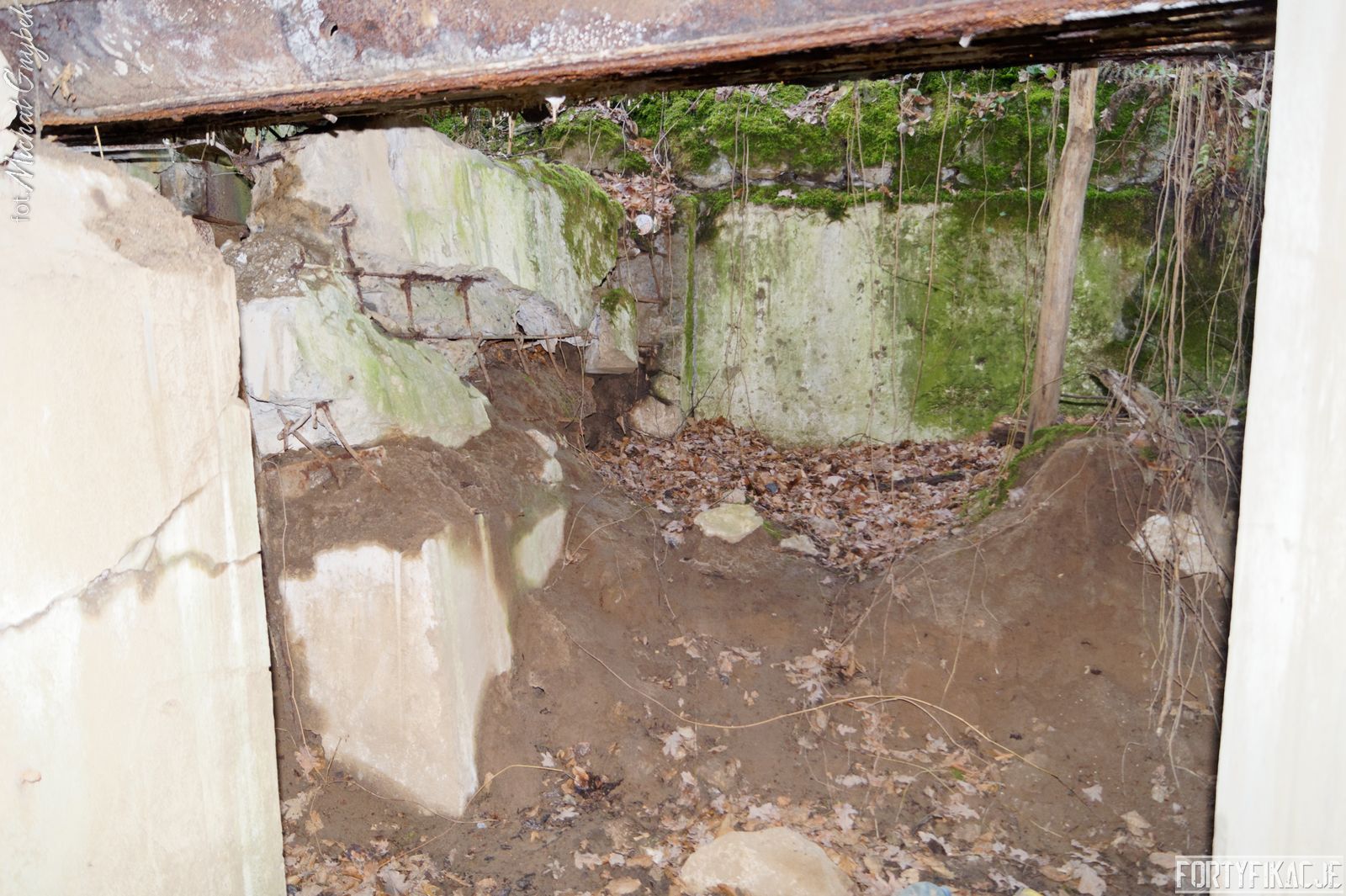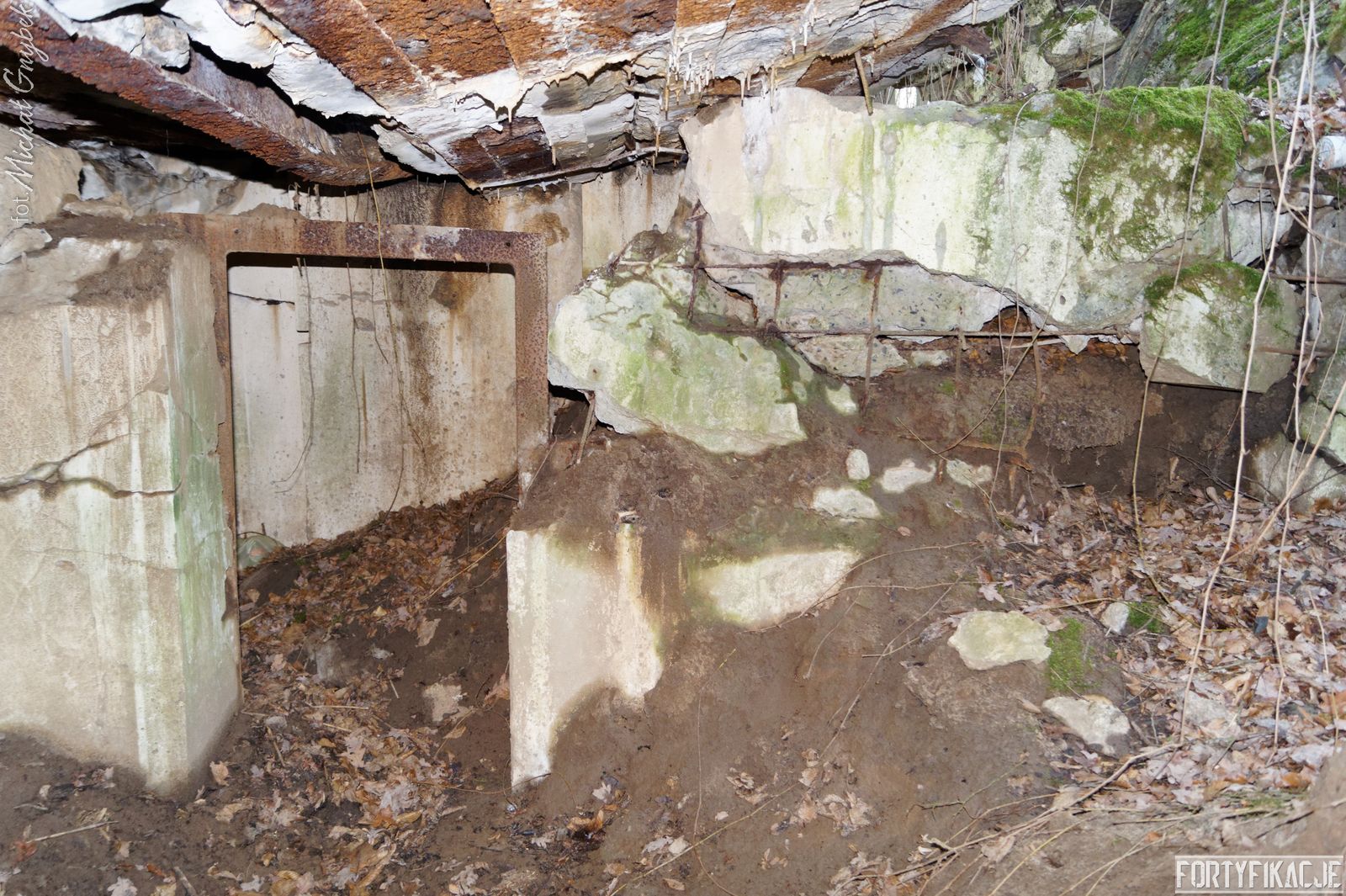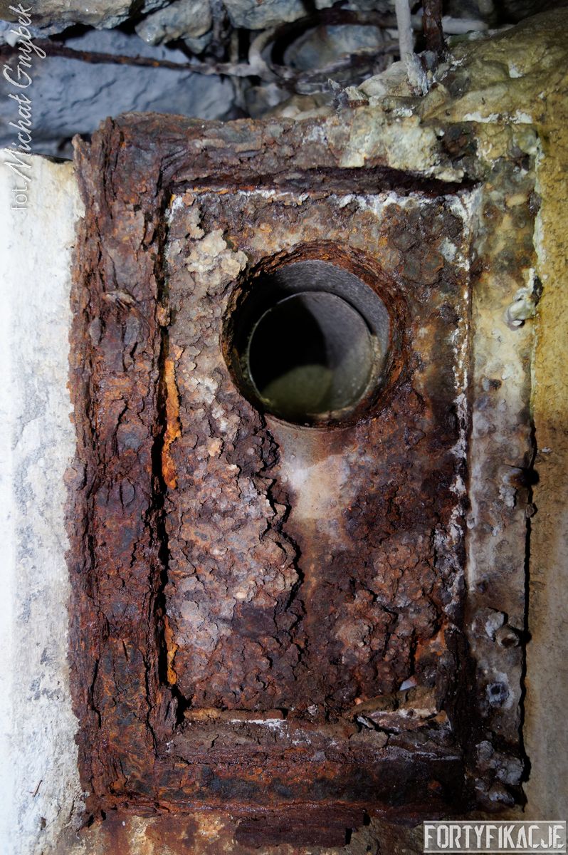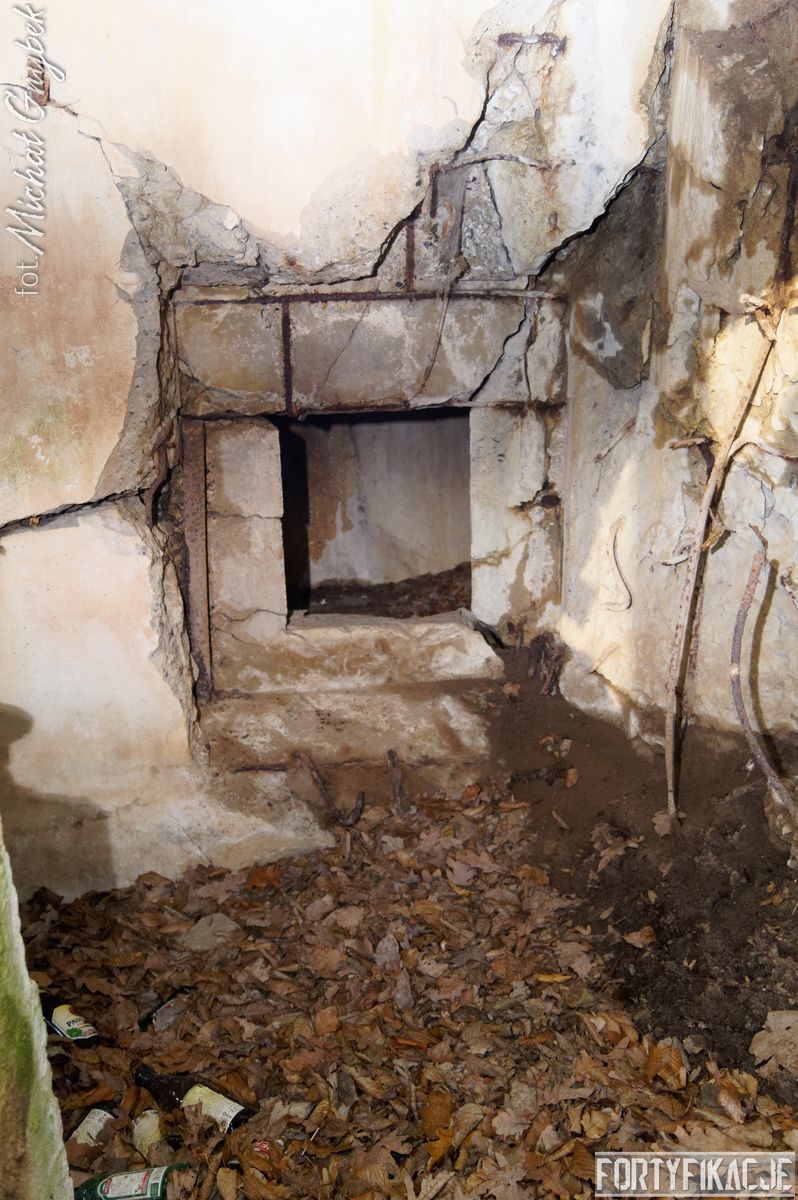 Wejdźmy do środka! Mimo niewielkich rozmiarów schronu trzeba zachować tu szczególną ostrożność! Obiekt został wysadzony, sterczą więc tu gdzieniegdzie pręty zbrojeniowe, a przez wyrwy w stropie sypie się ziemia... Obiekt składał się z trzech pomieszczeń: bloku wejściowego, który w wyniku eksplozji ucierpiał najbardziej; izby załogi, która obecnie częściowo jest zasypana; izby bojowej, której stan jest najbardziej przyzwoity, włącznie z zachowaną płytą stalową 7P7. Niestety... Schron jest nieustannie dewastowany... Z jego wnętrza złomiarze m.in. wykradli obie tarcze 48P8...