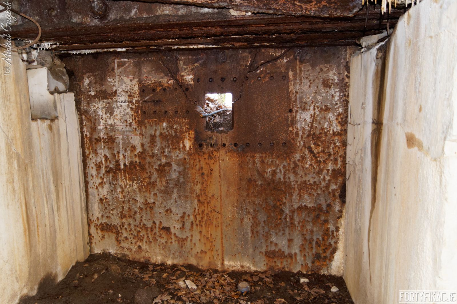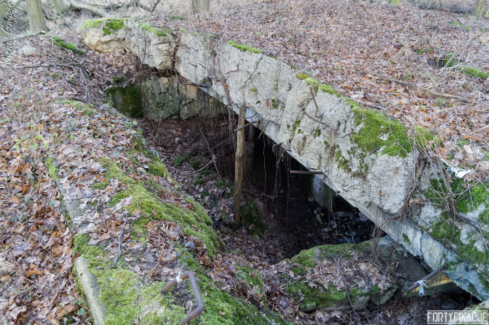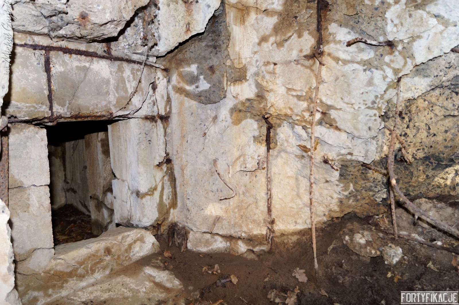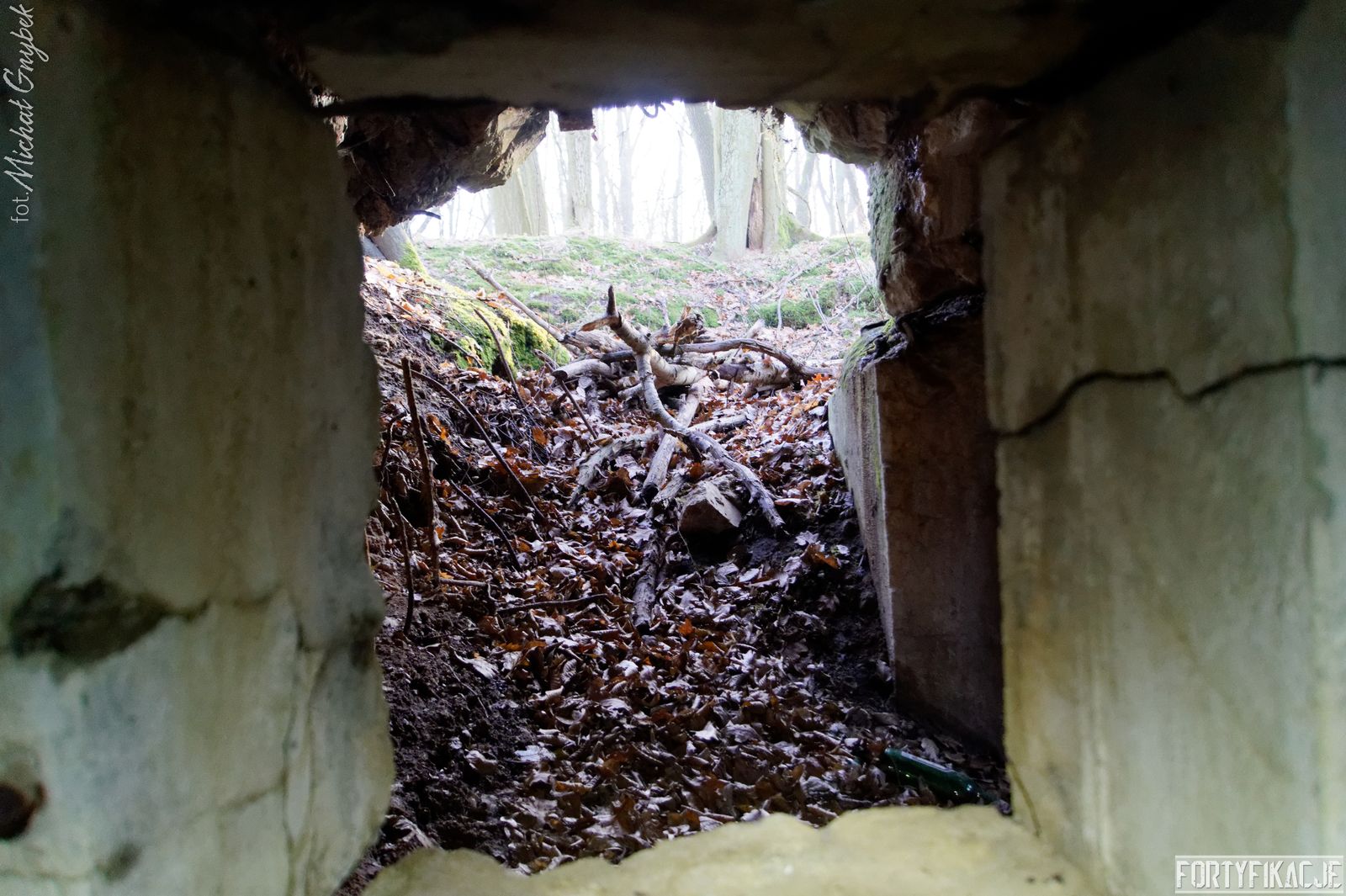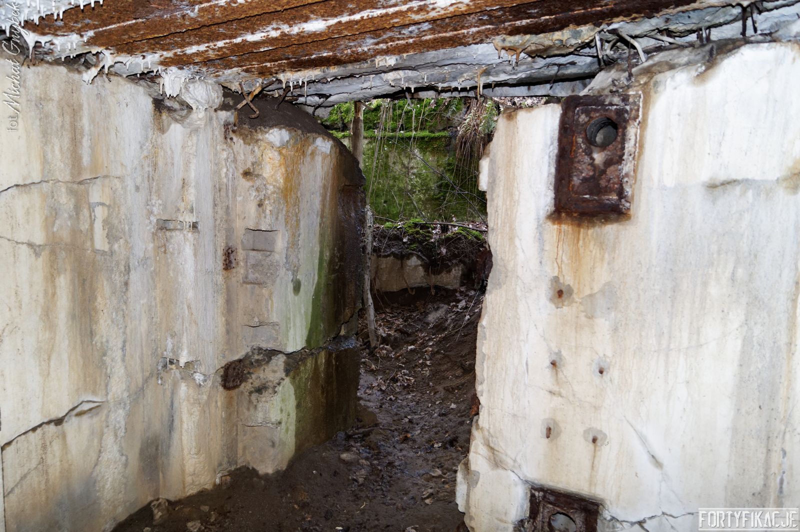 Wejdźmy do środka! Mimo niewielkich rozmiarów schronu trzeba zachować tu szczególną ostrożność! Obiekt został wysadzony, sterczą więc tu gdzieniegdzie pręty zbrojeniowe, a przez wyrwy w stropie sypie się ziemia... Obiekt składał się z trzech pomieszczeń: bloku wejściowego, który w wyniku eksplozji ucierpiał najbardziej; izby załogi, która obecnie częściowo jest zasypana; izby bojowej, której stan jest najbardziej przyzwoity, włącznie z zachowaną płytą stalową 7P7. Niestety... Schron jest nieustannie dewastowany... Z jego wnętrza złomiarze m.in. wykradli obie tarcze 48P8...