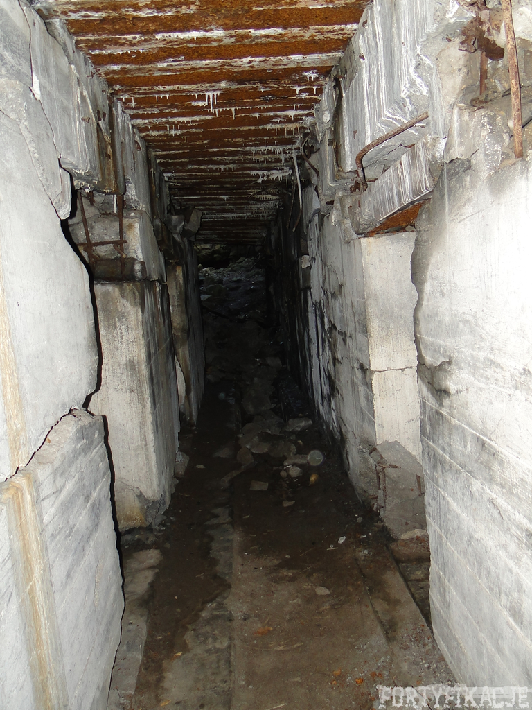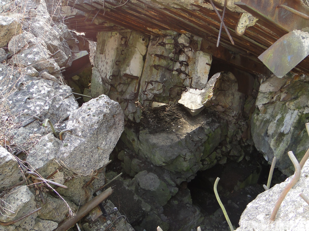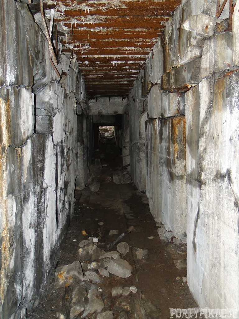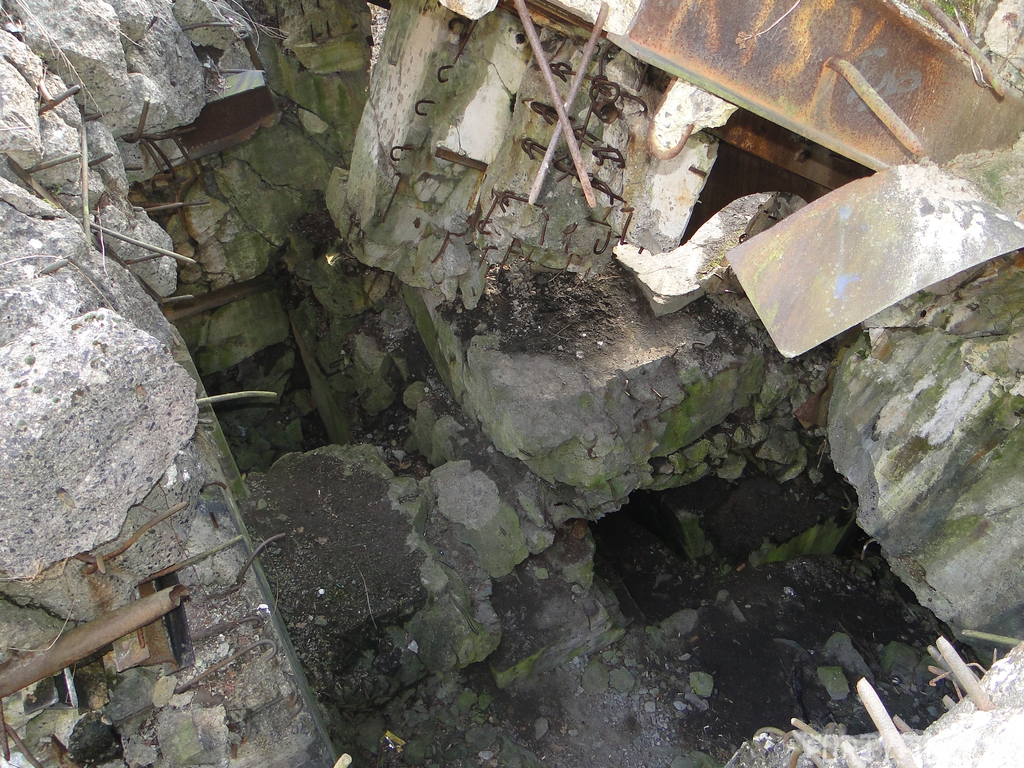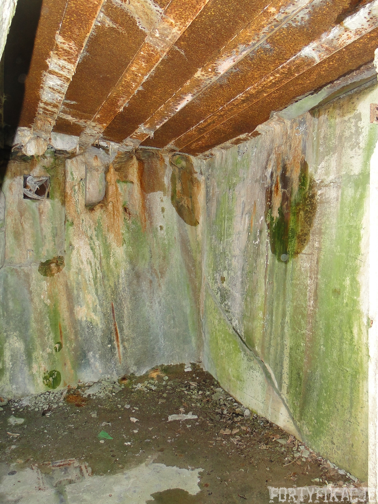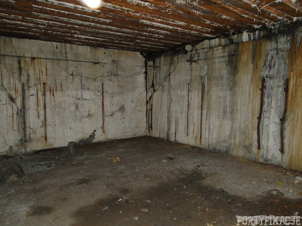 Czas zajrzeć do środka górnej kondygnacji (postarałem się zachować podział na górną i dolną kondygnację, choć wiem, że nie zawsze było to możliwe - zniszczenia poczynione przez saperów zrobiły swoje). Na górną kondygnację można było dostać się dwoma wejściami, które bronione były przez strzelnice osłonięte płytami stalowymi 10P7. Co ciekawe obie płyty osłaniały jedną izbę bojową, która ponadto pełniła rolę łącznika pomiędzy blokiem wejściowym a resztą pomieszczeń górnej kondygnacji. Praktycznie żadna z izb tejże nie przetrwała w całości. Potężne eksplozje uczyniły zeń poskręcany, miejscami mocno nieczytelny przekrój pionowy. To na tej kondygnacji znajdziemy jeden z słynnych symboli FF O-W-B: odciśniętą w żelbecie datę wzniesienia obiektu: "1935/36". Natkniemy się też na częściowo zachowane pancerze: pocięte palnikami płyty stalowe 10P7.