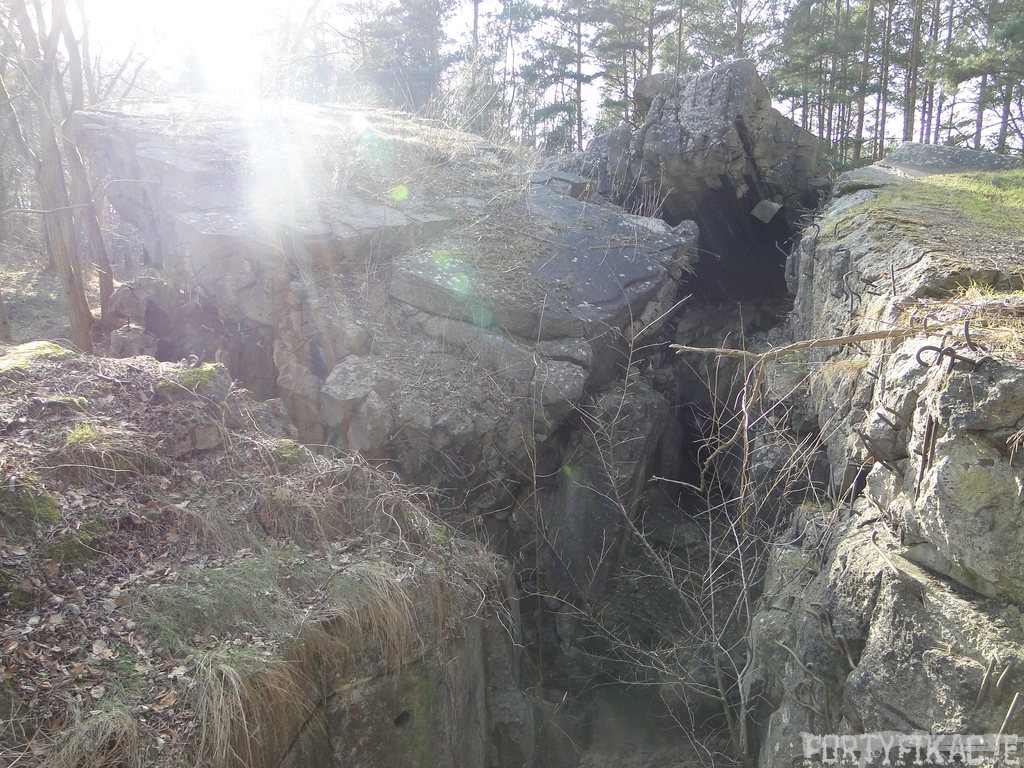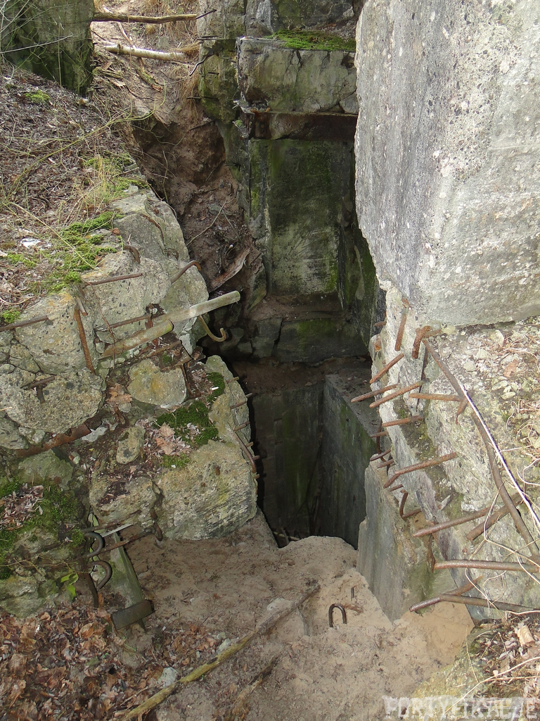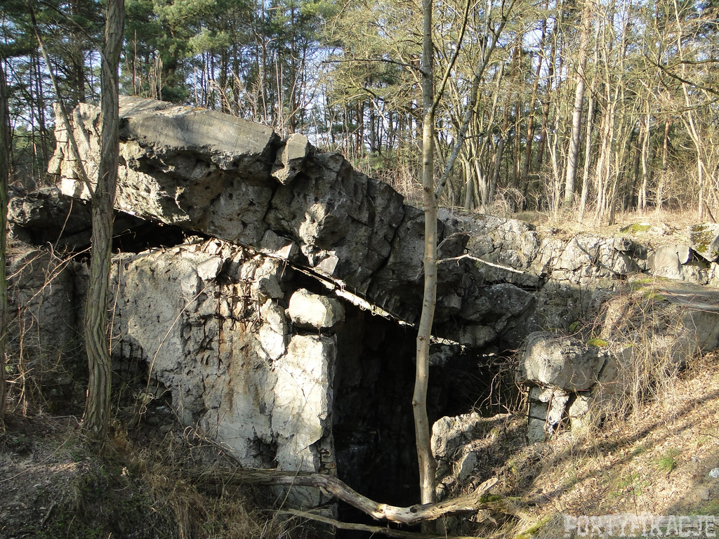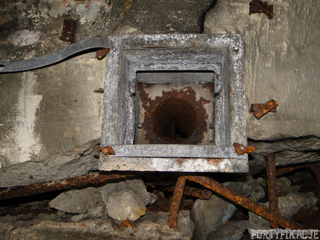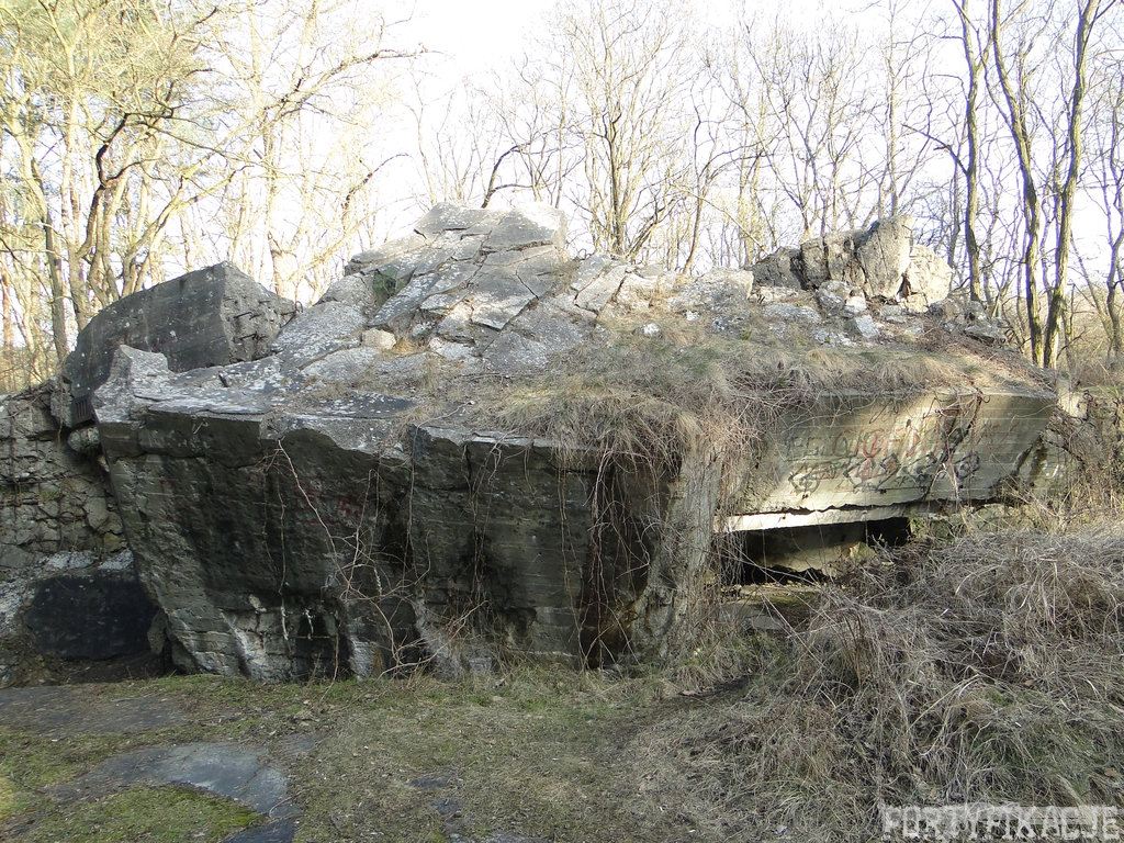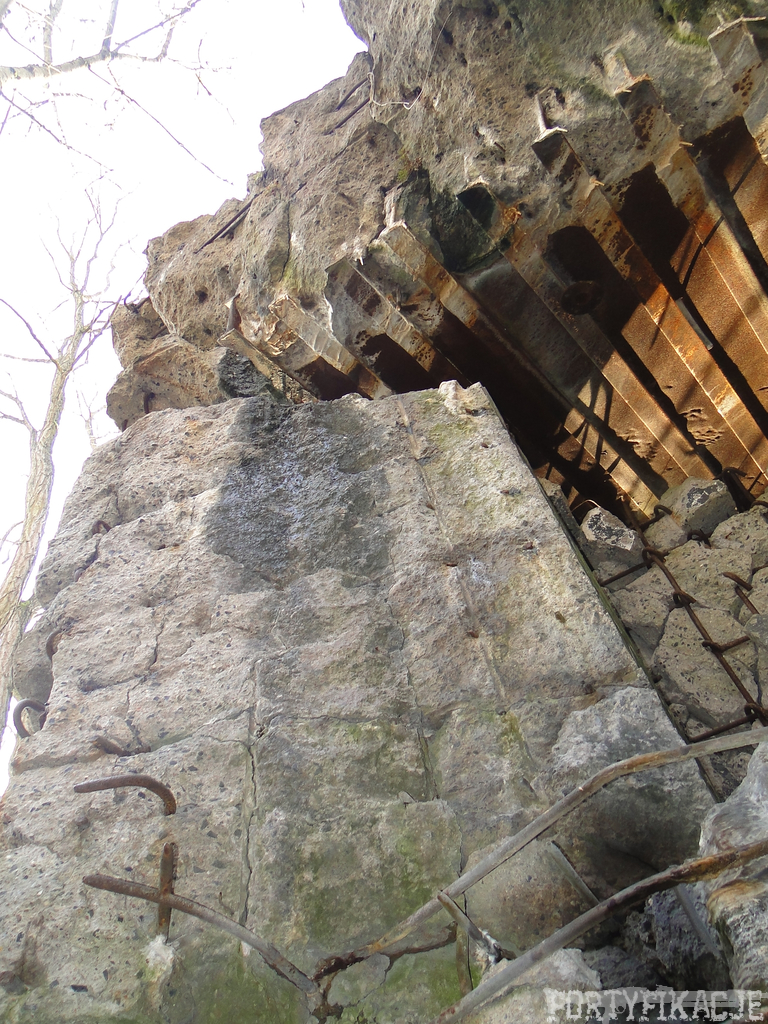 Czas zajrzeć do środka górnej kondygnacji (postarałem się zachować podział na górną i dolną kondygnację, choć wiem, że nie zawsze było to możliwe - zniszczenia poczynione przez saperów zrobiły swoje). Na górną kondygnację można było dostać się dwoma wejściami, które bronione były przez strzelnice osłonięte płytami stalowymi 10P7. Co ciekawe obie płyty osłaniały jedną izbę bojową, która ponadto pełniła rolę łącznika pomiędzy blokiem wejściowym a resztą pomieszczeń górnej kondygnacji. Praktycznie żadna z izb tejże nie przetrwała w całości. Potężne eksplozje uczyniły zeń poskręcany, miejscami mocno nieczytelny przekrój pionowy. To na tej kondygnacji znajdziemy jeden z słynnych symboli FF O-W-B: odciśniętą w żelbecie datę wzniesienia obiektu: "1935/36". Natkniemy się też na częściowo zachowane pancerze: pocięte palnikami płyty stalowe 10P7.