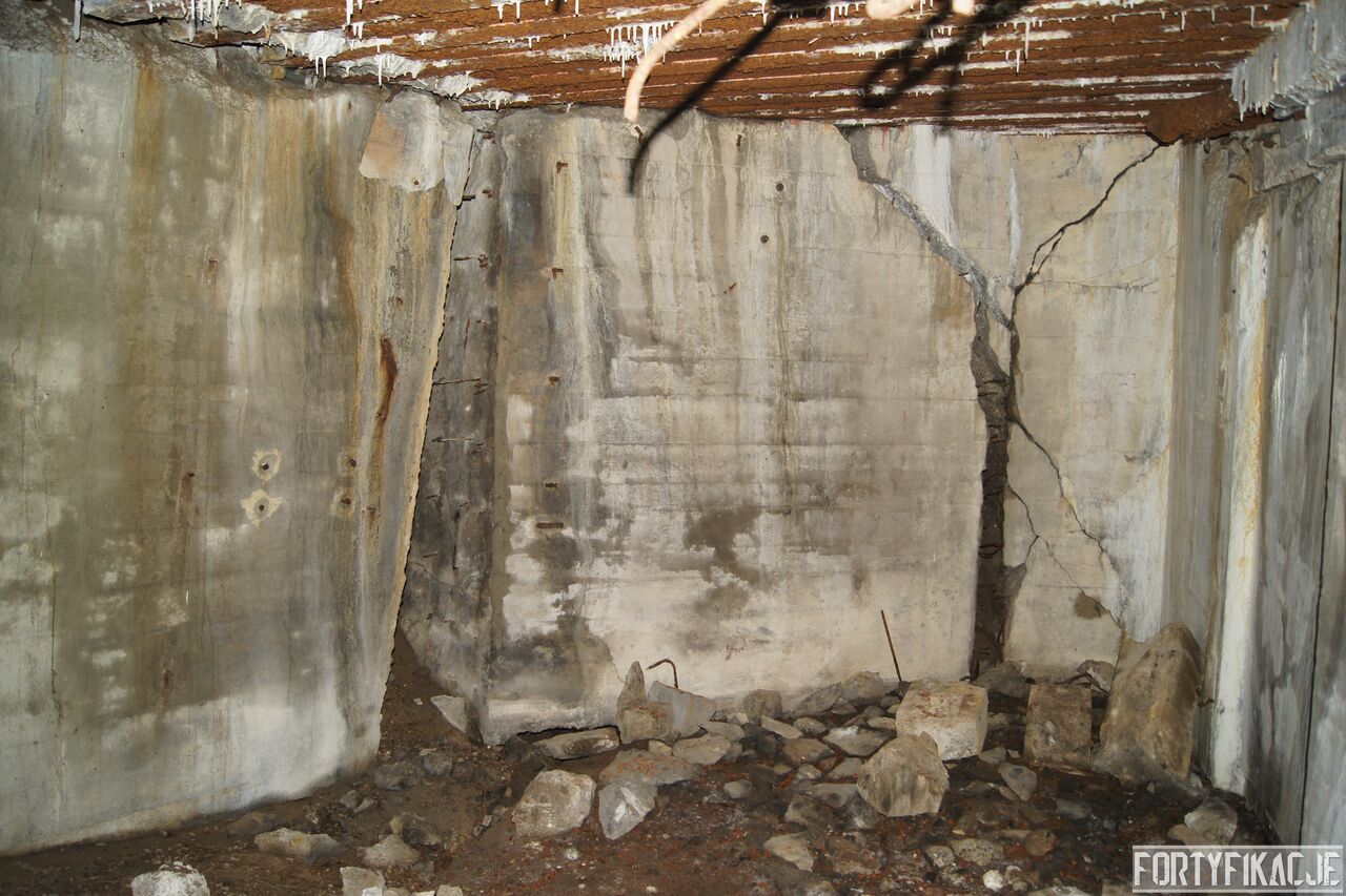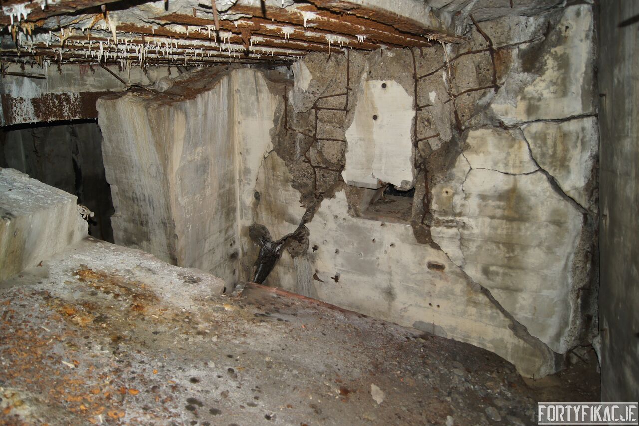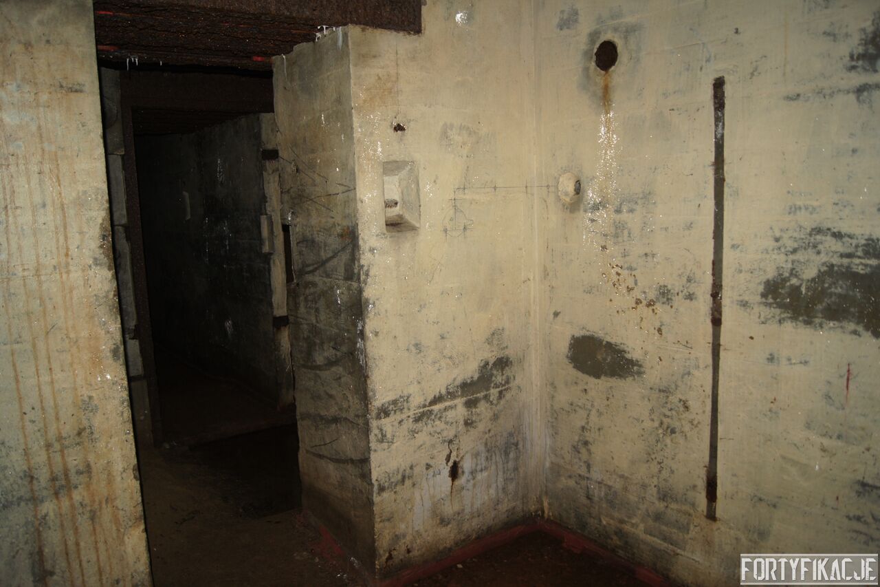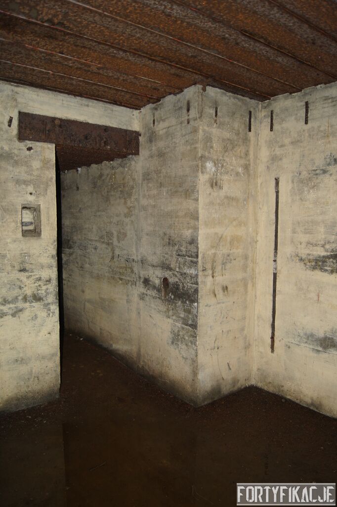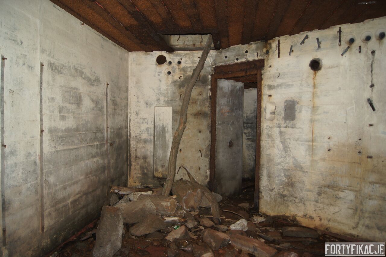 Wejdźmy na górną kondygnację. Tu poczynione zostały największe zniszczenia. Część pomieszczeń pozbawionych jest stropu, a ściany schronu poprzemieszczane. Największym zniszczeniom uległy izby bojowe, szyby kopuł, izba dowódcy oraz maszynownia. Kilka pomieszczeń górnej kondygnacji przetrwała jednak w jako takim stanie. Na wyróżnienie zasługuje m.in. izba łączności, blok wejściowy z dołami-pułapkami, nad którymi wisiały opuszczane drzwi 99P9 oraz kazamata z płytą pancerną 6P7. Był to pancerz o niebagatelnej grubości 20cm. W Pz. W. 712 została ona wycięta palnikami na tyle "delikatnie", że izba przetrwała, a w betonie widoczne są elementy mocowania płyty.