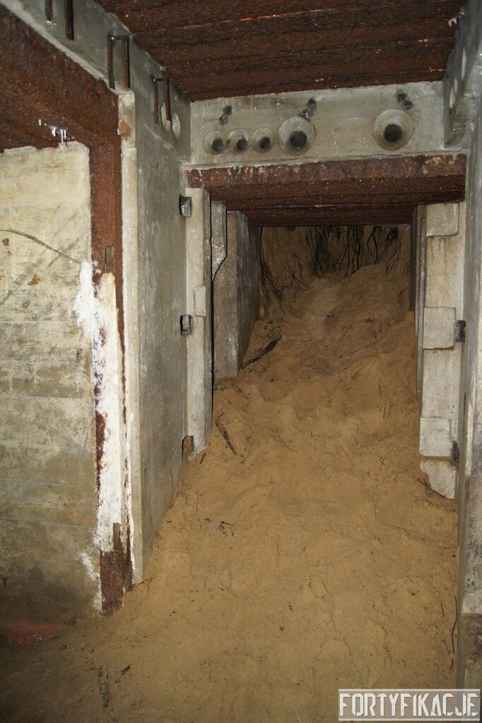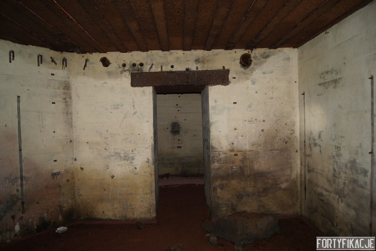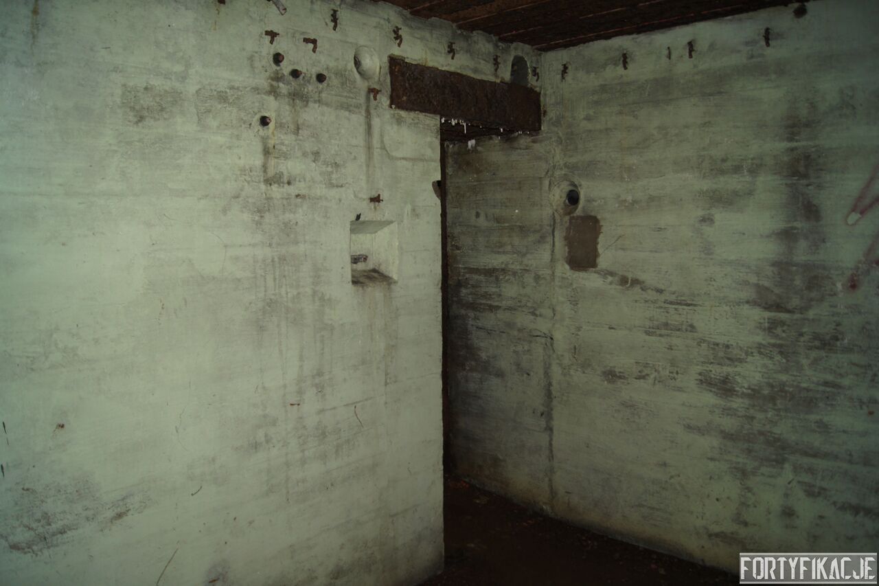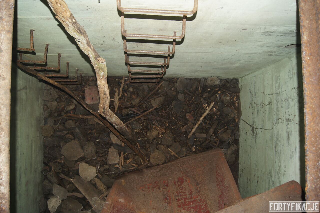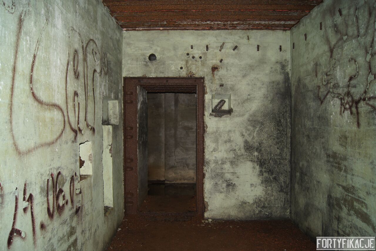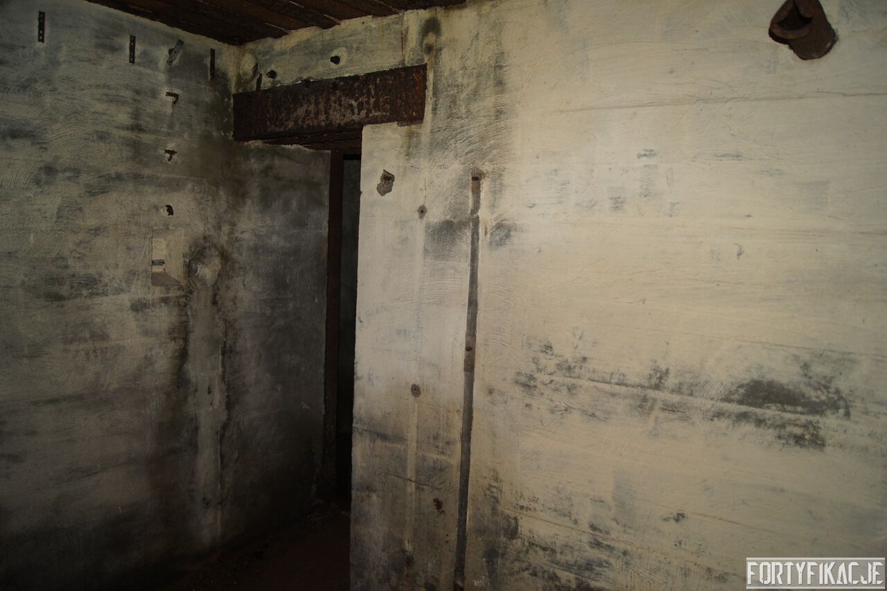 Wejdźmy na górną kondygnację. Tu poczynione zostały największe zniszczenia. Część pomieszczeń pozbawionych jest stropu, a ściany schronu poprzemieszczane. Największym zniszczeniom uległy izby bojowe, szyby kopuł, izba dowódcy oraz maszynownia. Kilka pomieszczeń górnej kondygnacji przetrwała jednak w jako takim stanie. Na wyróżnienie zasługuje m.in. izba łączności, blok wejściowy z dołami-pułapkami, nad którymi wisiały opuszczane drzwi 99P9 oraz kazamata z płytą pancerną 6P7. Był to pancerz o niebagatelnej grubości 20cm. W Pz. W. 712 została ona wycięta palnikami na tyle "delikatnie", że izba przetrwała, a w betonie widoczne są elementy mocowania płyty.