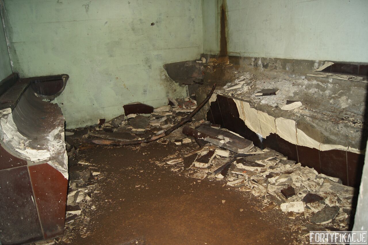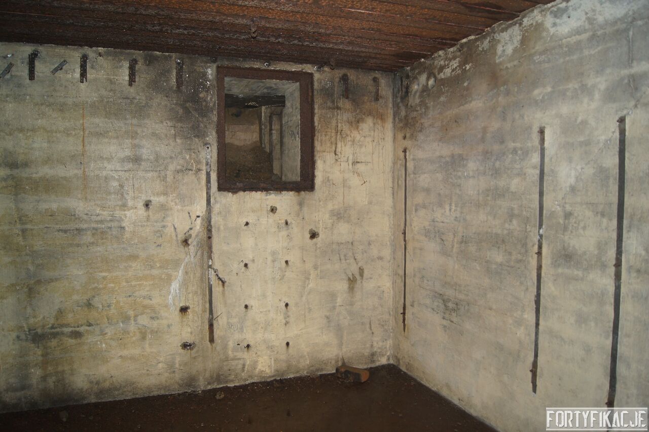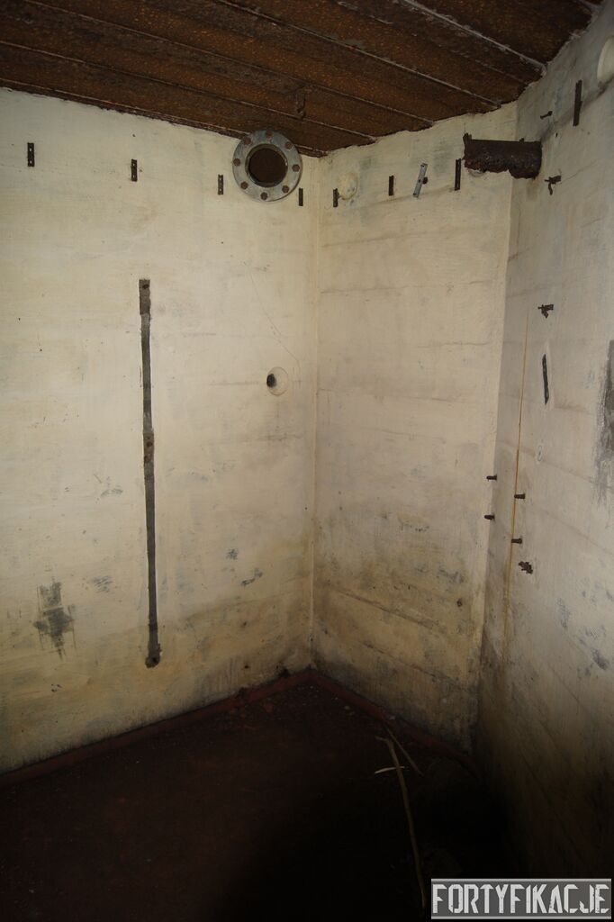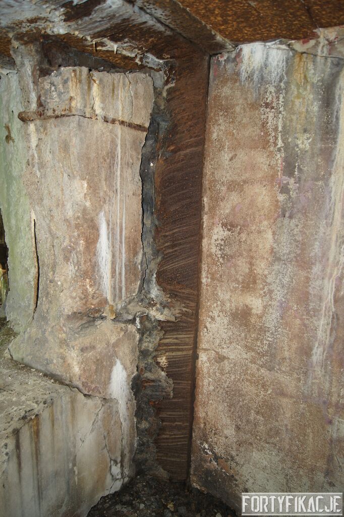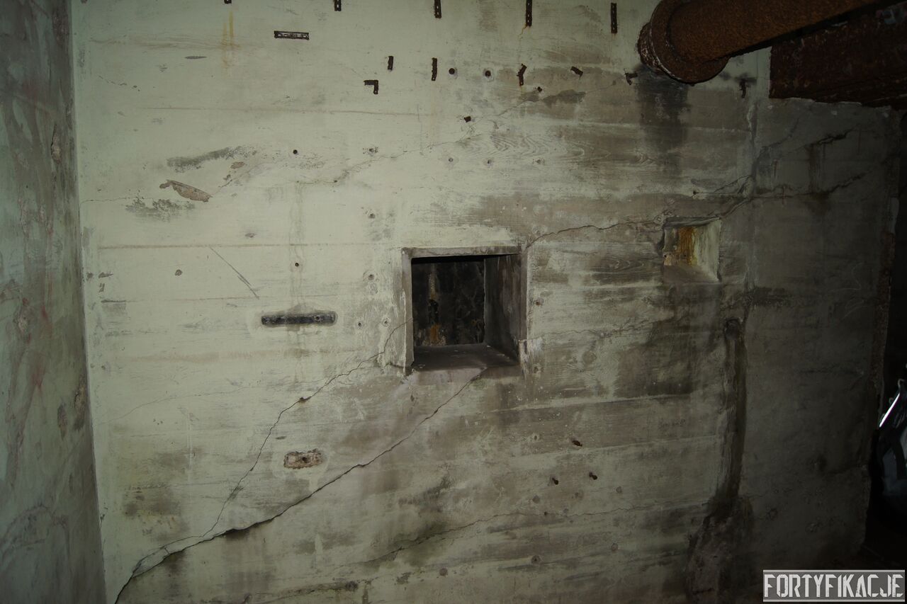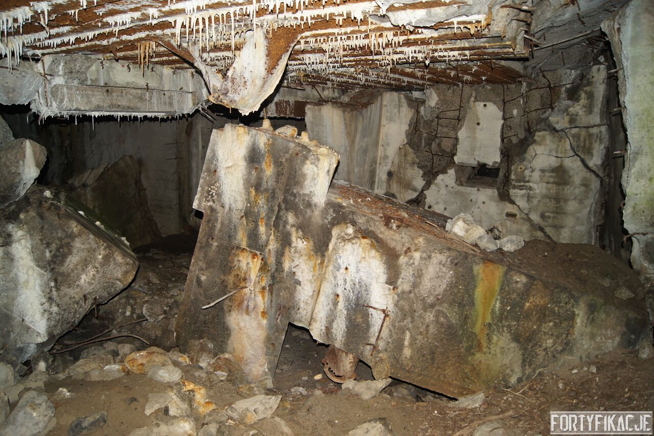 Wejdźmy na górną kondygnację. Tu poczynione zostały największe zniszczenia. Część pomieszczeń pozbawionych jest stropu, a ściany schronu poprzemieszczane. Największym zniszczeniom uległy izby bojowe, szyby kopuł, izba dowódcy oraz maszynownia. Kilka pomieszczeń górnej kondygnacji przetrwała jednak w jako takim stanie. Na wyróżnienie zasługuje m.in. izba łączności, blok wejściowy z dołami-pułapkami, nad którymi wisiały opuszczane drzwi 99P9 oraz kazamata z płytą pancerną 6P7. Był to pancerz o niebagatelnej grubości 20cm. W Pz. W. 712 została ona wycięta palnikami na tyle "delikatnie", że izba przetrwała, a w betonie widoczne są elementy mocowania płyty.