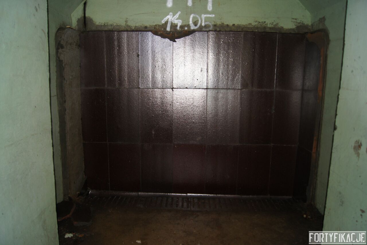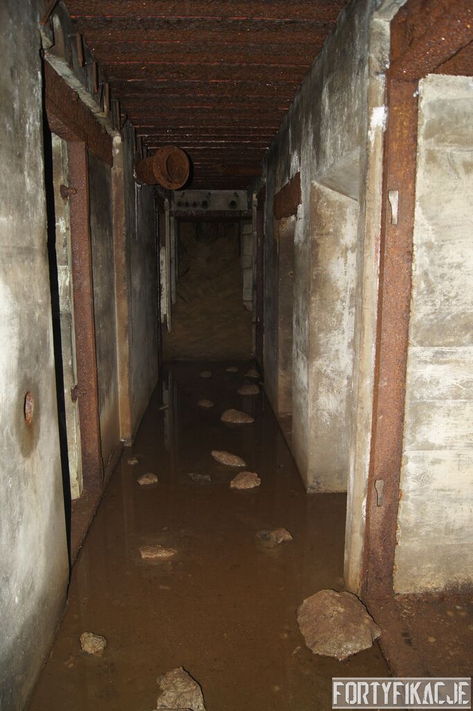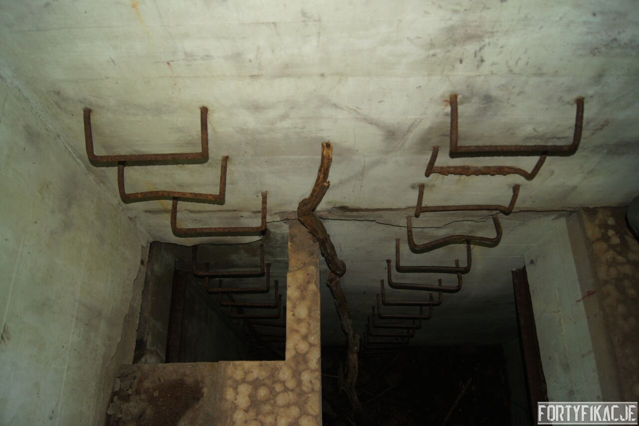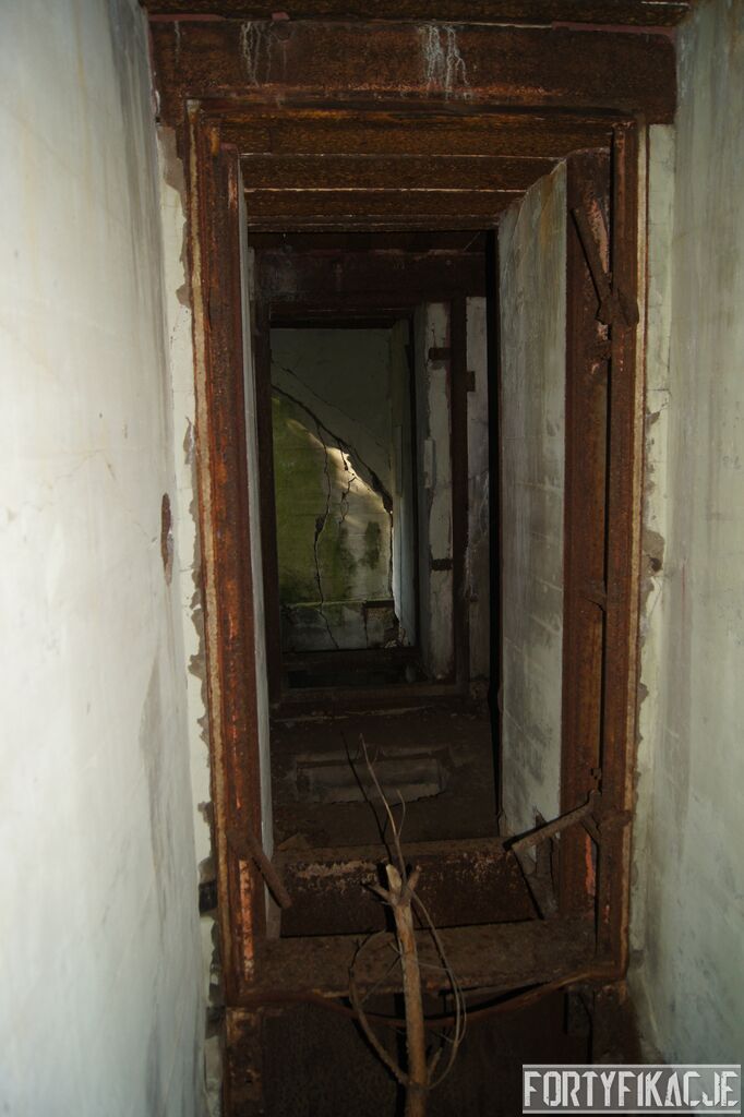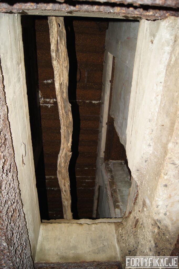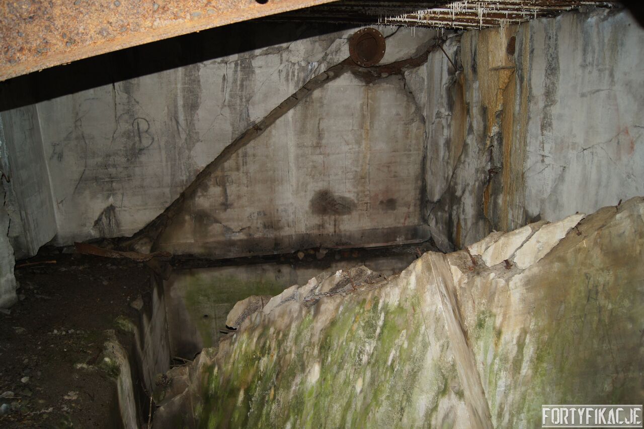 Wejdźmy na górną kondygnację. Tu poczynione zostały największe zniszczenia. Część pomieszczeń pozbawionych jest stropu, a ściany schronu poprzemieszczane. Największym zniszczeniom uległy izby bojowe, szyby kopuł, izba dowódcy oraz maszynownia. Kilka pomieszczeń górnej kondygnacji przetrwała jednak w jako takim stanie. Na wyróżnienie zasługuje m.in. izba łączności, blok wejściowy z dołami-pułapkami, nad którymi wisiały opuszczane drzwi 99P9 oraz kazamata z płytą pancerną 6P7. Był to pancerz o niebagatelnej grubości 20cm. W Pz. W. 712 została ona wycięta palnikami na tyle "delikatnie", że izba przetrwała, a w betonie widoczne są elementy mocowania płyty.