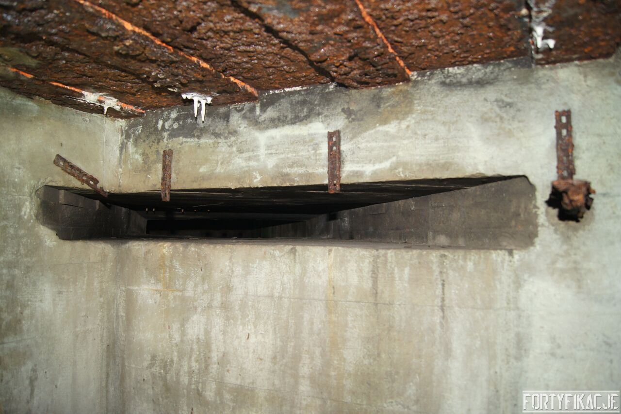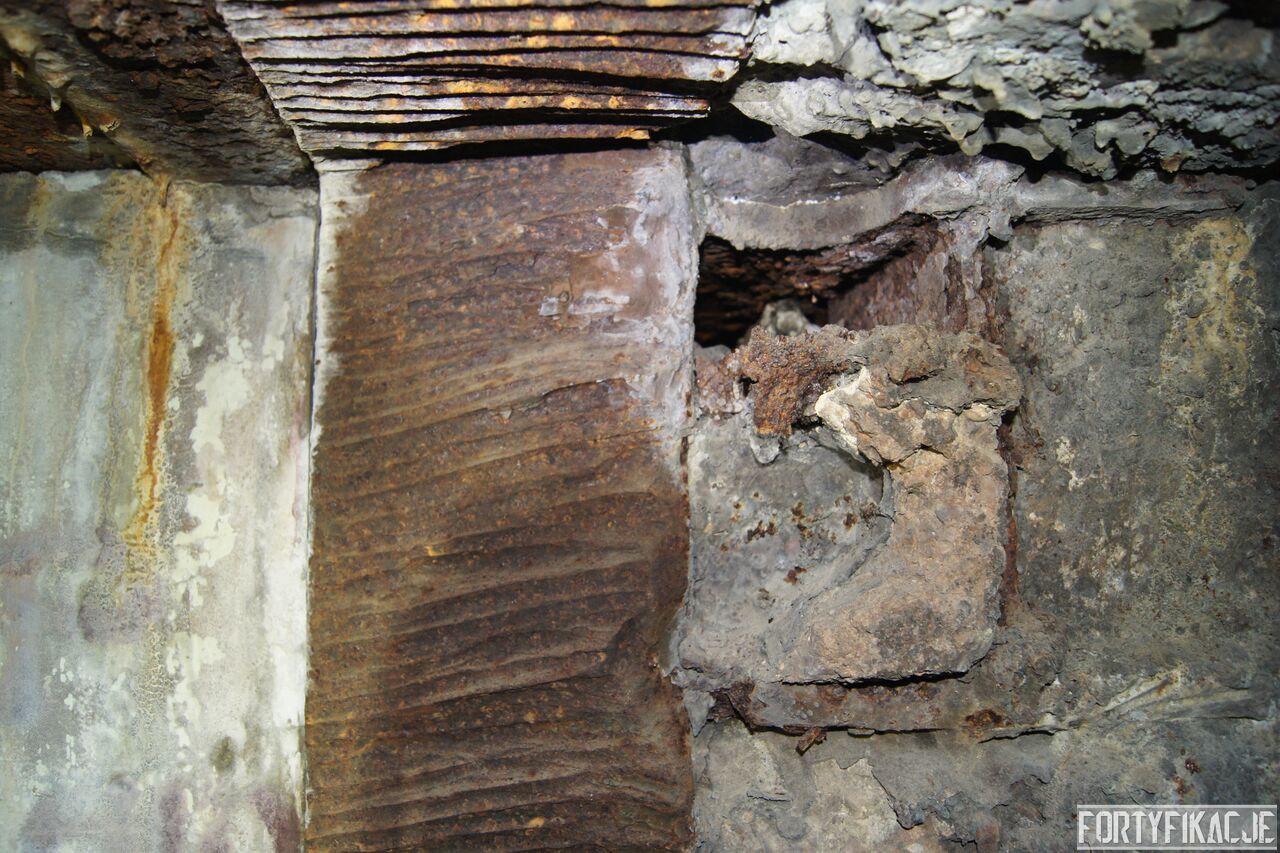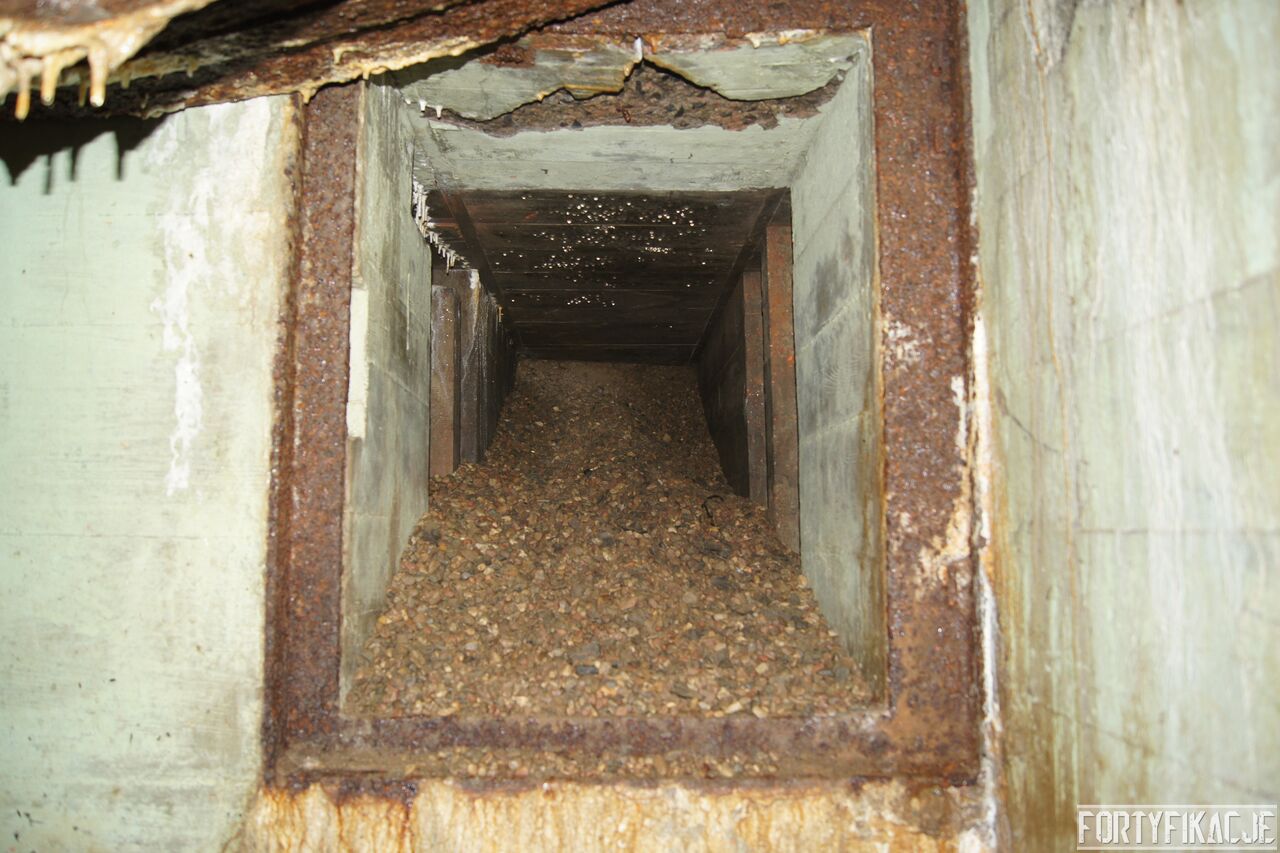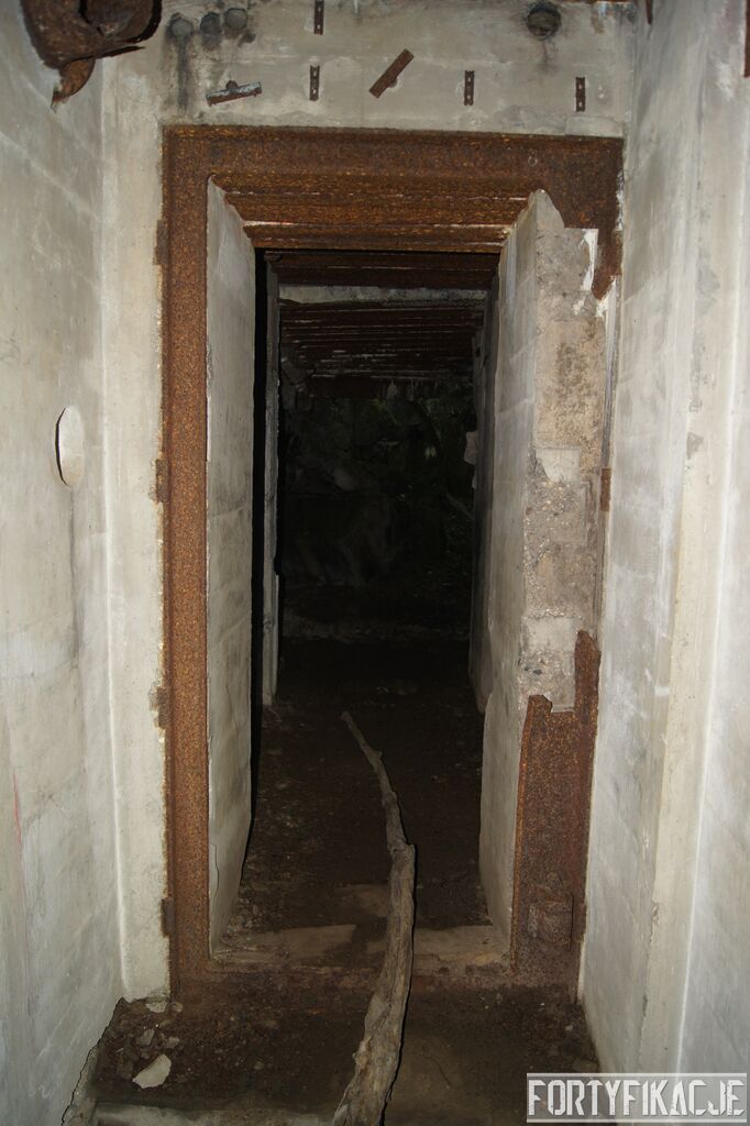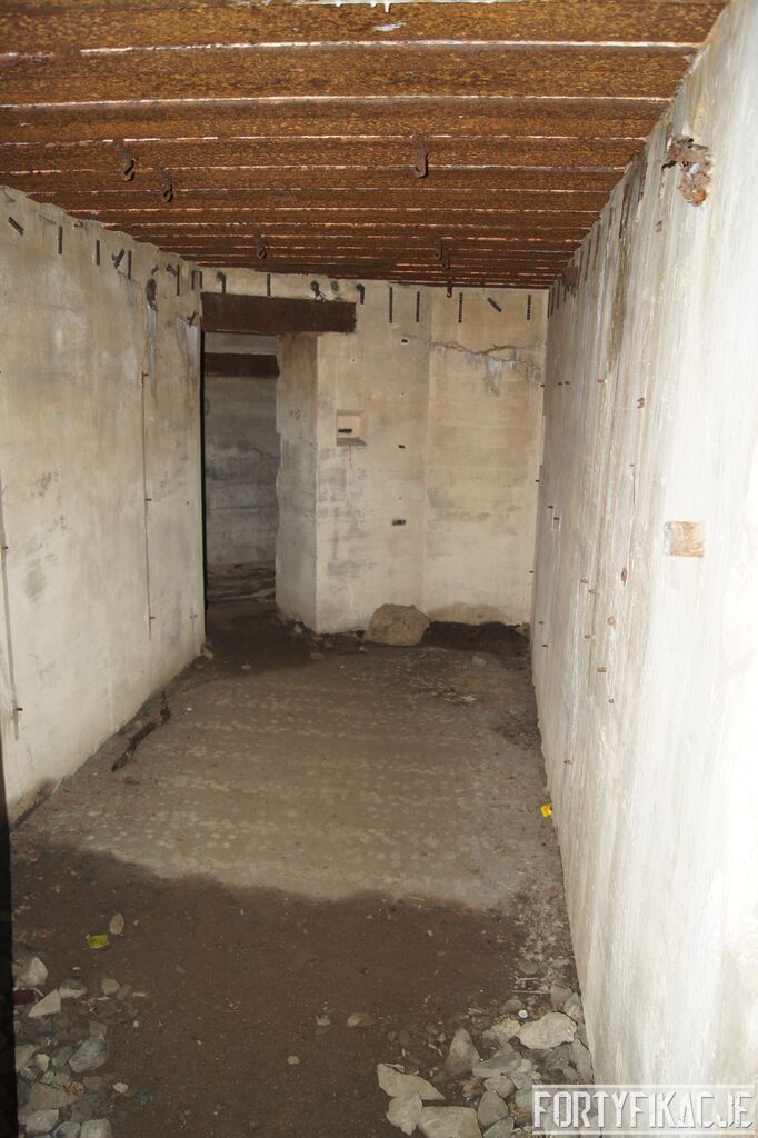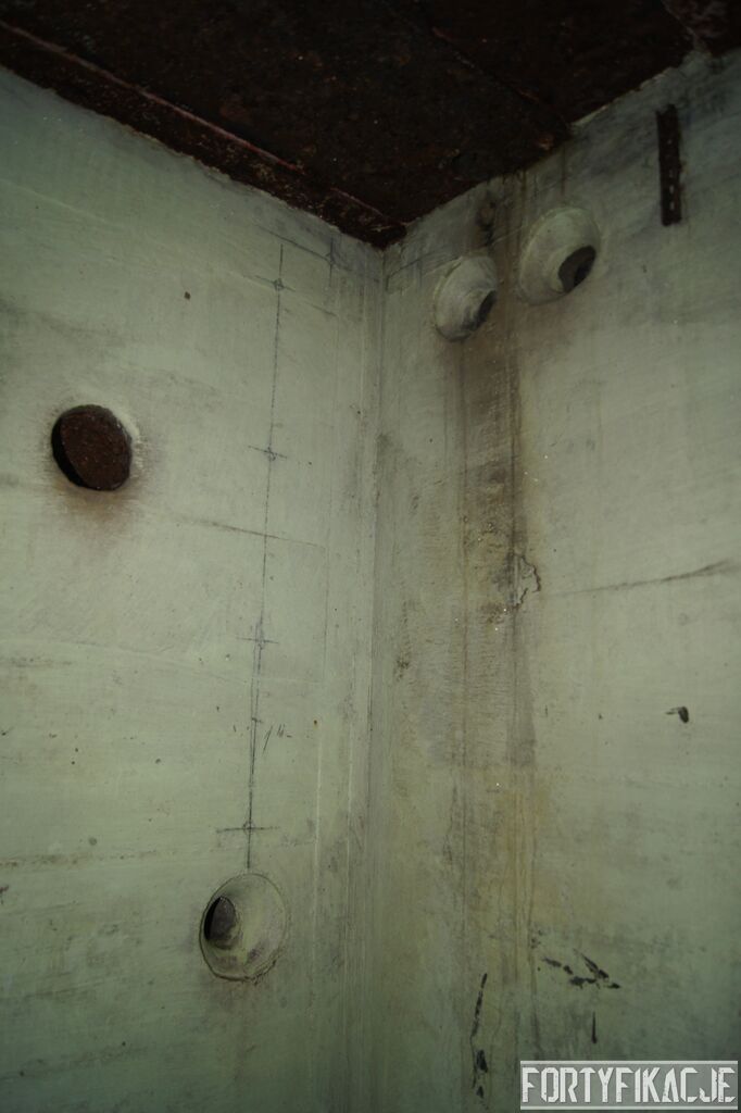 Wejdźmy na górną kondygnację. Tu poczynione zostały największe zniszczenia. Część pomieszczeń pozbawionych jest stropu, a ściany schronu poprzemieszczane. Największym zniszczeniom uległy izby bojowe, szyby kopuł, izba dowódcy oraz maszynownia. Kilka pomieszczeń górnej kondygnacji przetrwała jednak w jako takim stanie. Na wyróżnienie zasługuje m.in. izba łączności, blok wejściowy z dołami-pułapkami, nad którymi wisiały opuszczane drzwi 99P9 oraz kazamata z płytą pancerną 6P7. Był to pancerz o niebagatelnej grubości 20cm. W Pz. W. 712 została ona wycięta palnikami na tyle "delikatnie", że izba przetrwała, a w betonie widoczne są elementy mocowania płyty.