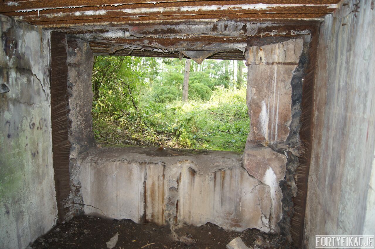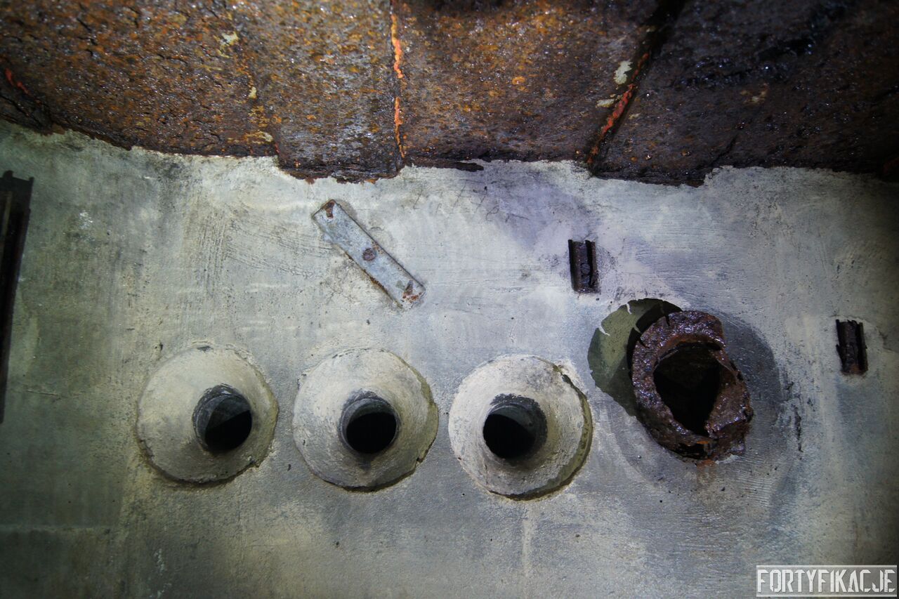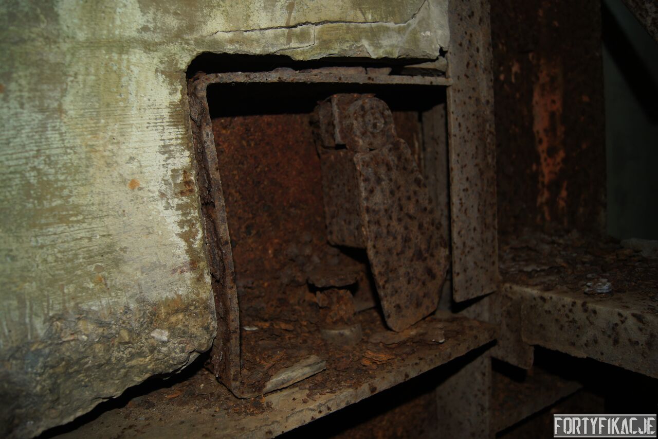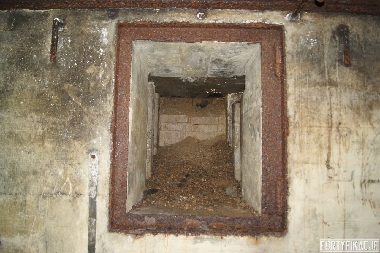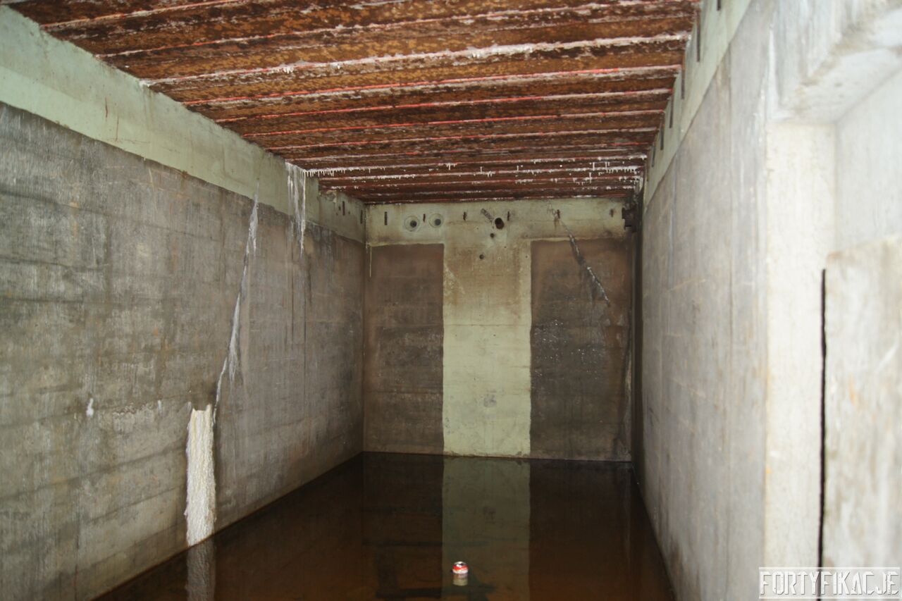 Wejdźmy na górną kondygnację. Tu poczynione zostały największe zniszczenia. Część pomieszczeń pozbawionych jest stropu, a ściany schronu poprzemieszczane. Największym zniszczeniom uległy izby bojowe, szyby kopuł, izba dowódcy oraz maszynownia. Kilka pomieszczeń górnej kondygnacji przetrwała jednak w jako takim stanie. Na wyróżnienie zasługuje m.in. izba łączności, blok wejściowy z dołami-pułapkami, nad którymi wisiały opuszczane drzwi 99P9 oraz kazamata z płytą pancerną 6P7. Był to pancerz o niebagatelnej grubości 20cm. W Pz. W. 712 została ona wycięta palnikami na tyle "delikatnie", że izba przetrwała, a w betonie widoczne są elementy mocowania płyty.