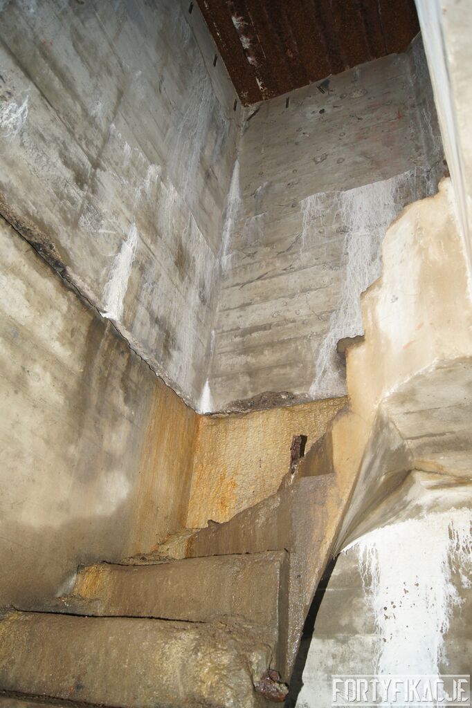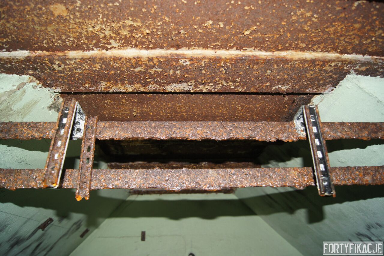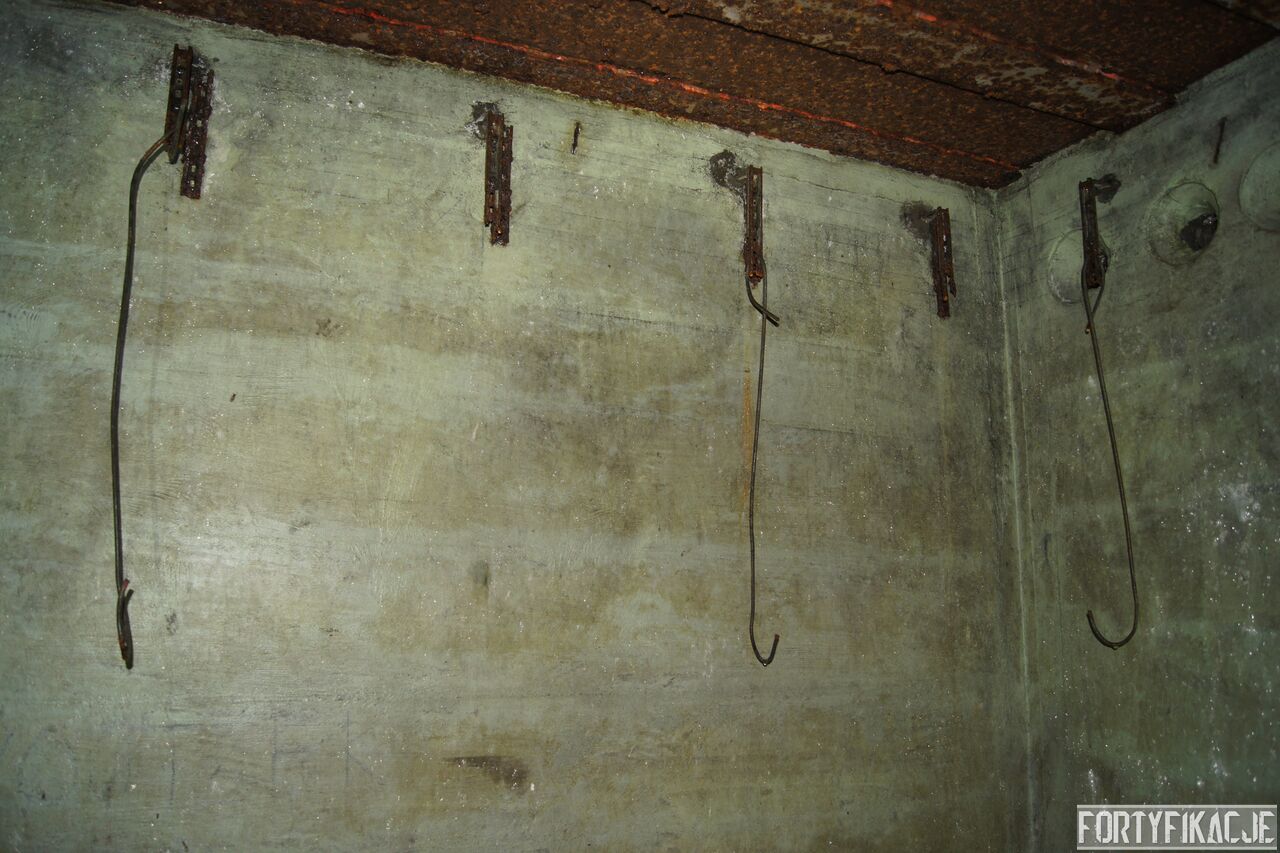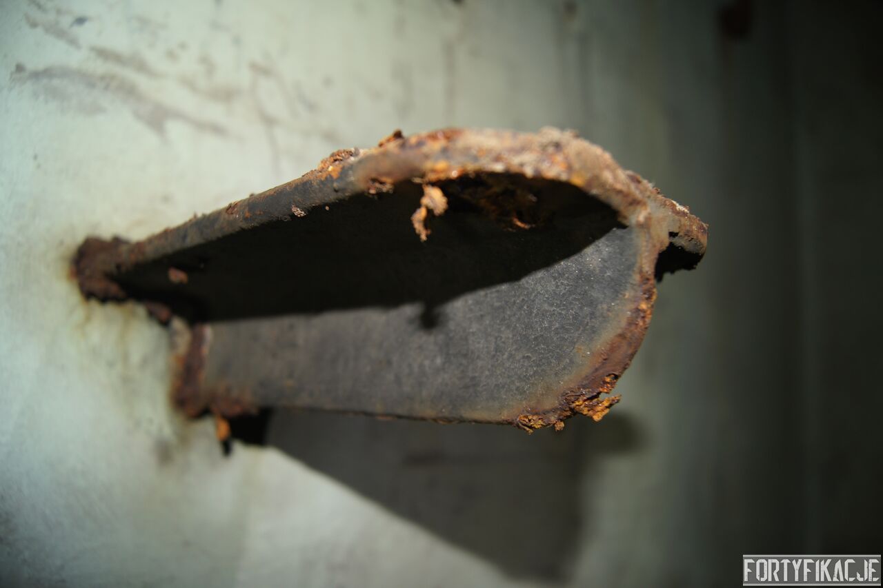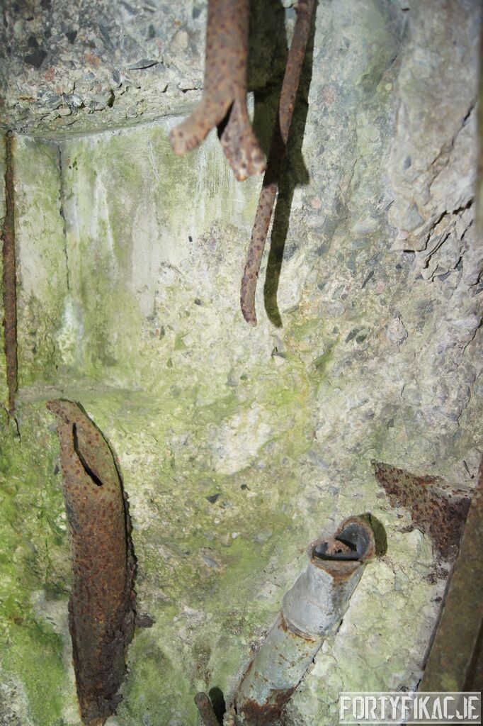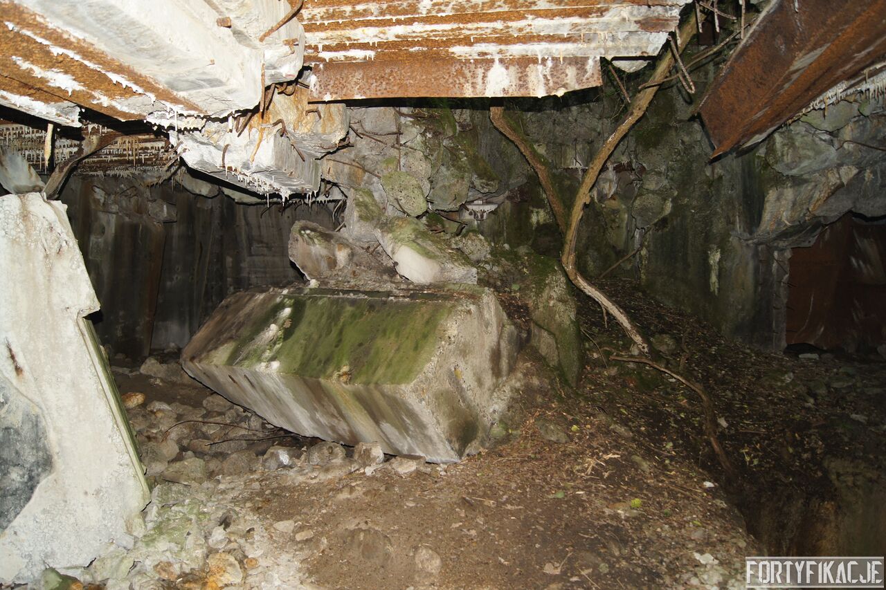 Wejdźmy na górną kondygnację. Tu poczynione zostały największe zniszczenia. Część pomieszczeń pozbawionych jest stropu, a ściany schronu poprzemieszczane. Największym zniszczeniom uległy izby bojowe, szyby kopuł, izba dowódcy oraz maszynownia. Kilka pomieszczeń górnej kondygnacji przetrwała jednak w jako takim stanie. Na wyróżnienie zasługuje m.in. izba łączności, blok wejściowy z dołami-pułapkami, nad którymi wisiały opuszczane drzwi 99P9 oraz kazamata z płytą pancerną 6P7. Był to pancerz o niebagatelnej grubości 20cm. W Pz. W. 712 została ona wycięta palnikami na tyle "delikatnie", że izba przetrwała, a w betonie widoczne są elementy mocowania płyty.
