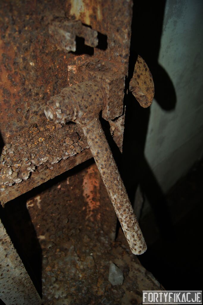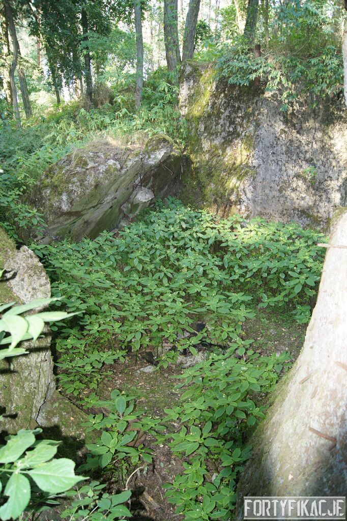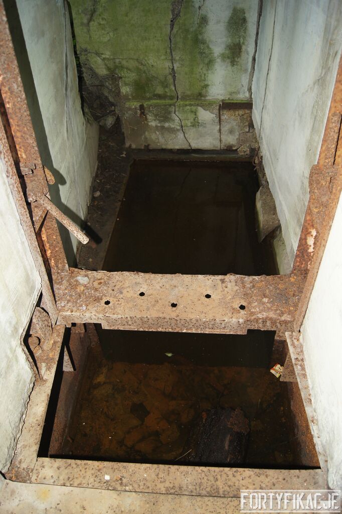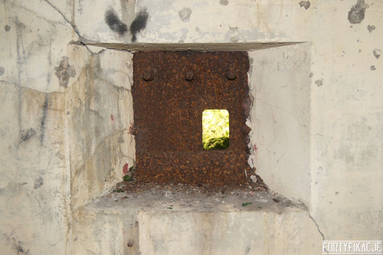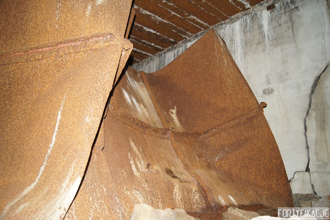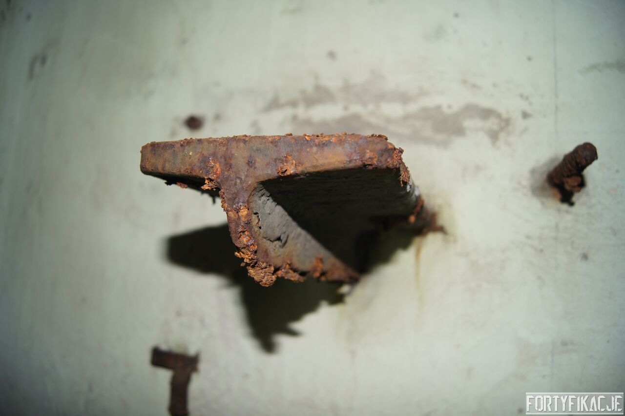 Wejdźmy na górną kondygnację. Tu poczynione zostały największe zniszczenia. Część pomieszczeń pozbawionych jest stropu, a ściany schronu poprzemieszczane. Największym zniszczeniom uległy izby bojowe, szyby kopuł, izba dowódcy oraz maszynownia. Kilka pomieszczeń górnej kondygnacji przetrwała jednak w jako takim stanie. Na wyróżnienie zasługuje m.in. izba łączności, blok wejściowy z dołami-pułapkami, nad którymi wisiały opuszczane drzwi 99P9 oraz kazamata z płytą pancerną 6P7. Był to pancerz o niebagatelnej grubości 20cm. W Pz. W. 712 została ona wycięta palnikami na tyle "delikatnie", że izba przetrwała, a w betonie widoczne są elementy mocowania płyty.