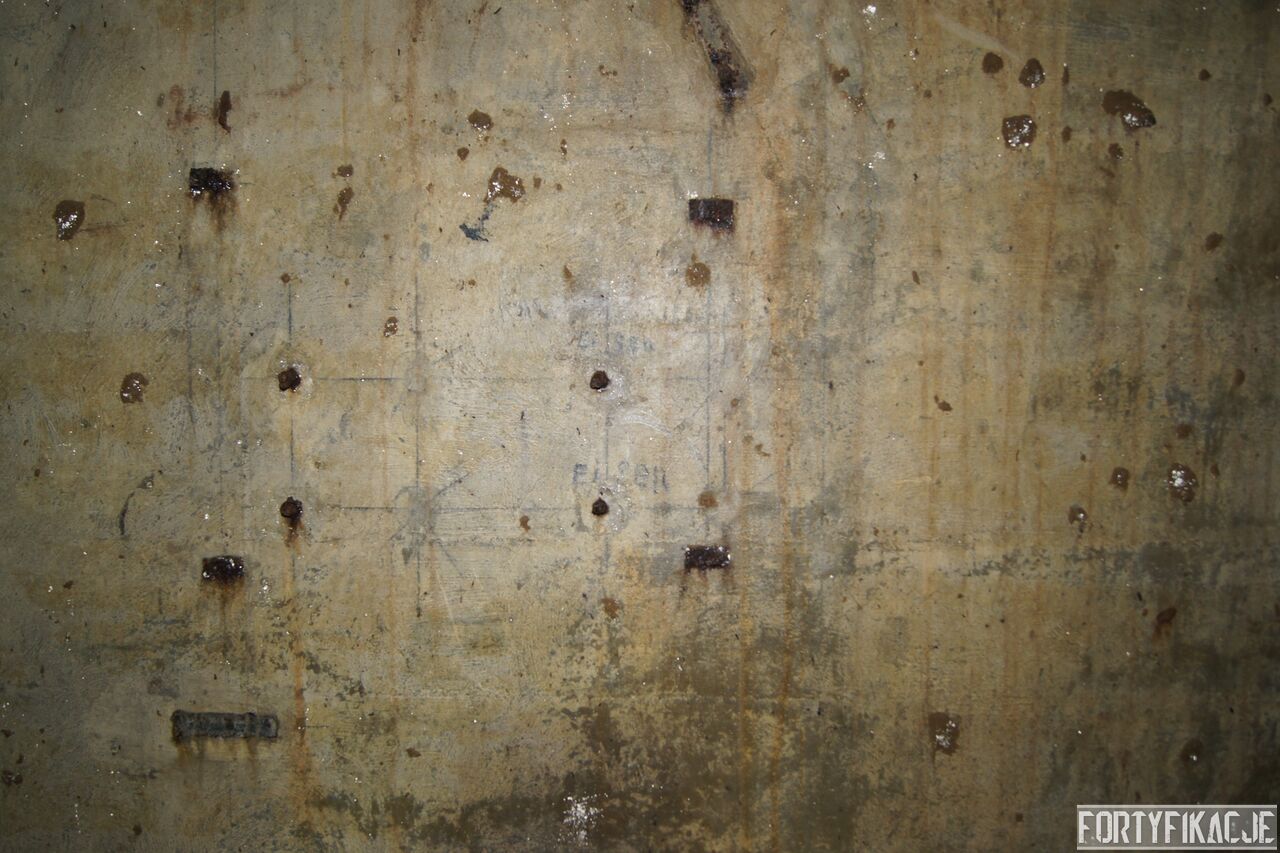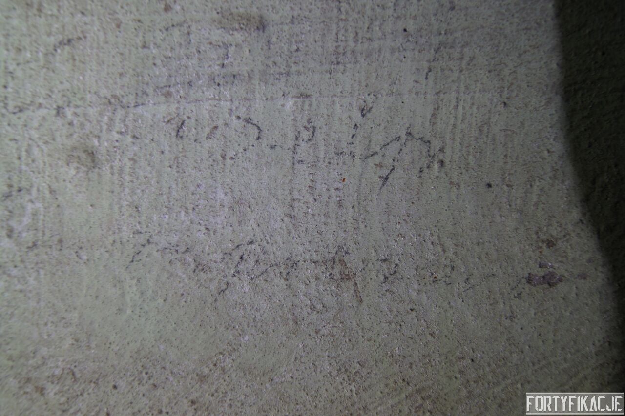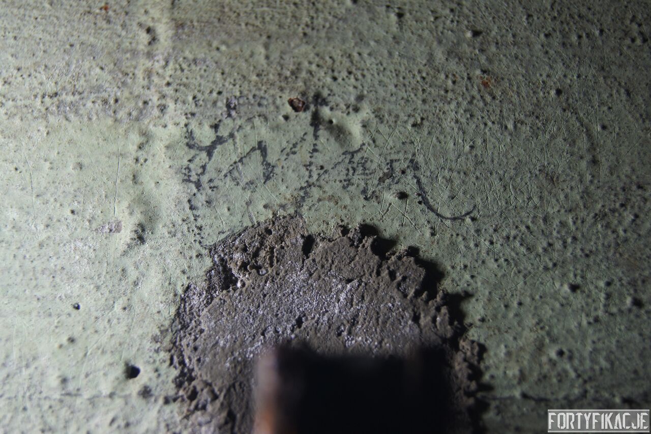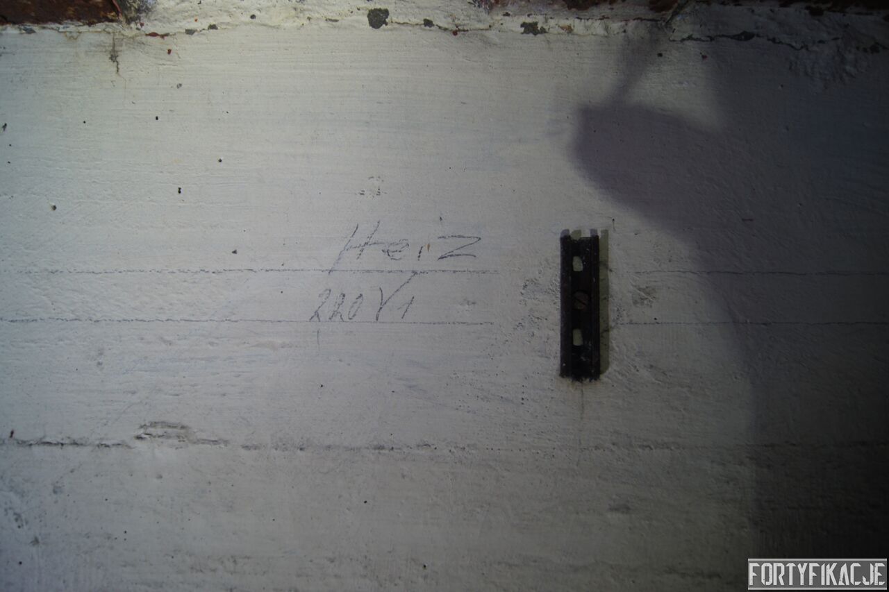 Żeby nie było standardowo i nie popaść w rutynę, wchodząc do środka zaczniemy wyjątkowo od dolnej kondygnacji i jednej z najcenniejszych - wg mnie - rzeczy. Pod pewnymi względami Pz. W. 712 wygląda na nieukończony. Wskazuje na to nie tylko późna data wzniesienia, kiedy to budowę FFOWB już wyciszano, ale również sam wygląd ścian, szczególnie dolnej kondygnacji. Zachowały się na nich, czynione ołówkiem, uwagi i schematy technika, który prawdopodobnie miał montować instalację elektryczną i/lub telefoniczną. Na ścianach widzimy narysowane linie, informacje dotyczące napięcia, adnotacje lub bardziej rozbudowane komentarze. Ponadto zaznaczone są miejsca wierceń. Jest to niebywała gratka dla każdego miłośnika MRU! Niniejsze ryciny znajdują się na dolnej kondygnacji w większości pomieszczeń.