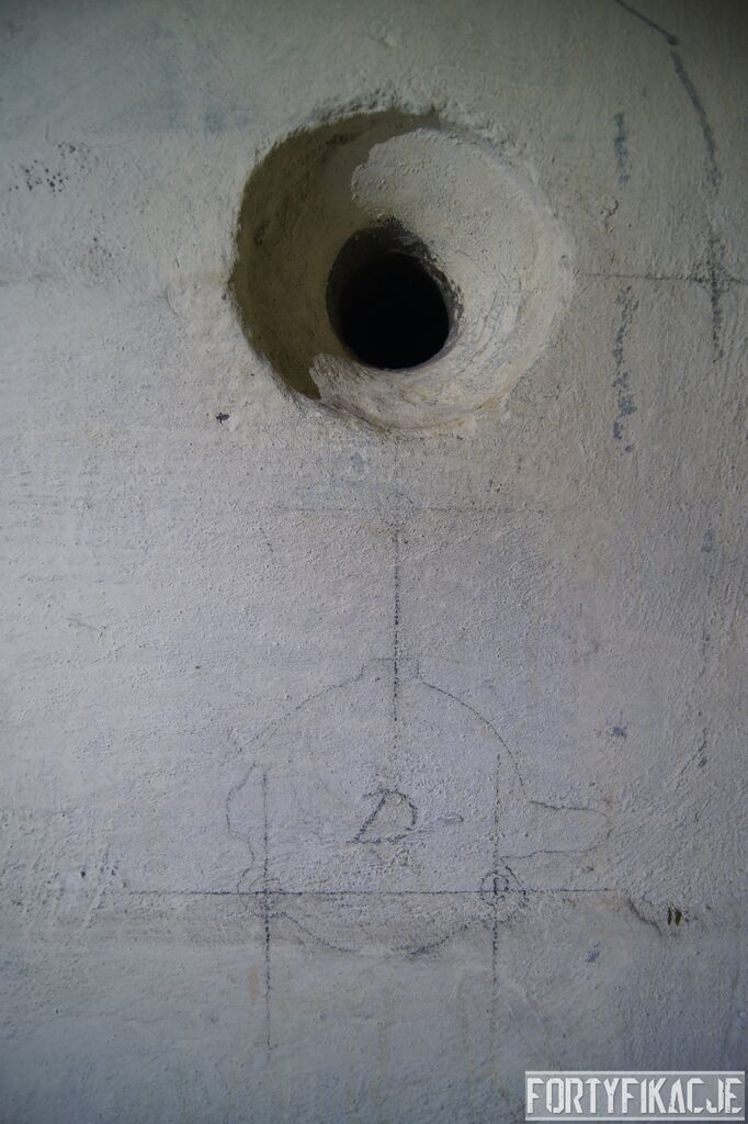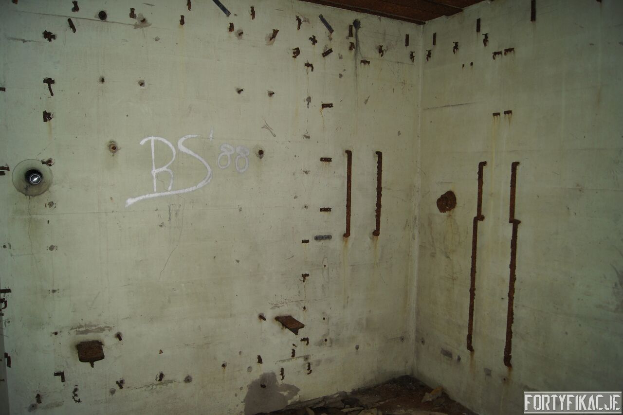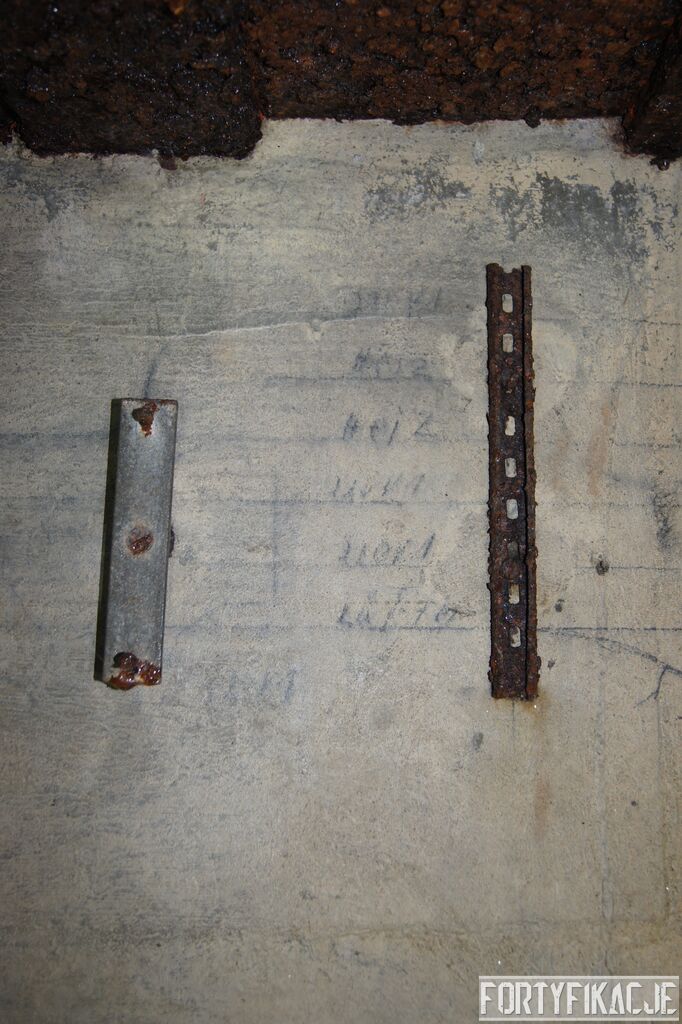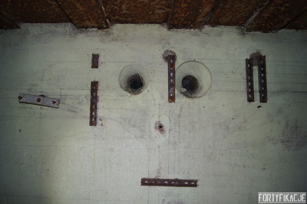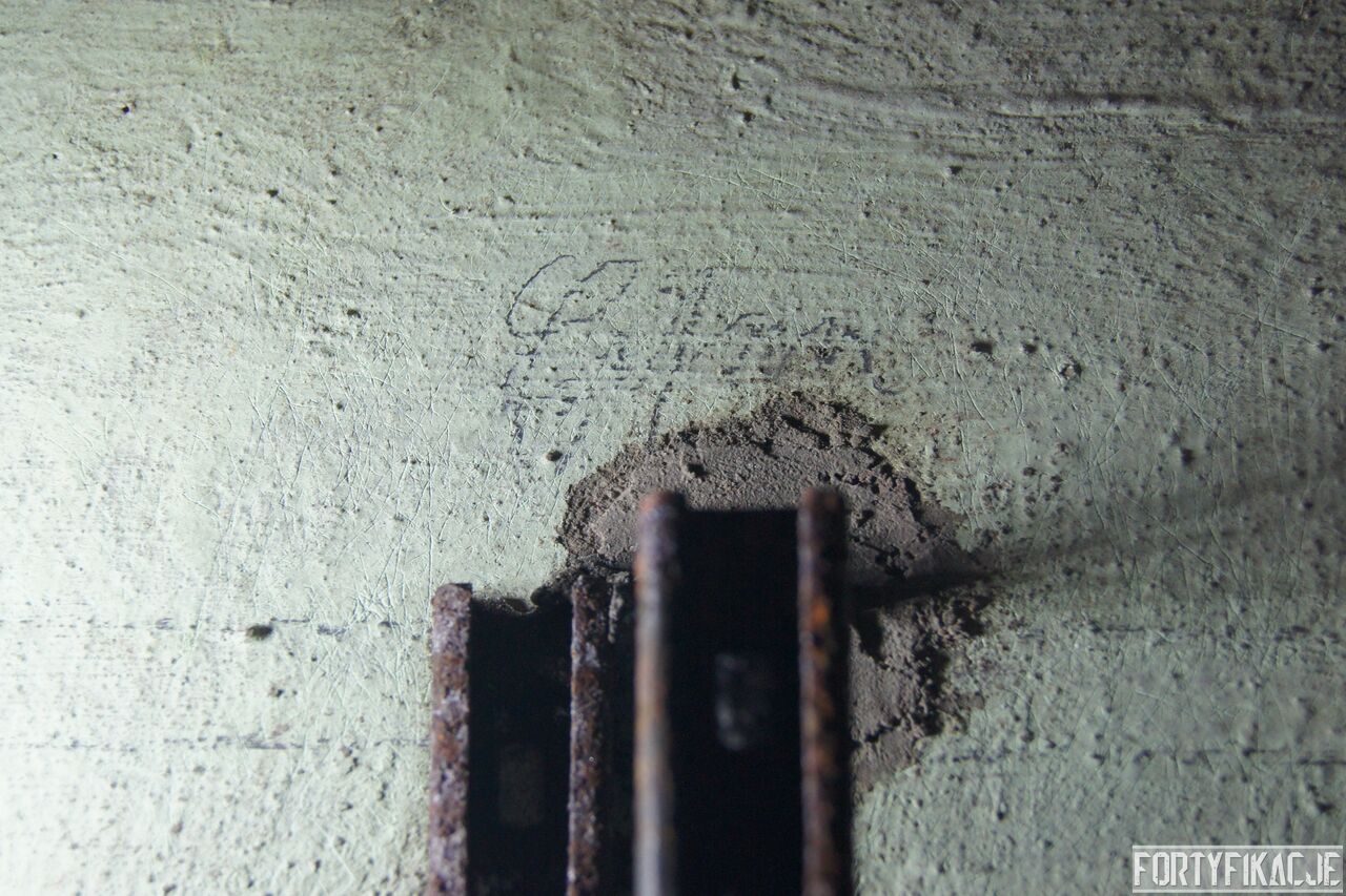 Żeby nie było standardowo i nie popaść w rutynę, wchodząc do środka zaczniemy wyjątkowo od dolnej kondygnacji i jednej z najcenniejszych - wg mnie - rzeczy. Pod pewnymi względami Pz. W. 712 wygląda na nieukończony. Wskazuje na to nie tylko późna data wzniesienia, kiedy to budowę FFOWB już wyciszano, ale również sam wygląd ścian, szczególnie dolnej kondygnacji. Zachowały się na nich, czynione ołówkiem, uwagi i schematy technika, który prawdopodobnie miał montować instalację elektryczną i/lub telefoniczną. Na ścianach widzimy narysowane linie, informacje dotyczące napięcia, adnotacje lub bardziej rozbudowane komentarze. Ponadto zaznaczone są miejsca wierceń. Jest to niebywała gratka dla każdego miłośnika MRU! Niniejsze ryciny znajdują się na dolnej kondygnacji w większości pomieszczeń.