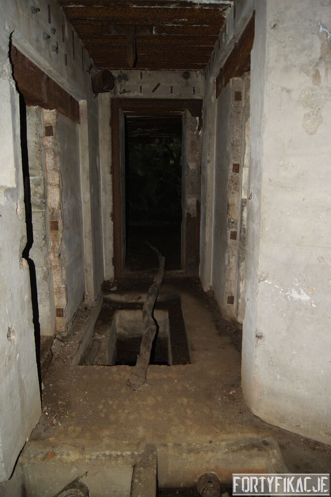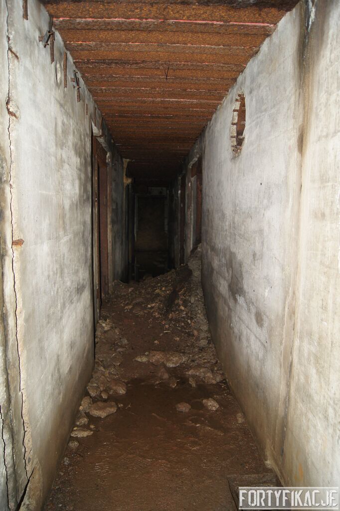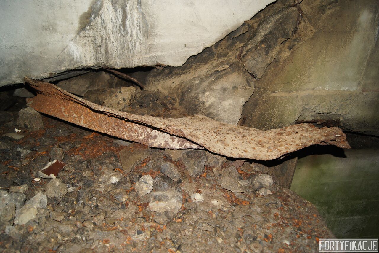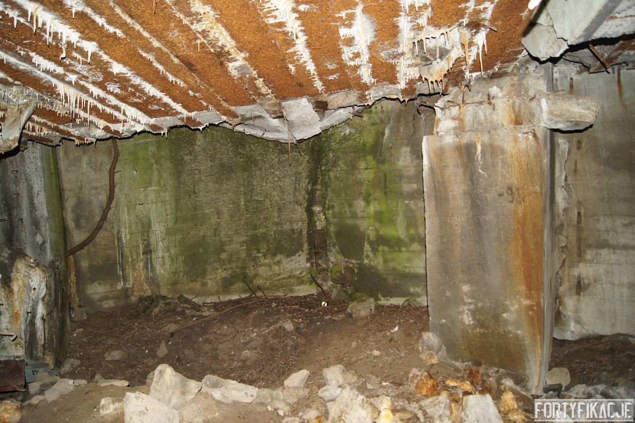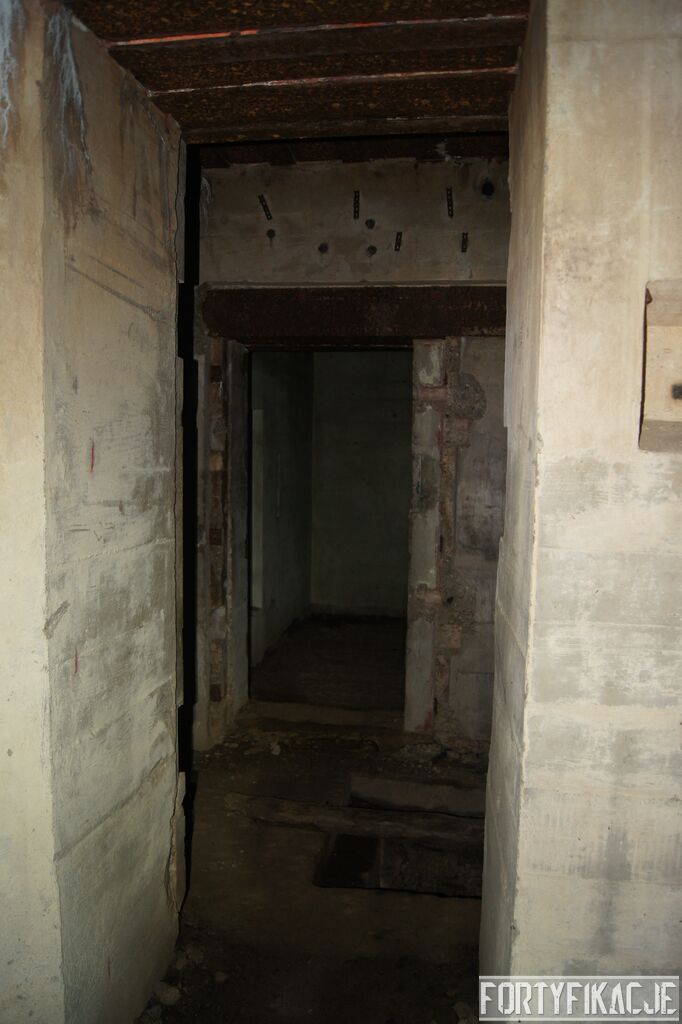 Wejdźmy na górną kondygnację. Tu poczynione zostały największe zniszczenia. Część pomieszczeń pozbawionych jest stropu, a ściany schronu poprzemieszczane. Największym zniszczeniom uległy izby bojowe, szyby kopuł, izba dowódcy oraz maszynownia. Kilka pomieszczeń górnej kondygnacji przetrwała jednak w jako takim stanie. Na wyróżnienie zasługuje m.in. izba łączności, blok wejściowy z dołami-pułapkami, nad którymi wisiały opuszczane drzwi 99P9 oraz kazamata z płytą pancerną 6P7. Był to pancerz o niebagatelnej grubości 20cm. W Pz. W. 712 została ona wycięta palnikami na tyle "delikatnie", że izba przetrwała, a w betonie widoczne są elementy mocowania płyty.
