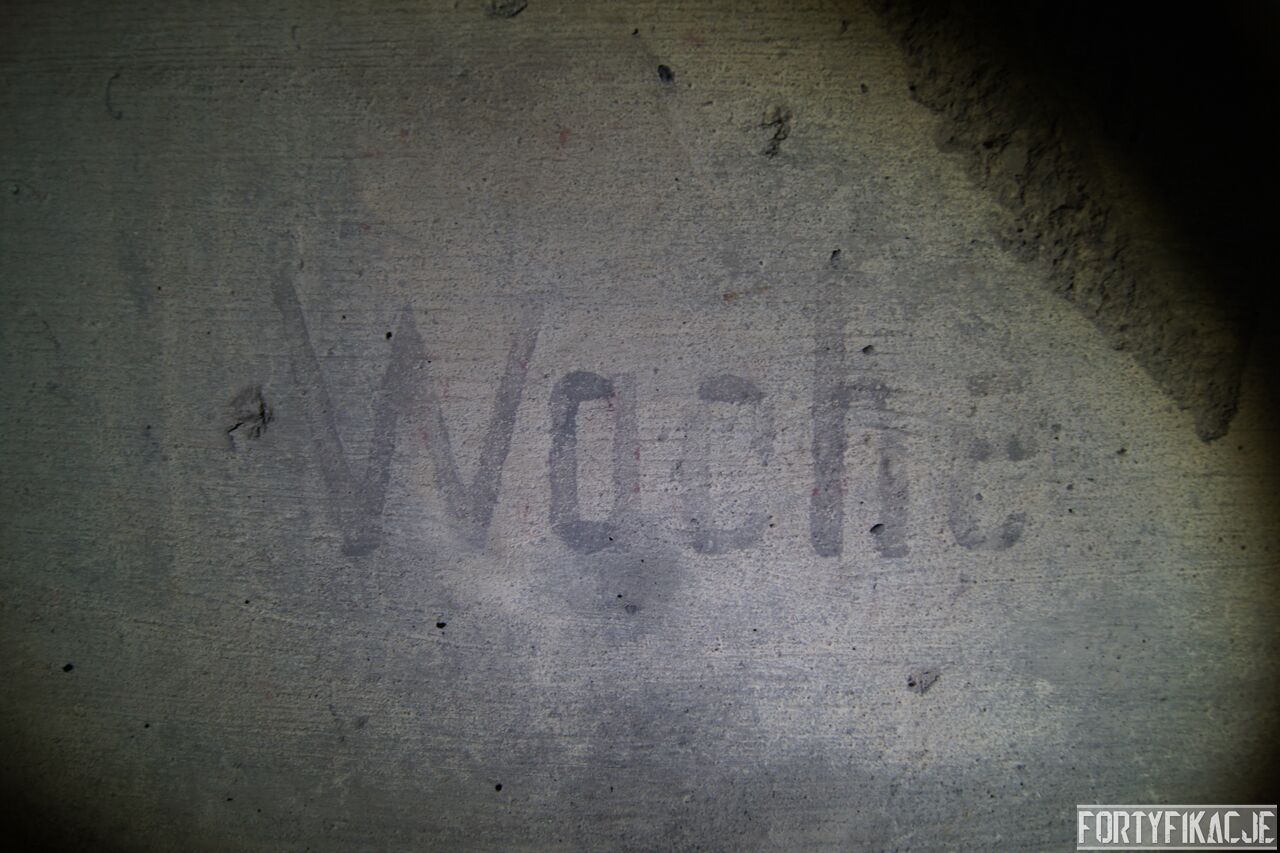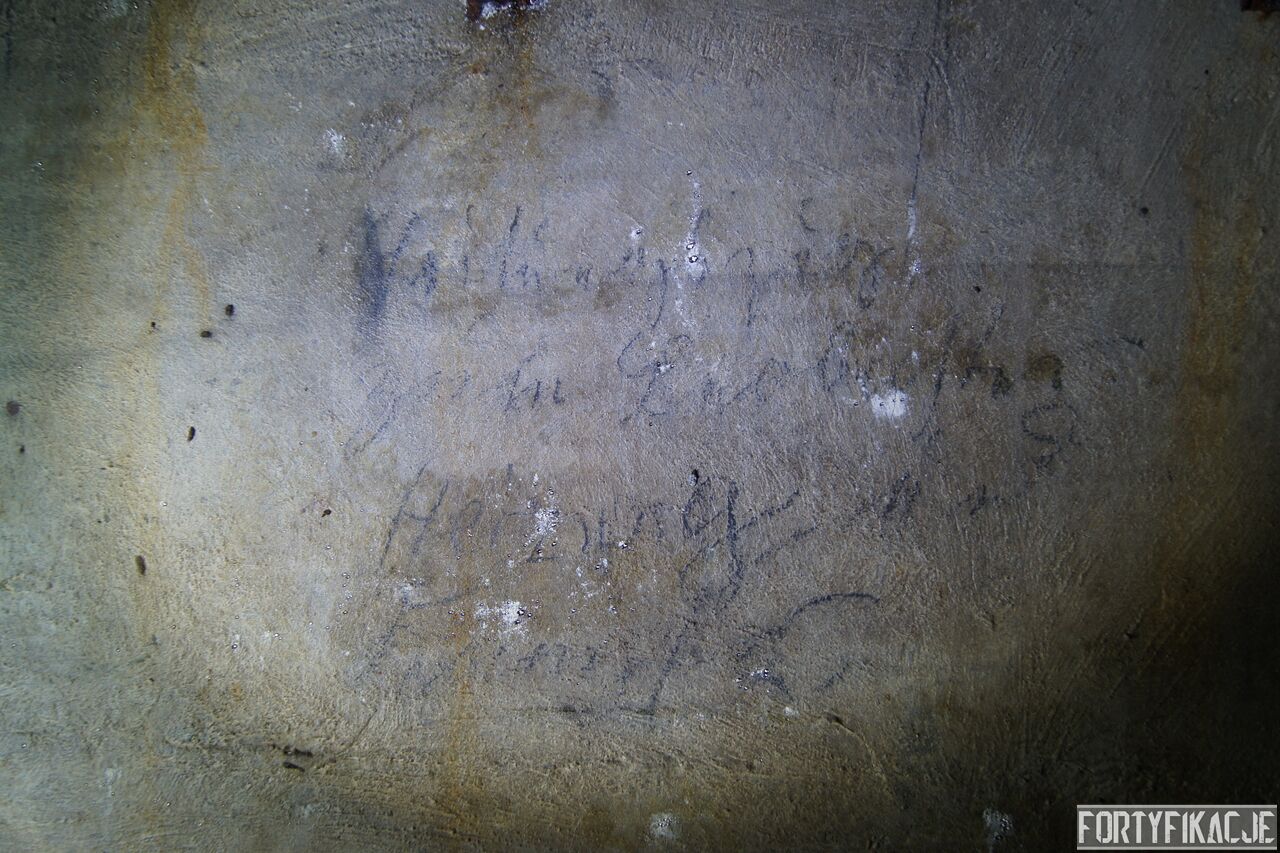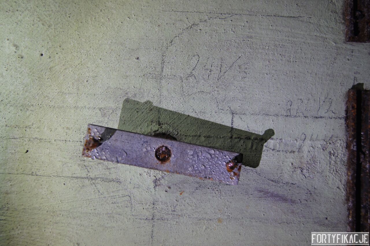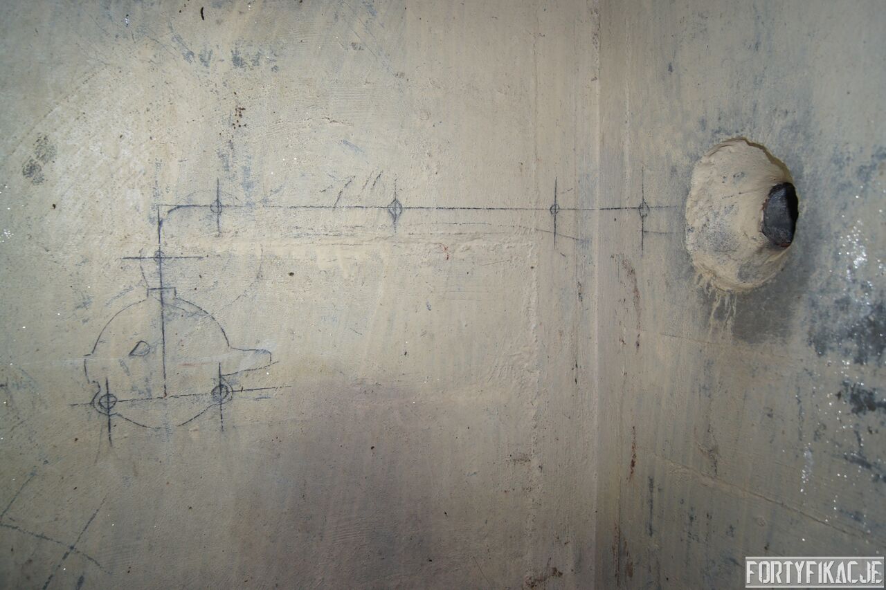 Żeby nie było standardowo i nie popaść w rutynę, wchodząc do środka zaczniemy wyjątkowo od dolnej kondygnacji i jednej z najcenniejszych - wg mnie - rzeczy. Pod pewnymi względami Pz. W. 712 wygląda na nieukończony. Wskazuje na to nie tylko późna data wzniesienia, kiedy to budowę FFOWB już wyciszano, ale również sam wygląd ścian, szczególnie dolnej kondygnacji. Zachowały się na nich, czynione ołówkiem, uwagi i schematy technika, który prawdopodobnie miał montować instalację elektryczną i/lub telefoniczną. Na ścianach widzimy narysowane linie, informacje dotyczące napięcia, adnotacje lub bardziej rozbudowane komentarze. Ponadto zaznaczone są miejsca wierceń. Jest to niebywała gratka dla każdego miłośnika MRU! Niniejsze ryciny znajdują się na dolnej kondygnacji w większości pomieszczeń.