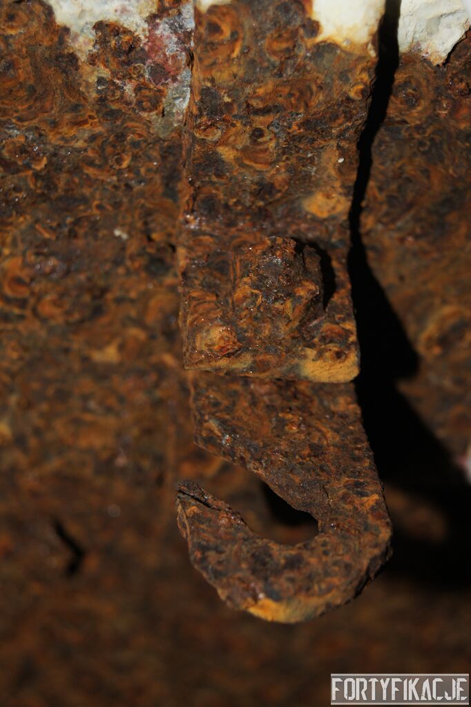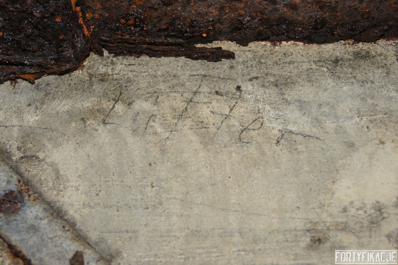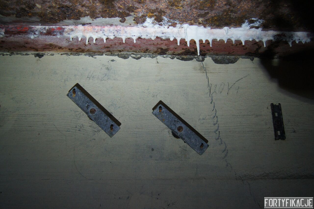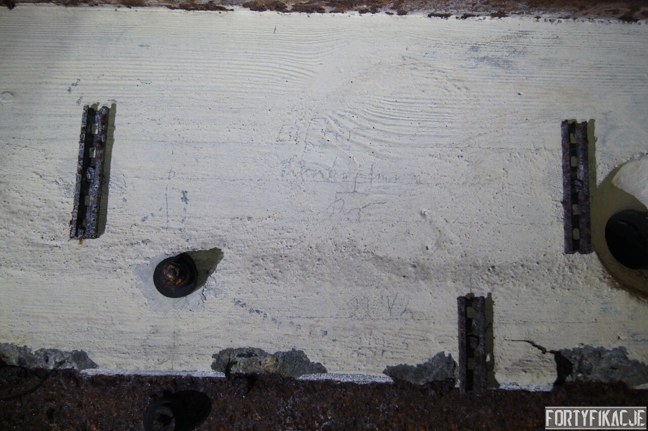 Żeby nie było standardowo i nie popaść w rutynę, wchodząc do środka zaczniemy wyjątkowo od dolnej kondygnacji i jednej z najcenniejszych - wg mnie - rzeczy. Pod pewnymi względami Pz. W. 712 wygląda na nieukończony. Wskazuje na to nie tylko późna data wzniesienia, kiedy to budowę FFOWB już wyciszano, ale również sam wygląd ścian, szczególnie dolnej kondygnacji. Zachowały się na nich, czynione ołówkiem, uwagi i schematy technika, który prawdopodobnie miał montować instalację elektryczną i/lub telefoniczną. Na ścianach widzimy narysowane linie, informacje dotyczące napięcia, adnotacje lub bardziej rozbudowane komentarze. Ponadto zaznaczone są miejsca wierceń. Jest to niebywała gratka dla każdego miłośnika MRU! Niniejsze ryciny znajdują się na dolnej kondygnacji w większości pomieszczeń.
