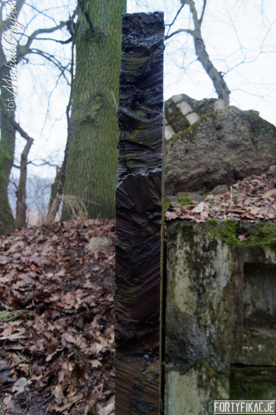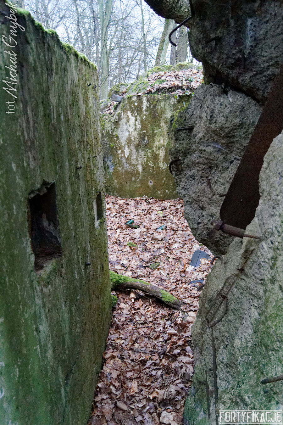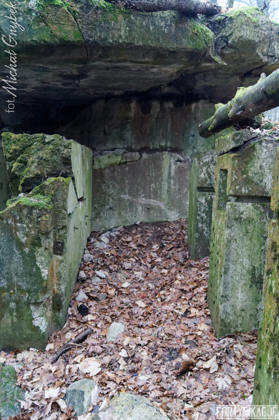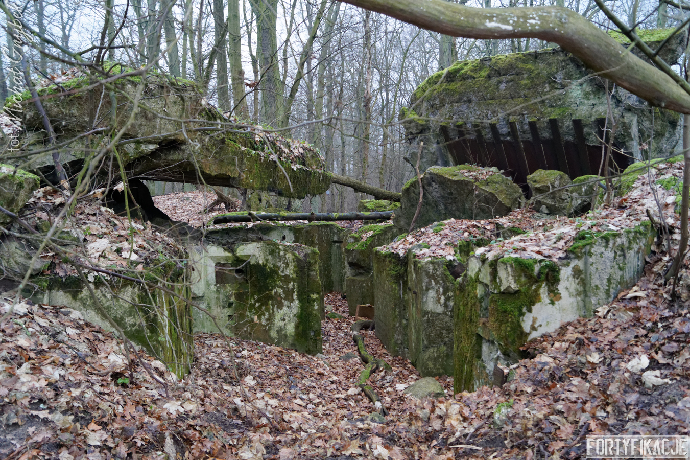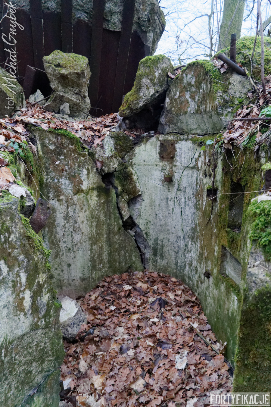 Praktycznie został całkowicie pozbawiony stropu, który rozerwany wybuchem łoży się w bliskiej okolicy obiektu. Więcej szczęścia miały ściany pionowe: wytrzymały napór energii ładunków wybuchowych, dzięki czemu obecnie schron stanowi intrygujący przekrój poziomy. Jest to tym bardziej cenne, że układ aż 5 pomieszczeń, z których się składał, był dość nietypowy, a z pewnością asymetryczny. Przede wszystkim obiekt spełniał kilka ról: posiadał dwie izby bojowe, w obu załoga chroniona była przez płyty stalowe 7P7 (ich pozostałości zachowały się); pomieszczenie obserwatora, zabezpieczone małą kopułą typu 9P7 (nie zachowała się) oraz - dla mnie najciekawszą, bo o fantazyjnym narysie - izbę załogi.