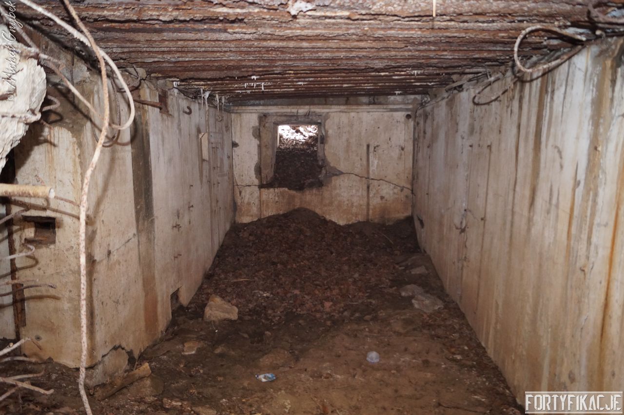 • izby bojowej, gdzie zachował się fragment płyty stalowej 7P7 (?) odciętej palnikiem równo z płaszczyzną przedpiersia; co ciekawe eksplozja odsłoniła elementy mocowania płyty stalowej do stropu (patrz: zdjęcia).