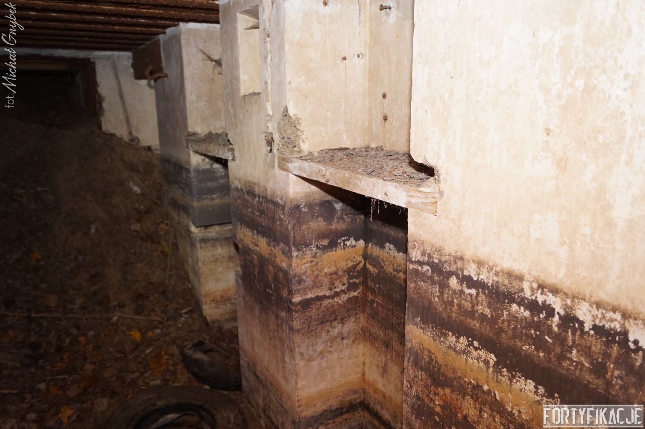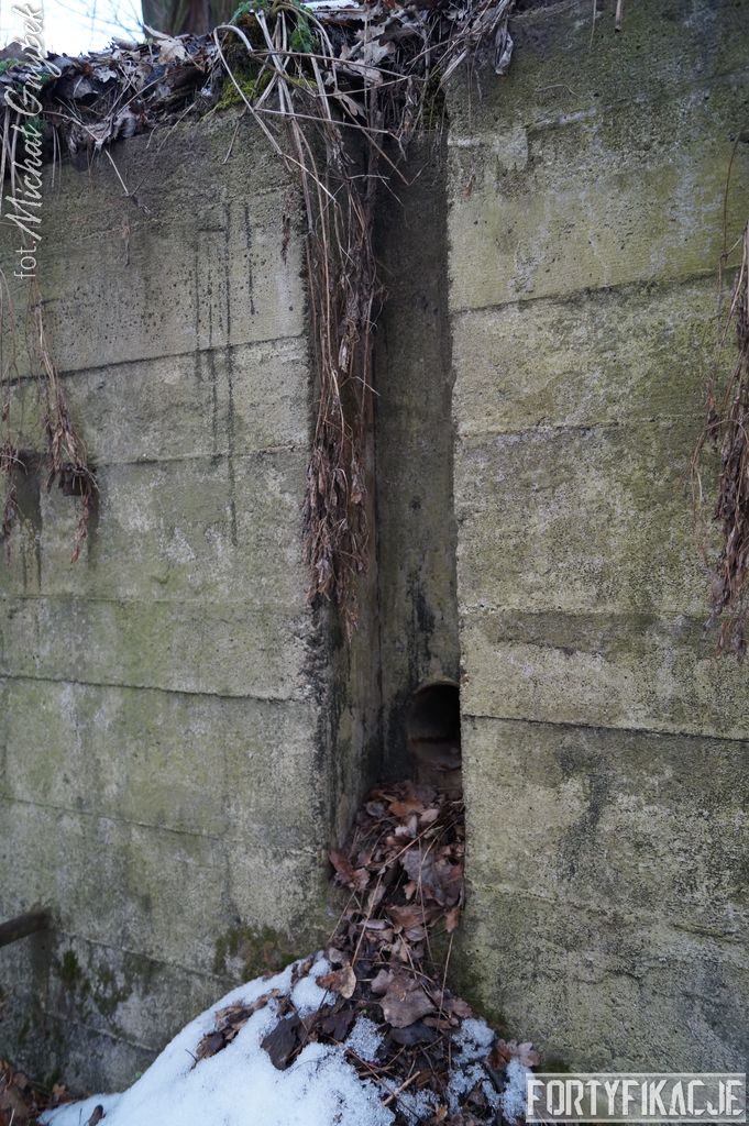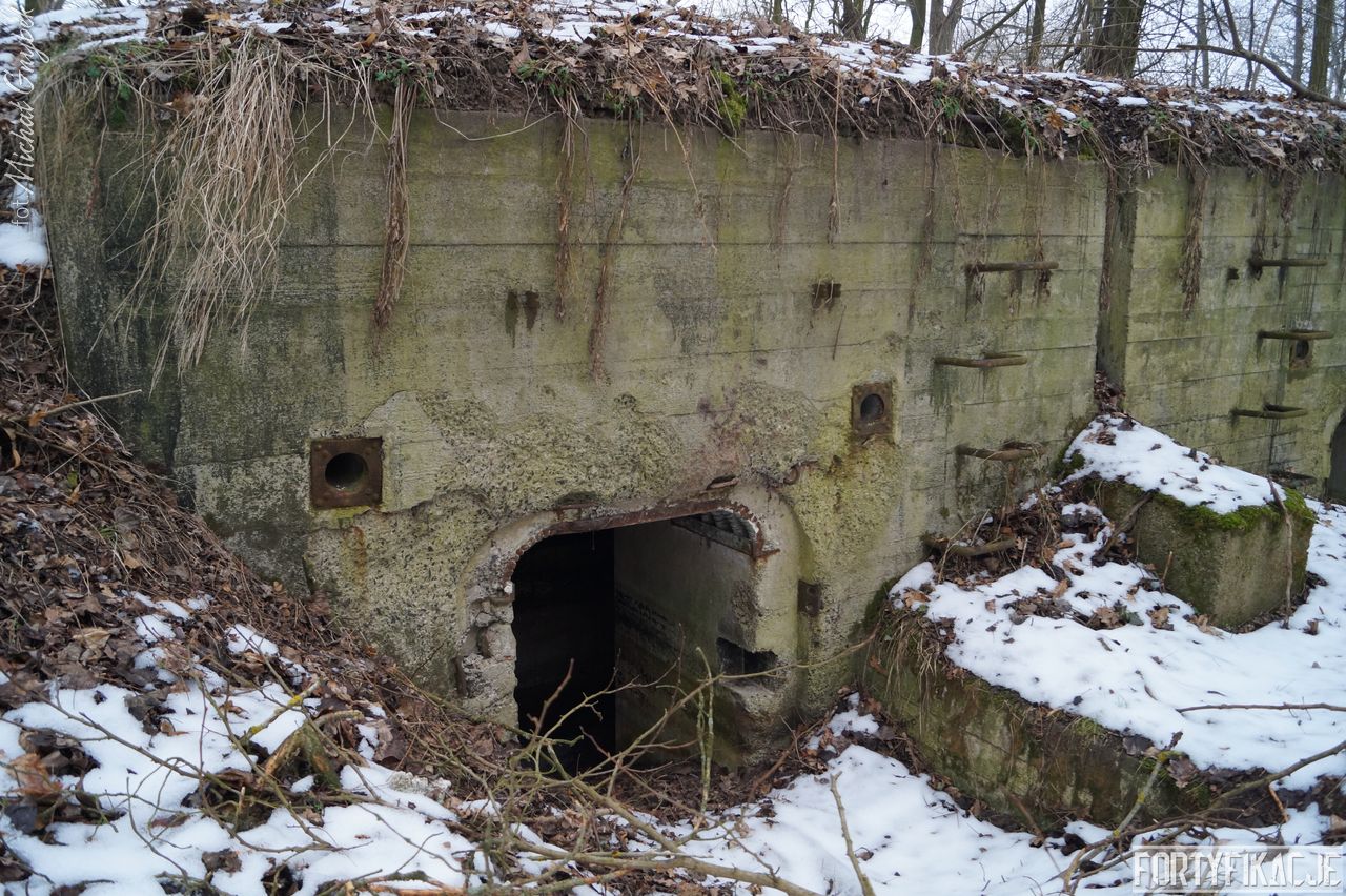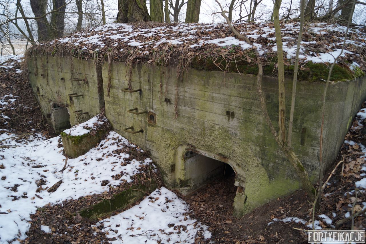 mógłby ktoś powiedzieć, ale kryje w sobie małą niespodziankę! Stand oczywiście zachowany jest bardzo dobrze. Położony w pobliżu brzegu Odry Stąd okresowo - nierzadko bardzo mocno - zalewany. Wzniesiony został w 1935r. I ten Unterstand był znakomicie skryty przed okiem przeciwnika. Zagłębiony w gruncie posiadał jedynie częściowo odsłoniętą elewację wejściową. Dziś niestety pozbawiony drzwi 14P7 wraz z ościeżnicami. Szczęśliwie zachowały się (styczeń 2017r.) stalowe klamry prowadzące na strop... Wejścia zabezpieczone zostały przed zalaniem dwiema schodniami.