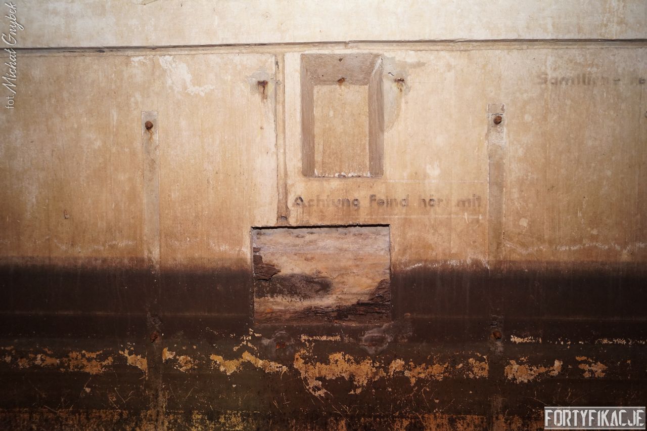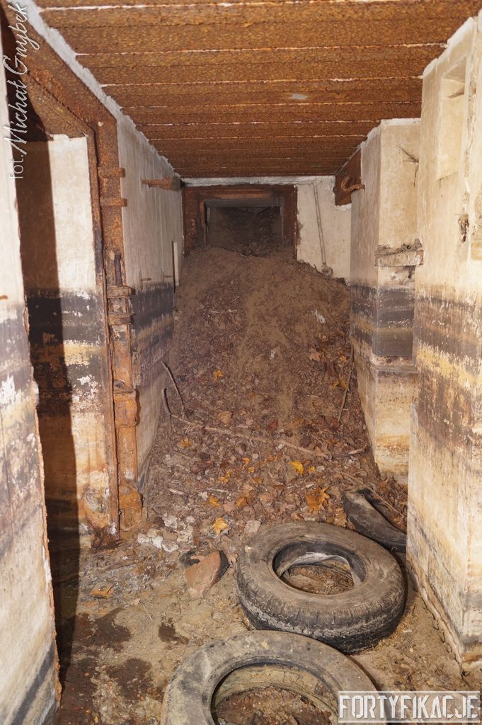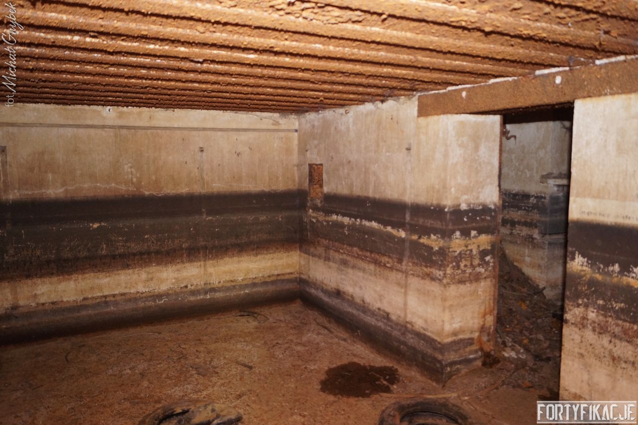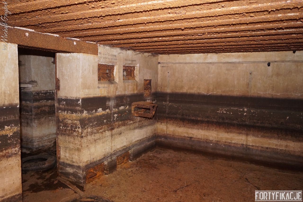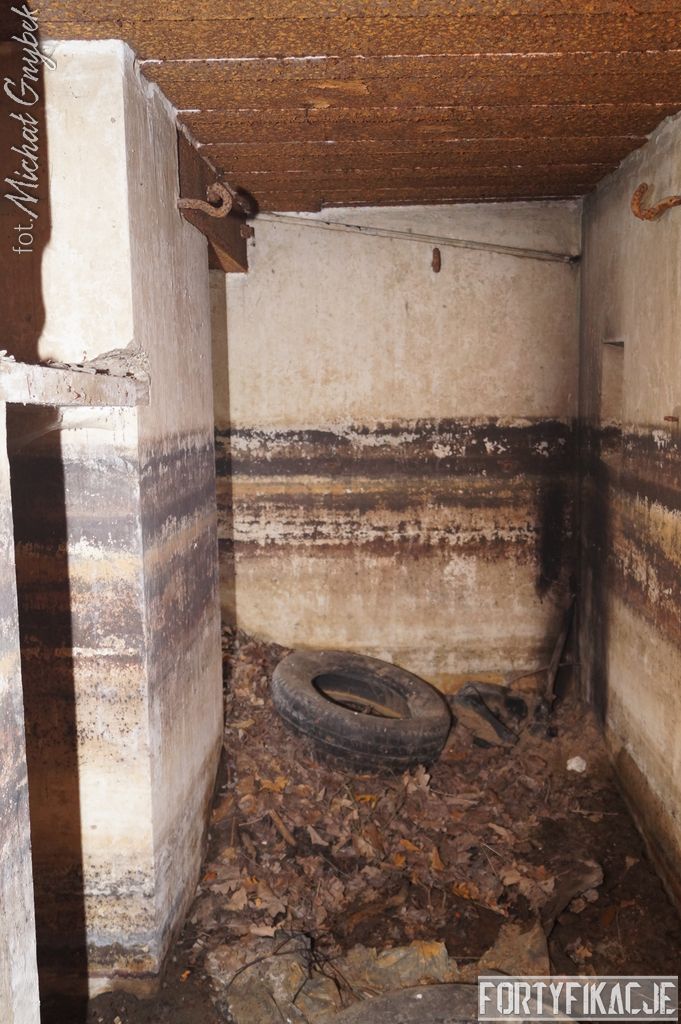 mógłby ktoś powiedzieć, ale kryje w sobie małą niespodziankę! Stand oczywiście zachowany jest bardzo dobrze. Położony w pobliżu brzegu Odry Stąd okresowo - nierzadko bardzo mocno - zalewany. Wzniesiony został w 1935r. I ten Unterstand był znakomicie skryty przed okiem przeciwnika. Zagłębiony w gruncie posiadał jedynie częściowo odsłoniętą elewację wejściową. Dziś niestety pozbawiony drzwi 14P7 wraz z ościeżnicami. Szczęśliwie zachowały się (styczeń 2017r.) stalowe klamry prowadzące na strop... Wejścia zabezpieczone zostały przed zalaniem dwiema schodniami.