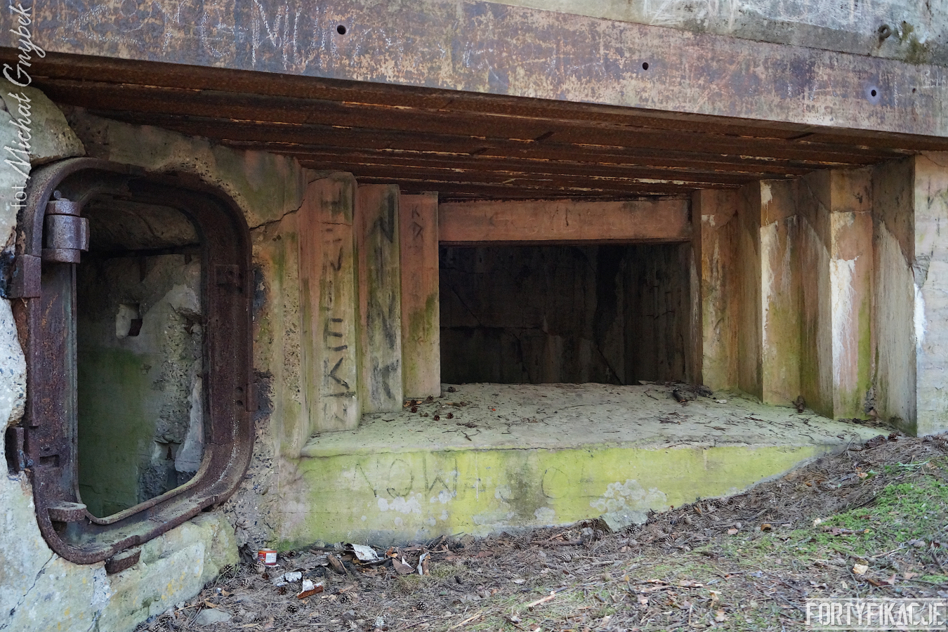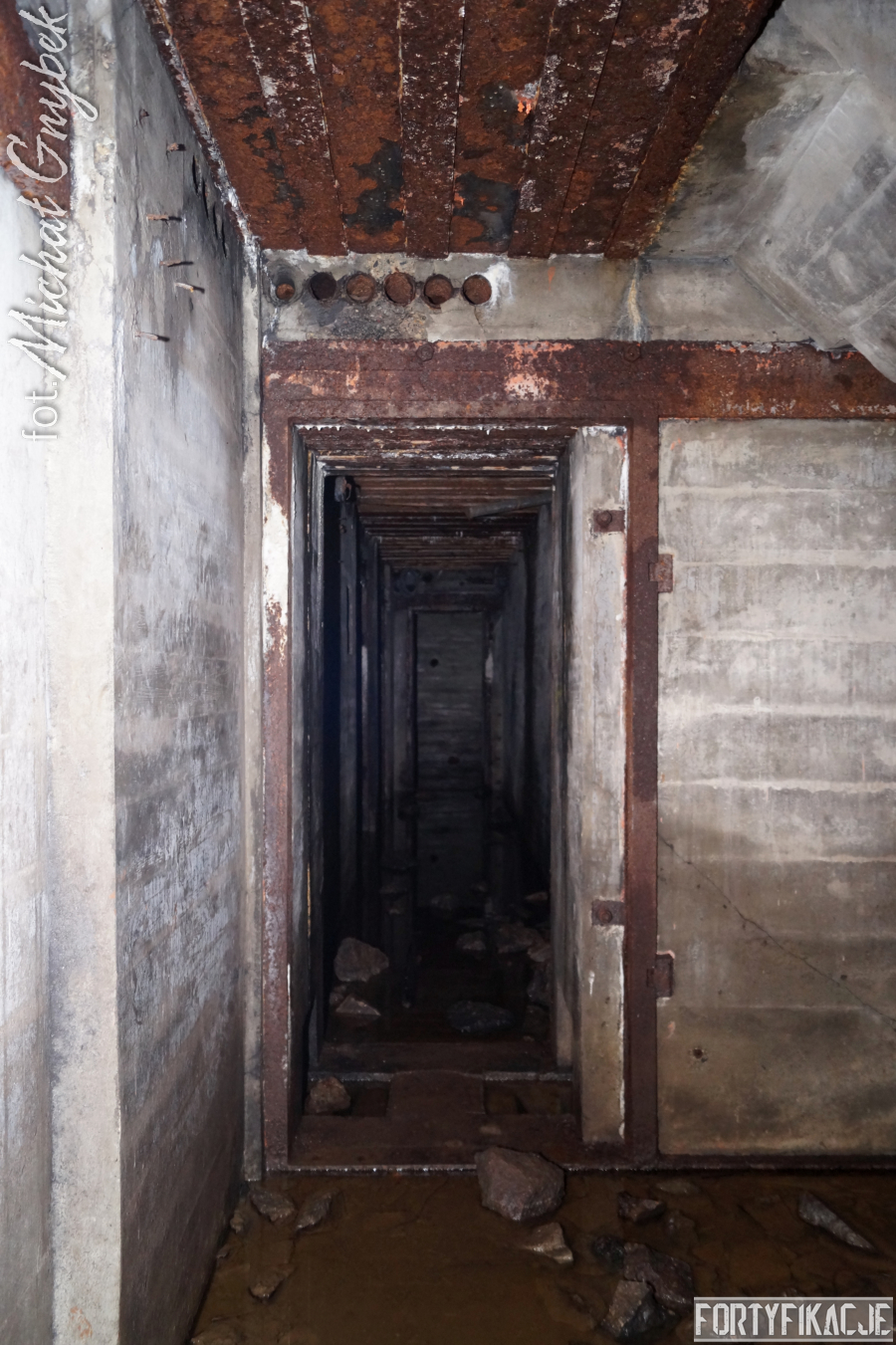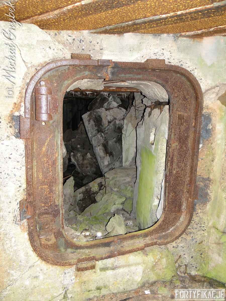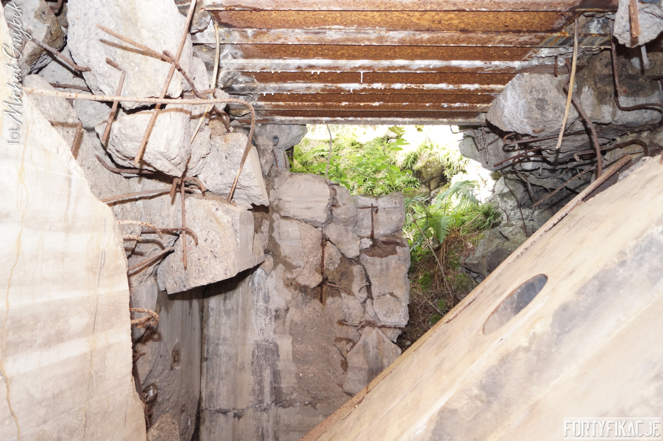 Czas też wyjaśnić skąd asymetria w kształcie pomiędzy górną a dolną kondygnacją. Przy tym warto również zadać kolejne pytanie: jaka była zasadność istnienia w obiekcie tak licznych pomieszczeń załogi? Docelowo B-Werk miał być wzmocniony wieżą lub izbą bojową uzbrojoną w armatę przeciwpancerną, prawdopodobnie kal. 50mm. Gdyby schron w rzeczywistości otrzymał takie uzbrojenie, niewątpliwie potrzebna byłaby wówczas większa załoga. Asymetrię w schronie widać właśnie tam, gdzie miało być ulokowane przejście do planowanej izby bojowej. Niestety planów nie zrealizowano... ![]()