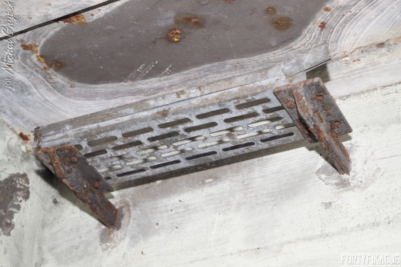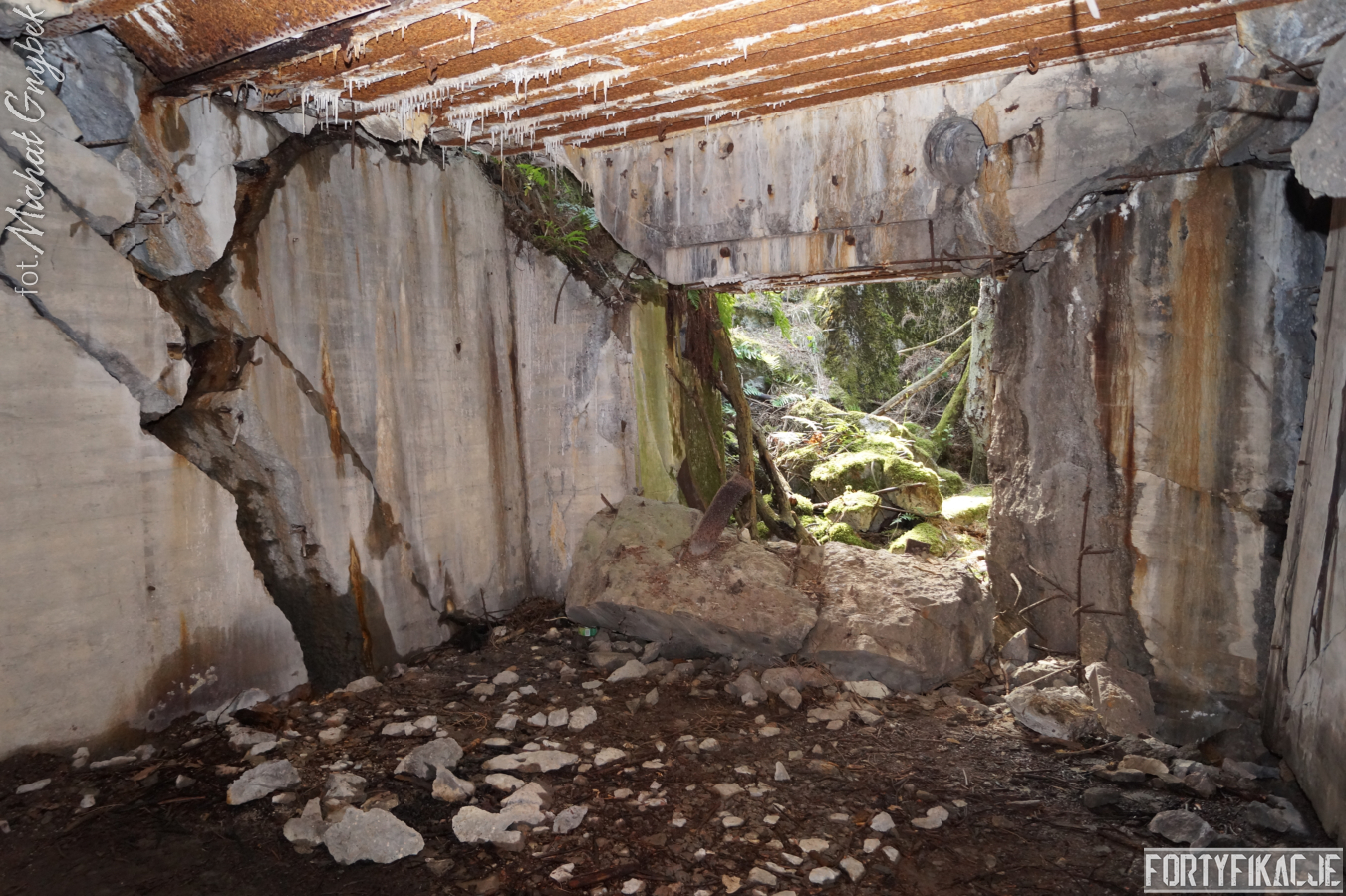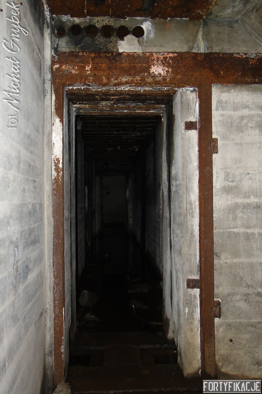 Czas też wyjaśnić skąd asymetria w kształcie pomiędzy górną a dolną kondygnacją. Przy tym warto również zadać kolejne pytanie: jaka była zasadność istnienia w obiekcie tak licznych pomieszczeń załogi? Docelowo B-Werk miał być wzmocniony wieżą lub izbą bojową uzbrojoną w armatę przeciwpancerną, prawdopodobnie kal. 50mm. Gdyby schron w rzeczywistości otrzymał takie uzbrojenie, niewątpliwie potrzebna byłaby wówczas większa załoga. Asymetrię w schronie widać właśnie tam, gdzie miało być ulokowane przejście do planowanej izby bojowej. Niestety planów nie zrealizowano... ![]()