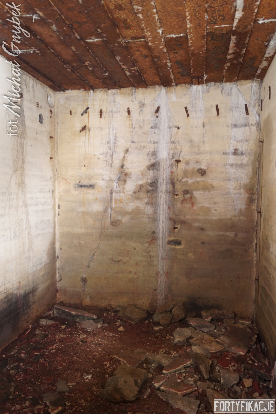 Przyjrzyjmy się zatem kondygnacji górnej: uległa dosyć sporym zniszczeniom. Z tego powodu część pomieszczeń obecnie nie istnieje lub jest niedostępna. Wiele ścian zostało przez eksplozję przemieszczonych lub stoją pod nienaturalnym kątem... Mimo to w wielu zachowanych izbach zachowały się ślady ich pierwotnych funkcji. Moją uwagę przyciągnęły szczególnie pomieszczenia związane z szeroko rozumianym dowodzeniem obiektem i łącznością. Z pewnością są to najlepiej zachowane pomieszczenia górnej kondygnacji.