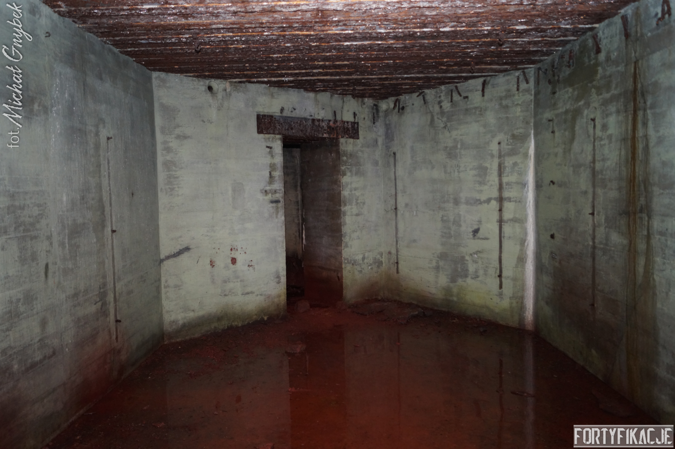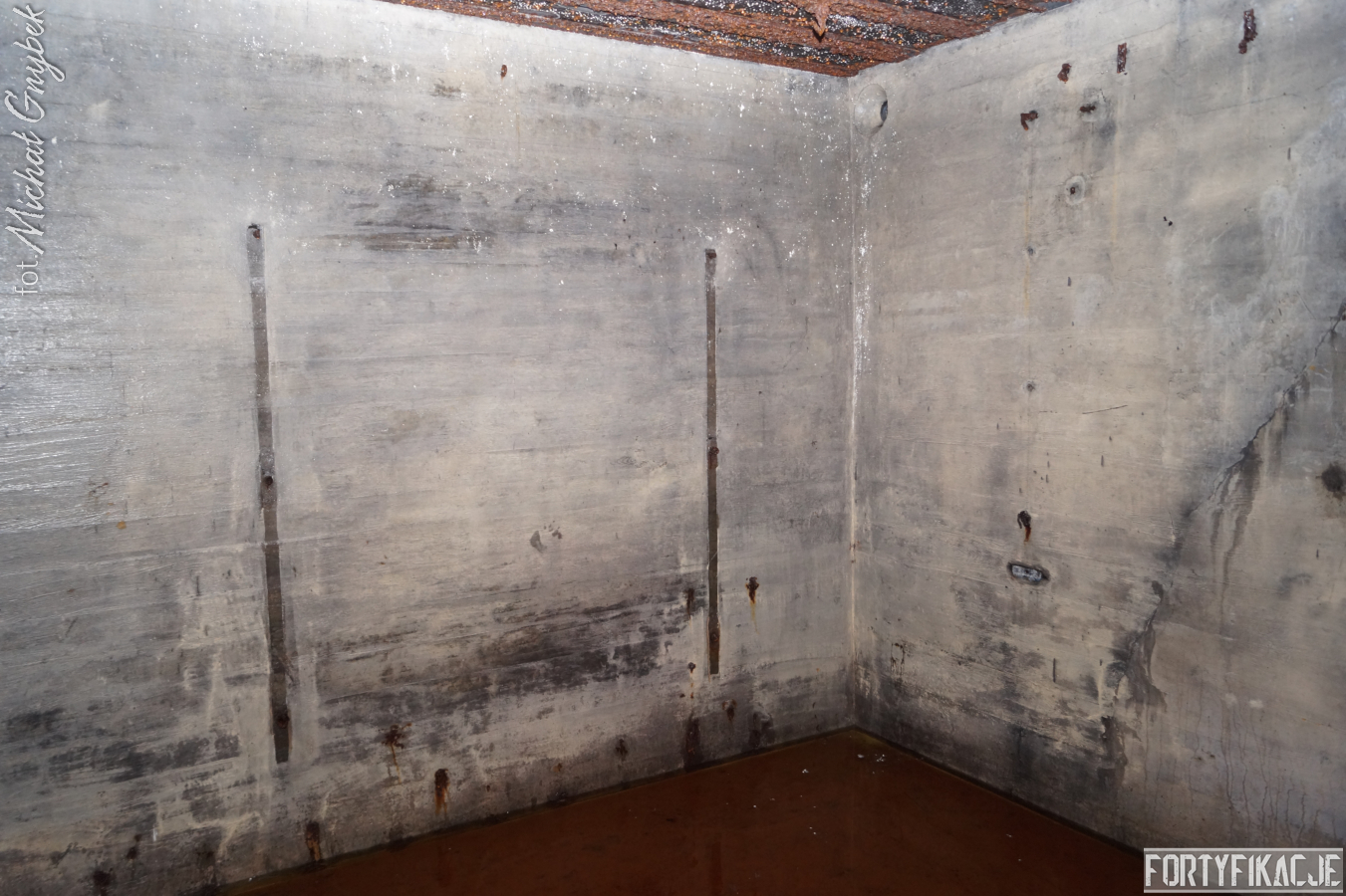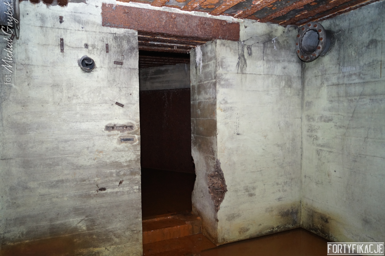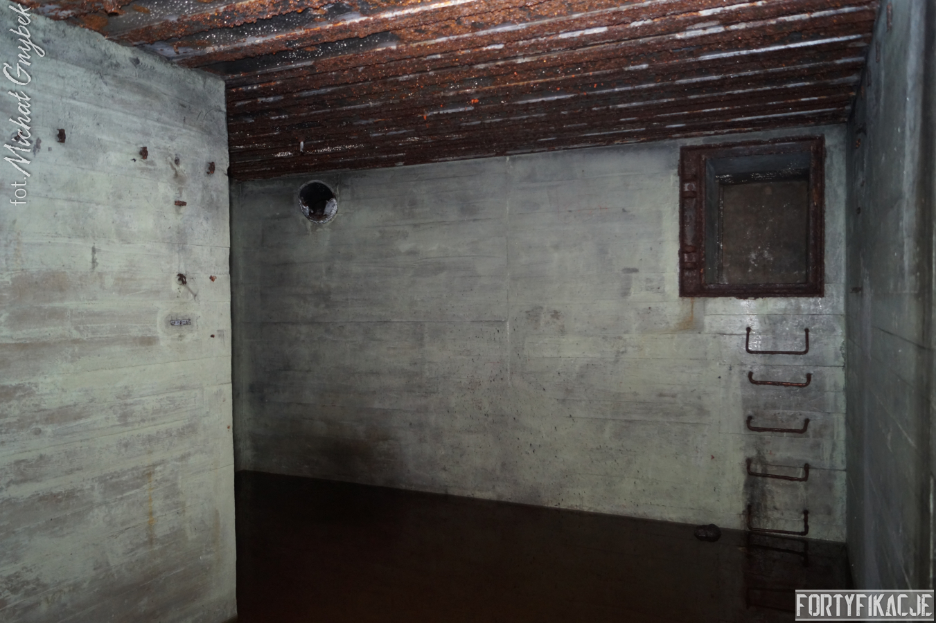 Uwagę w oglądanych pomieszczeniach przyciąga zachowane malowanie. Co ciekawe na ścianach nie zobaczymy praktycznie żadnych napisów eksploatacyjnych... Schron wygląda pod tym względem na nieukończony. Jak ukazują poniższe zdjęcia w rozmaitych izbach zachowały się pojedyncze stalowe elementy, w tym pozostałości dwóch zbiorników na wodę. Na kondygnacji tej znajdziemy stosunkowo dużą liczbę izb załogi. Było ich tu siedem i dawały ukrycie co najmniej 51 żołnierzom! Na szczególną uwagę eksploratora dolnej kondygnacji zasługują pomieszczenia sanitarne. W ich skład wchodziły umywalnie i toalety. W jednym i drugim pomieszczeniu zachowały się ceramiczne elementy wyposażenia: duży pisuar ścienny oraz zlewozmywak.