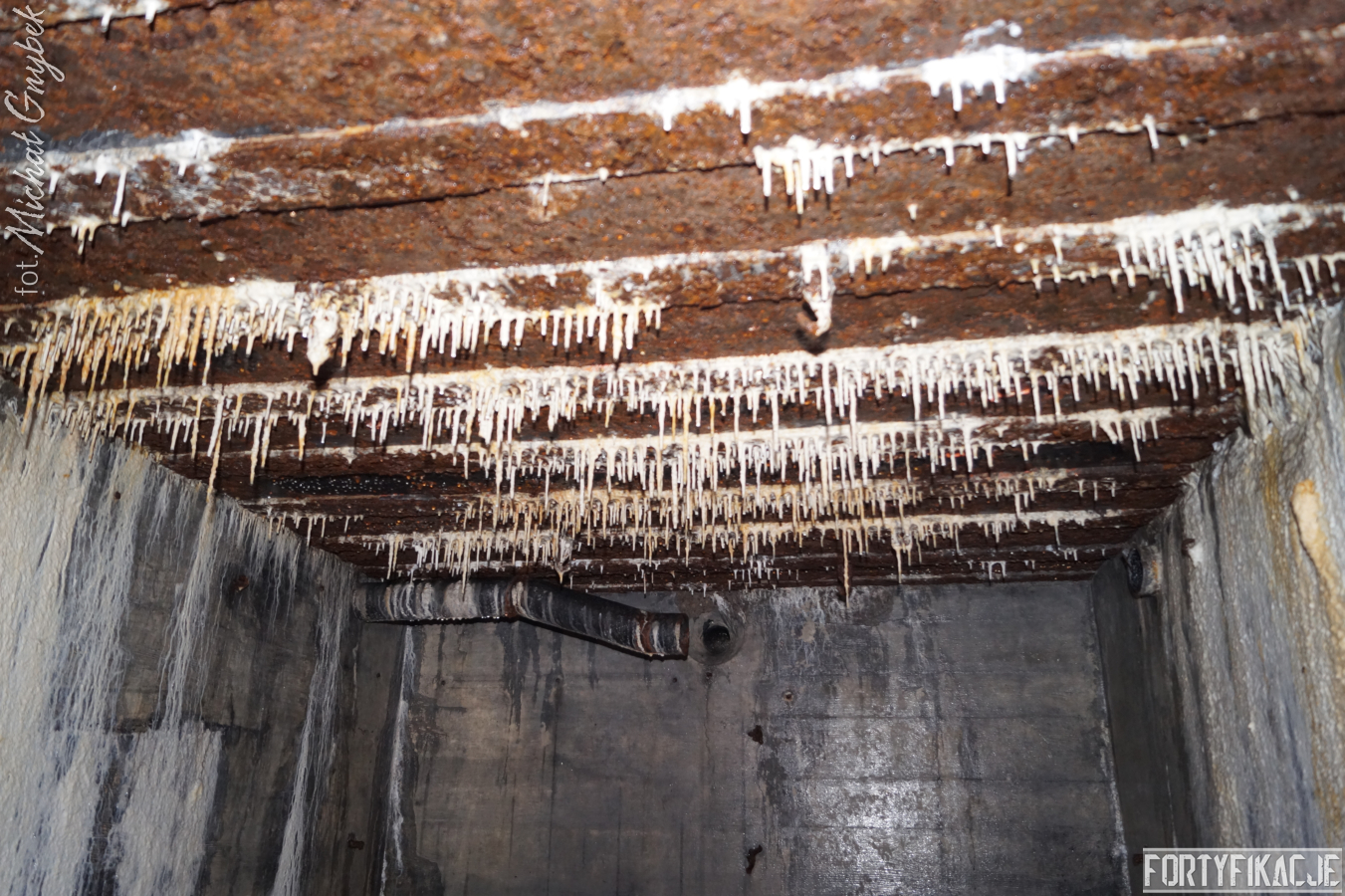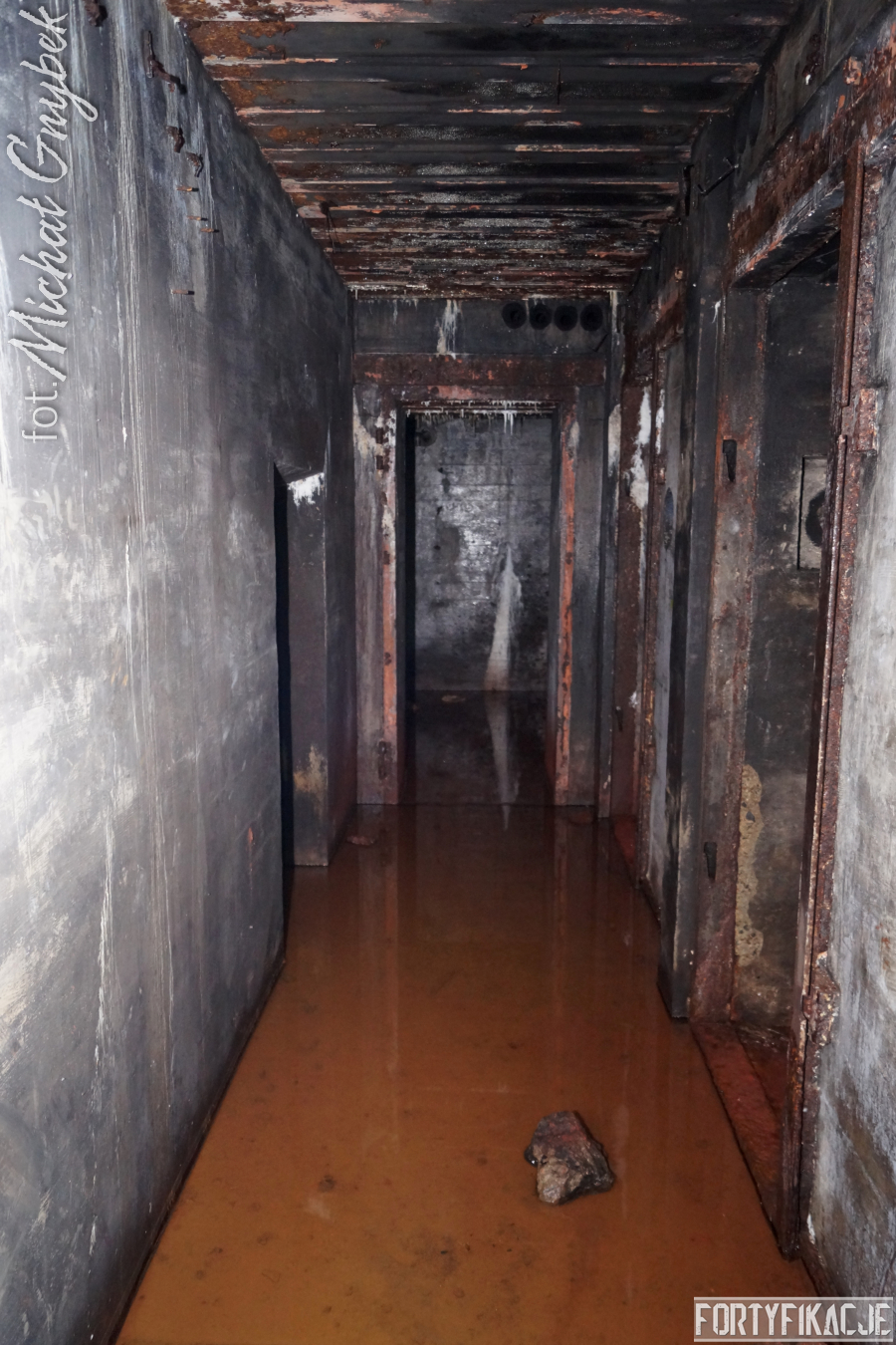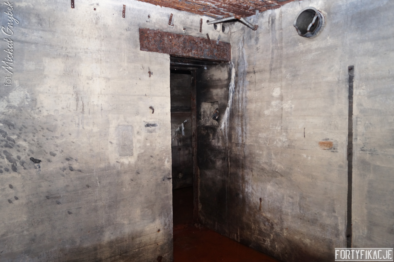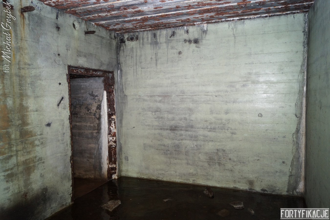 Uwagę w oglądanych pomieszczeniach przyciąga zachowane malowanie. Co ciekawe na ścianach nie zobaczymy praktycznie żadnych napisów eksploatacyjnych... Schron wygląda pod tym względem na nieukończony. Jak ukazują poniższe zdjęcia w rozmaitych izbach zachowały się pojedyncze stalowe elementy, w tym pozostałości dwóch zbiorników na wodę. Na kondygnacji tej znajdziemy stosunkowo dużą liczbę izb załogi. Było ich tu siedem i dawały ukrycie co najmniej 51 żołnierzom! Na szczególną uwagę eksploratora dolnej kondygnacji zasługują pomieszczenia sanitarne. W ich skład wchodziły umywalnie i toalety. W jednym i drugim pomieszczeniu zachowały się ceramiczne elementy wyposażenia: duży pisuar ścienny oraz zlewozmywak.