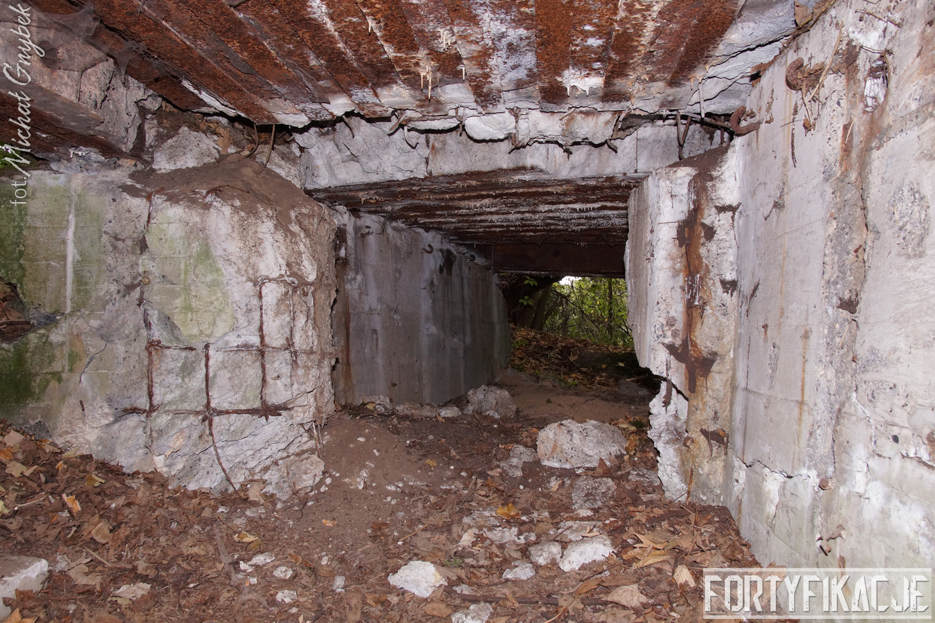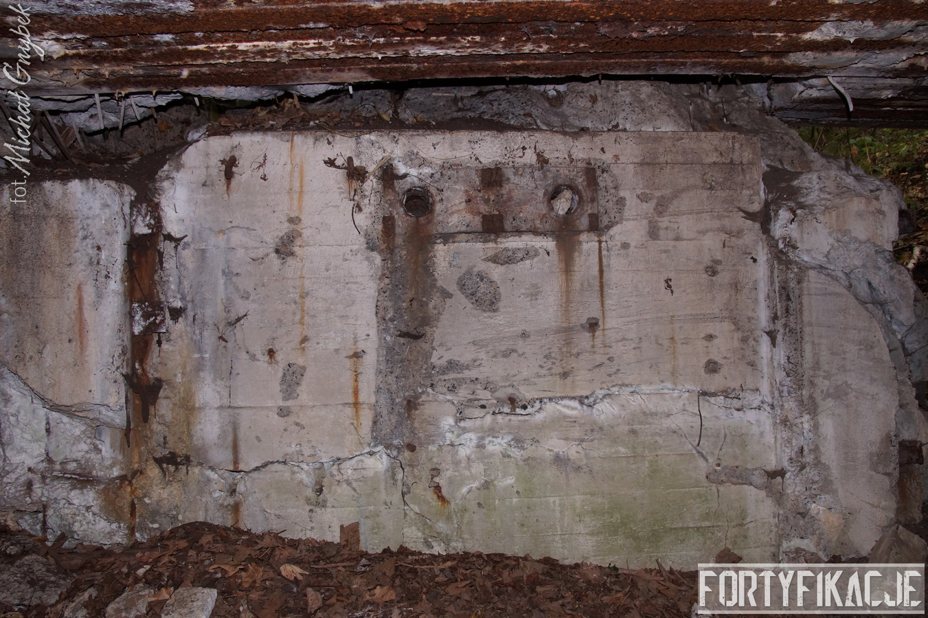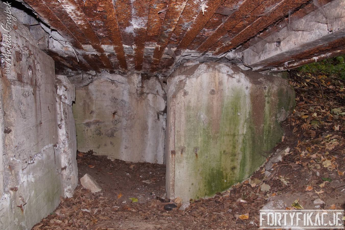 liczbę pomieszczeń: było ich aż cztery! Patrząc na przekrój poziomy schronu (znaleźć możemy go w pracy Krzysztofa Motyla) można odnieść wrażenie, że była to próba połączenia ze sobą dwóch projektów Unterstand für MG mit Schartenplatte (Friedensbau) zawartych w instrukcji Stellungsbau z 1930 roku. Przy czym nie było to zwykłe zlepienie dwóch konstrukcji. Projektanci dostosowali obiekt do warunków terenowych.