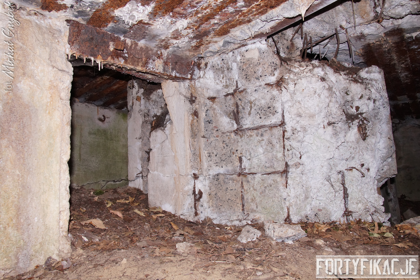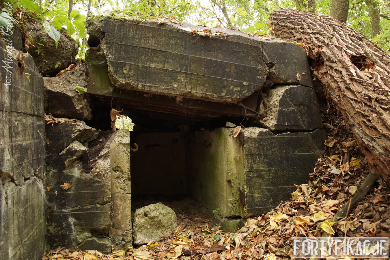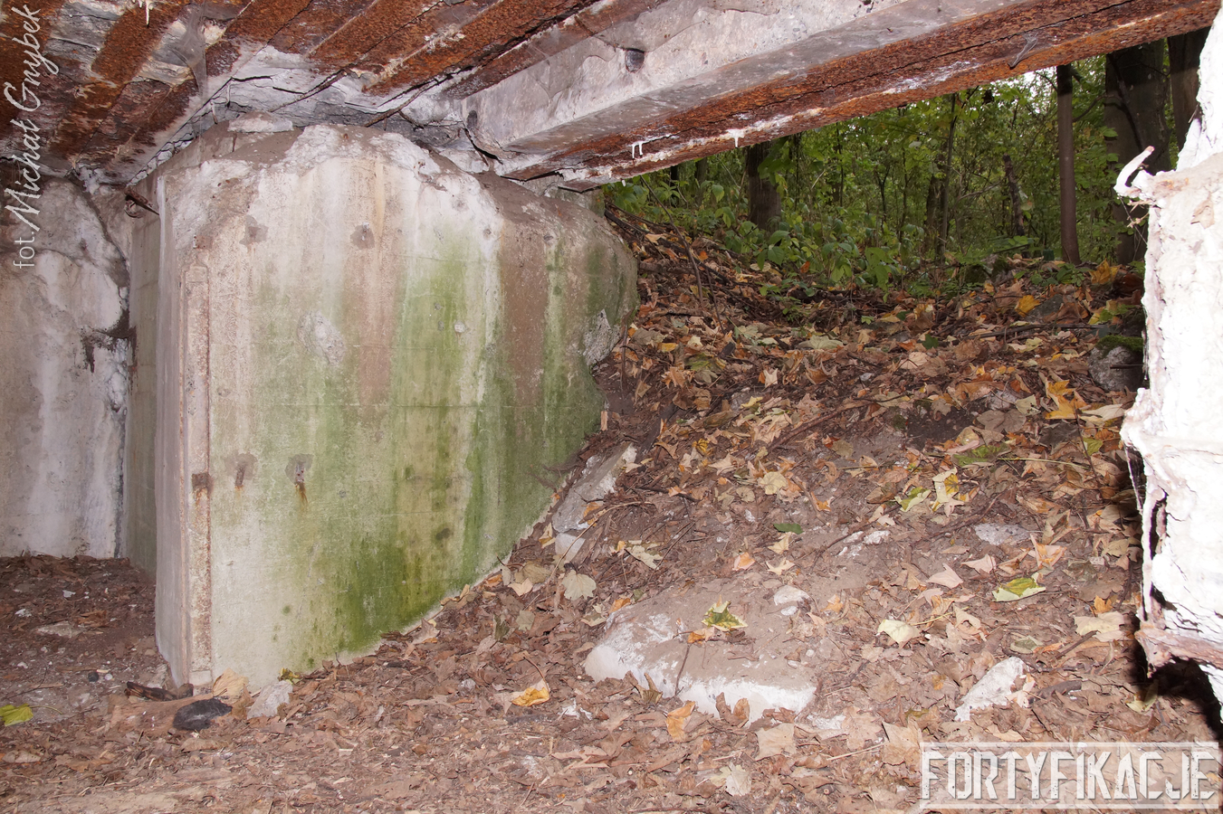 liczbę pomieszczeń: było ich aż cztery! Patrząc na przekrój poziomy schronu (znaleźć możemy go w pracy Krzysztofa Motyla) można odnieść wrażenie, że była to próba połączenia ze sobą dwóch projektów Unterstand für MG mit Schartenplatte (Friedensbau) zawartych w instrukcji Stellungsbau z 1930 roku. Przy czym nie było to zwykłe zlepienie dwóch konstrukcji. Projektanci dostosowali obiekt do warunków terenowych.