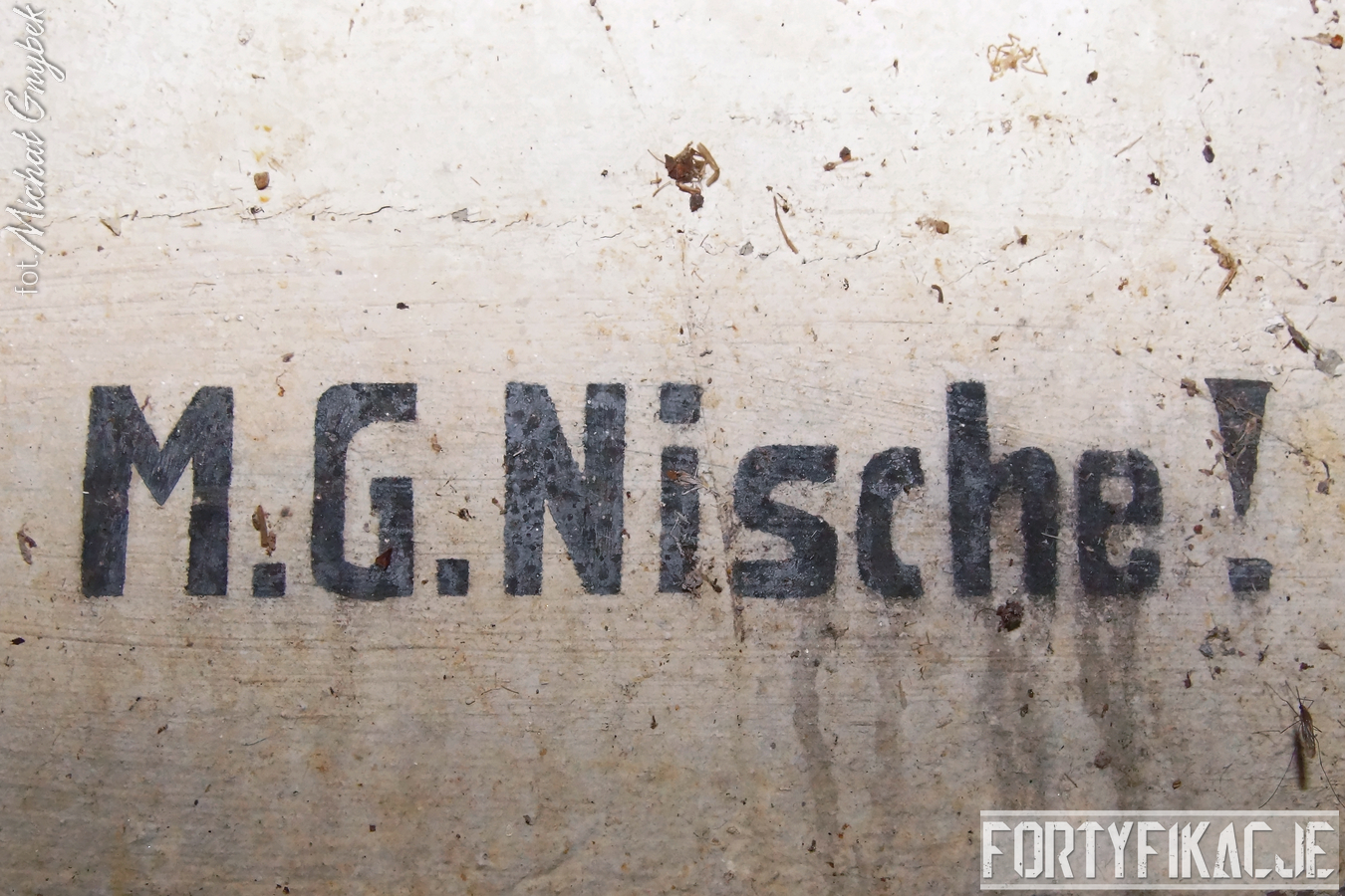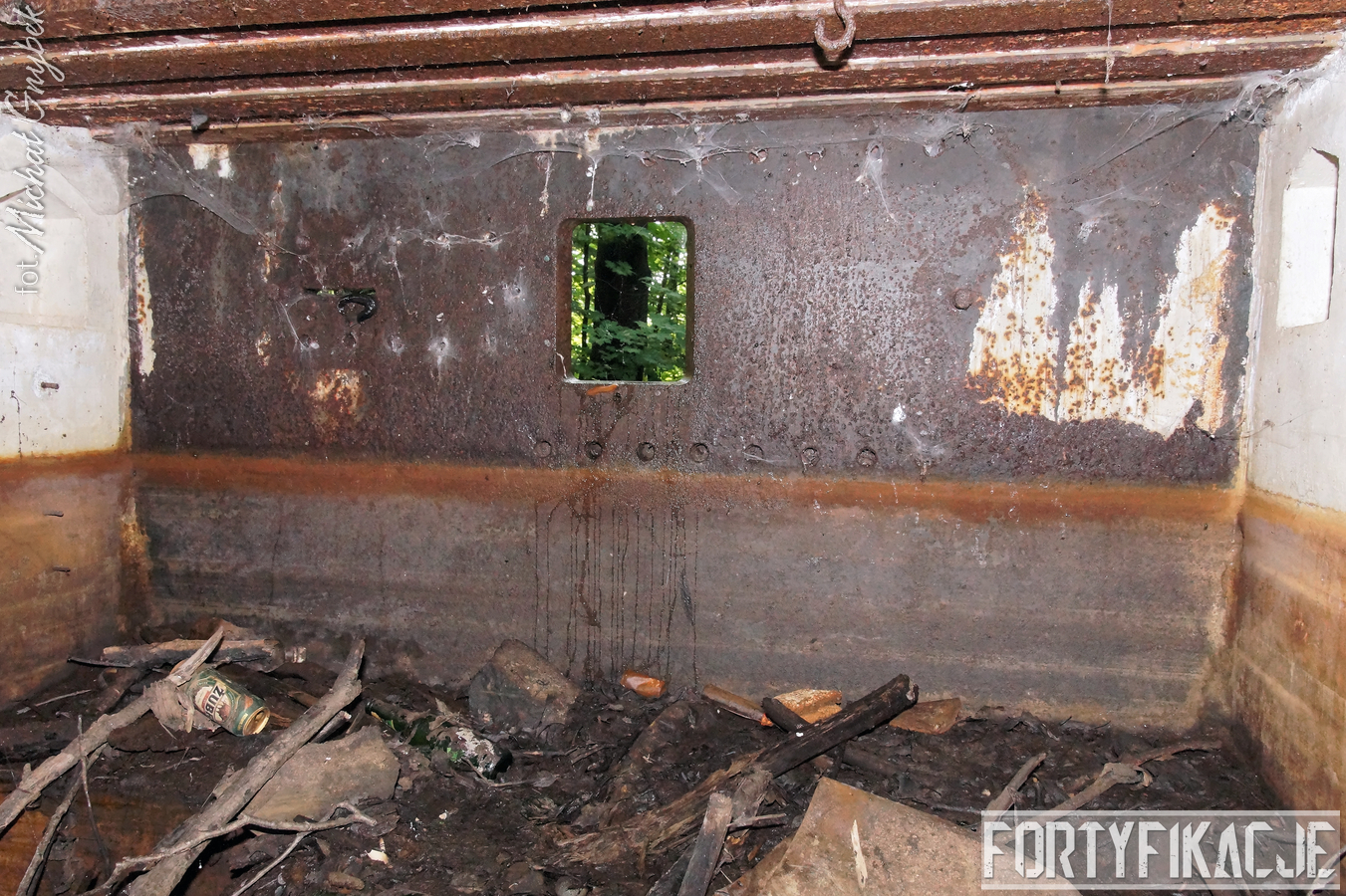 Układ pomieszczeń schronu zgodny był z wymaganiami zawartymi w instrukcji „Budowa pozycji obronnej” (niem. Stellungsbau) opublikowanej 4 sierpnia 1930 roku. A precyzując - z jednym z projektów w niej zawartych - żelbetonowym stanowiskiem bojowym dla karabinu maszynowego, chronionym płytą ze strzelnicą (niem. Unterstand für ein M.G. mit Schartenplatte). Obiekt posiadał standardowo dwa pomieszczenia. Przedsionek pełnił rolę śluzy gazoszczelnej oraz magazynową. Brak tu elementów systemu wentylacyjnego. Przedsionek od izby bojowej oddzielony był dwojgiem drzwi: ciężkimi stalowymi dwudzielnymi oraz gazoszczelnymi. Pomieszczenie bojowe posiadało niewielkie rozmiary. Podporządkowane było przede wszystkim roli bojowej. Stanowisko bojowe chronione było płytą stalową o szerokości 240, wysokości 180 i grubości 10 cm. Płyta zamocowana była do stropu (stąd jego charakterystyczne obniżenie) oraz do żelbetowej ławy, której nadano kształt litery "T". Na ławie zamontowany był stolik z podstawą forteczną dla km sMG 08. Załodze zapewniono wymianę powietrza. Nie był to system doskonały: powietrze było wtłaczane poprzez przewód wentylacyjny (Lüftungsrohr), prawdopodobnie wspomagany przez filtrowentylator. Natomiast zanieczyszczone powietrze uchodzić miało przez otwór strzelniczy. Rozwiązanie takie mocno ograniczało możliwości bojowe schronu i stwarzało zagrożenie dla zdrowia i życia załogi! W opisywanym schronie istniała możliwość zastosowania piecyka - wskazuje na to umiejscowienie w ścianie przewodu kominowego (Rauchrohr). Zadbano również o kontakt ze światem zewnętrznym. Załoga posiadała telefon - wskazują na to kable telefoniczne.