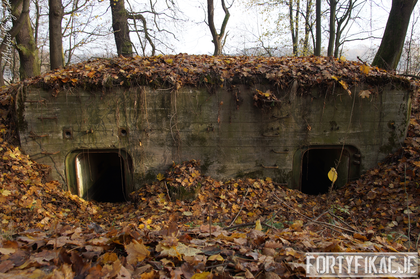 Na światło dzienne wystawiona została jedynie elewacja wejściowa. Reszta bryły schronu ukryta była pod standardowym kamuflażem w postaci nasypu ziemnego, który od przedpola wyglądał jak niewysoka górka. Wejście do obiektu osłonięte zostało zwałem ziemi. Czas obszedł się ze ścianą wejściową dosyć łagodnie. W płaszczyźnie żelbetu zachowały się klamry drabinek prowadzących na strop. Ościeżnice do dziś okalają oba otwory wejściowe, zamykanie niegdyś stalowymi drzwiami 14P7. Prócz nich odnaleźć można również dwie czerpnie powietrza. Dewastacji natomiast uległy stalowe pałąki.