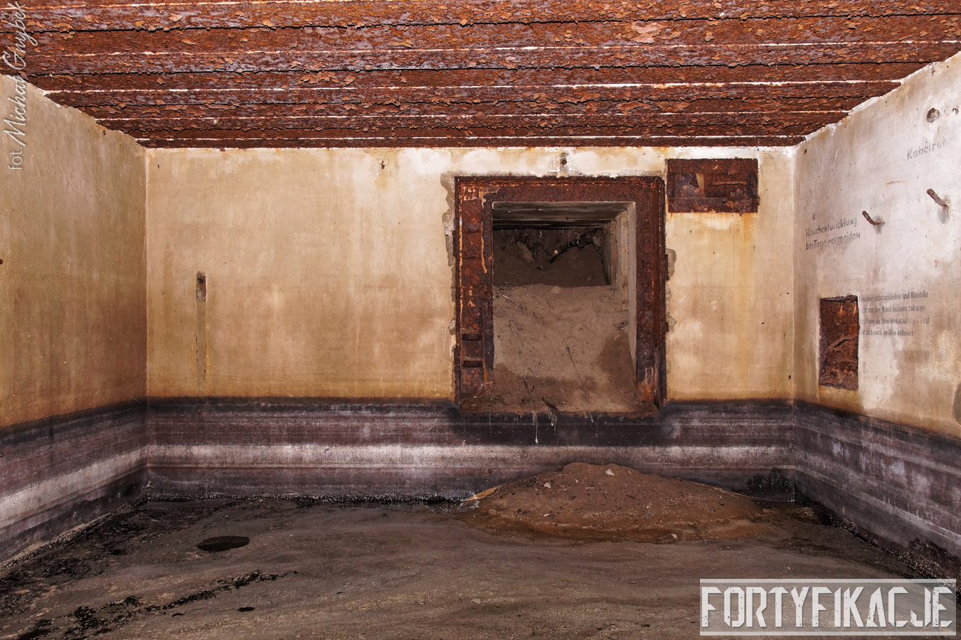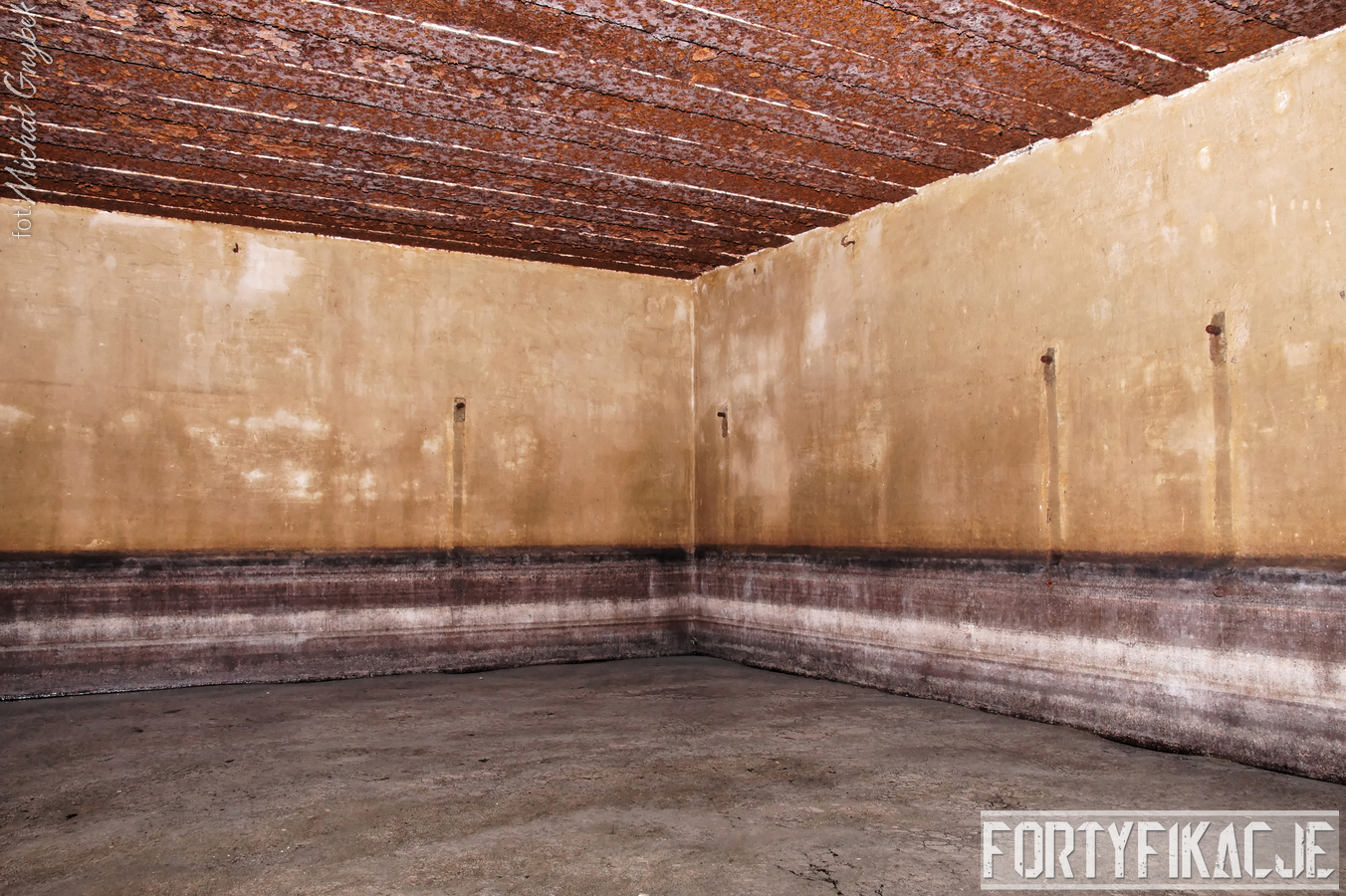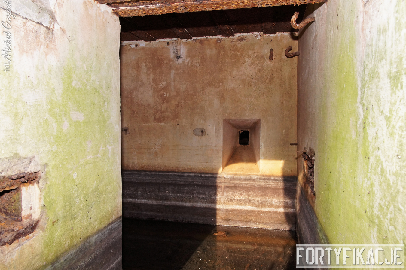 Wnętrze schronu składało się z dwóch pomieszczeń. Do bloku wejściowego prowadziły dwa wejścia. Blok miał formę wąskiego korytarza. Pełnił oczywiście niejedną rolę. Przede wszystkim śluzy gazoszczelnej, prócz tego było to miejsce służące magazynowaniu rozmaitego osprzętu: od narzędzi saperskich po broń i amunicję. Tu znajdowała się również przenośna toaleta (dosyć górnolotne określenie dla kubła z torfem...). Pomieszczenie to było przestrzeliwane przez dwa stanowiska obrony wewnętrznej. Ambrazurom otworów strzeleckich nadano "gładką" formę. Warto zwrócić również uwagę na wnęki minerskie, dzięki którym załoga w pośpiechu opuszczająca swój obiekt mogła go wysadzić w powietrze.