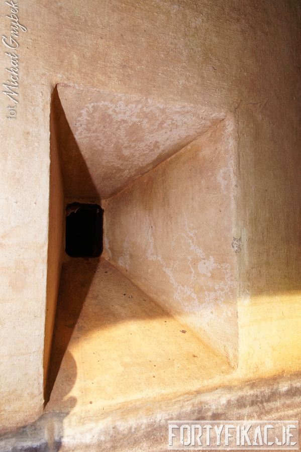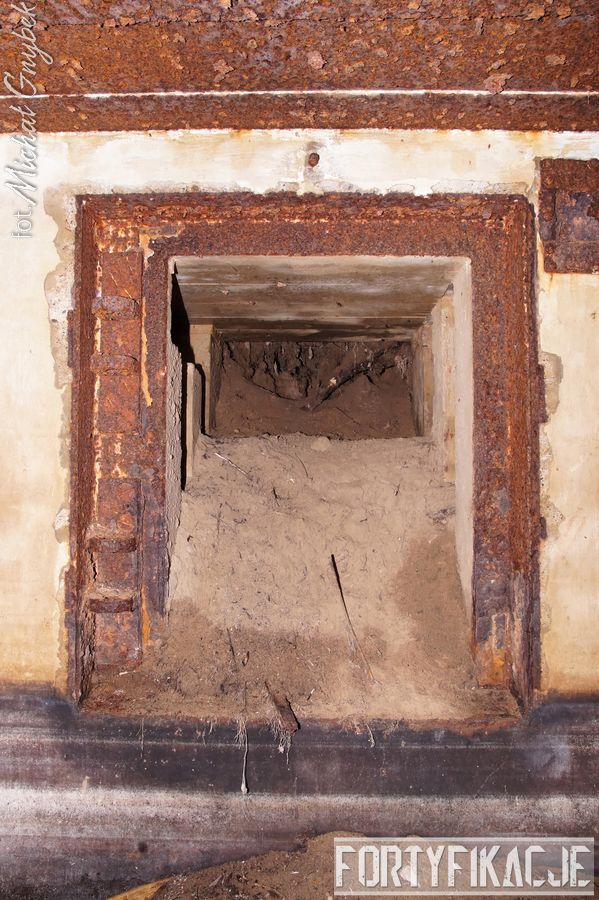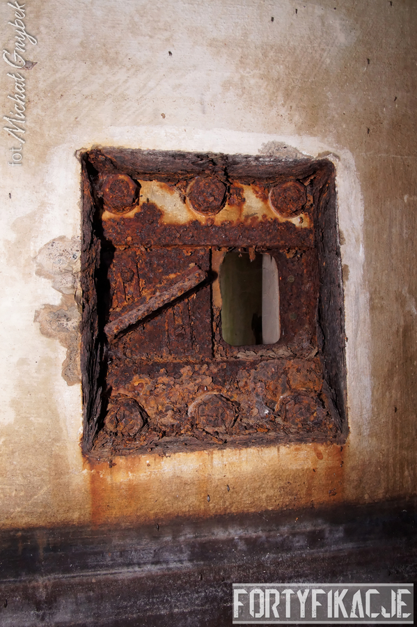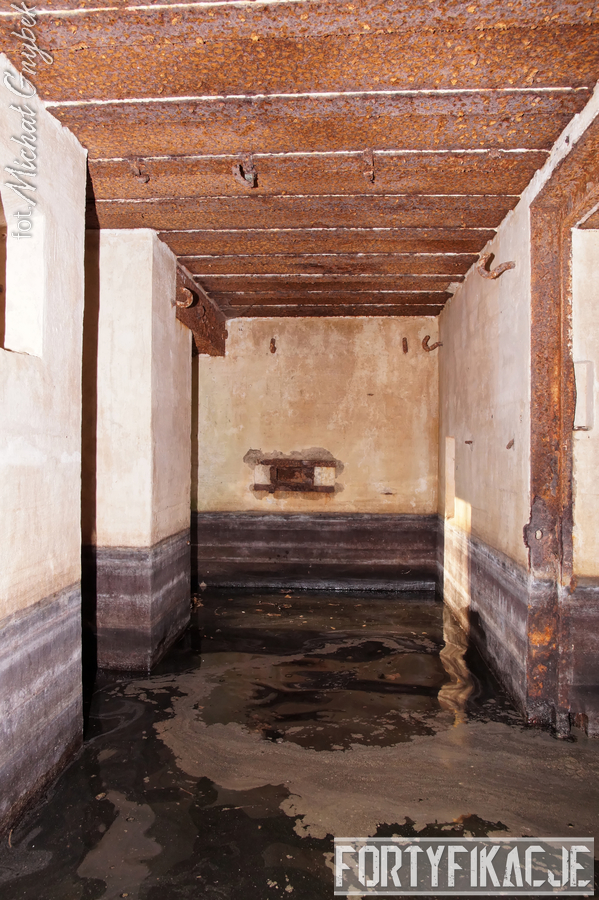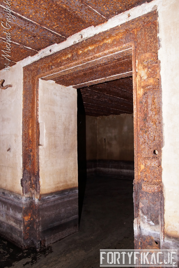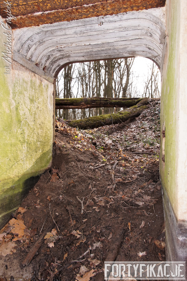 Wnętrze schronu składało się z dwóch pomieszczeń. Do bloku wejściowego prowadziły dwa wejścia. Blok miał formę wąskiego korytarza. Pełnił oczywiście niejedną rolę. Przede wszystkim śluzy gazoszczelnej, prócz tego było to miejsce służące magazynowaniu rozmaitego osprzętu: od narzędzi saperskich po broń i amunicję. Tu znajdowała się również przenośna toaleta (dosyć górnolotne określenie dla kubła z torfem...). Pomieszczenie to było przestrzeliwane przez dwa stanowiska obrony wewnętrznej. Ambrazurom otworów strzeleckich nadano "gładką" formę. Warto zwrócić również uwagę na wnęki minerskie, dzięki którym załoga w pośpiechu opuszczająca swój obiekt mogła go wysadzić w powietrze.