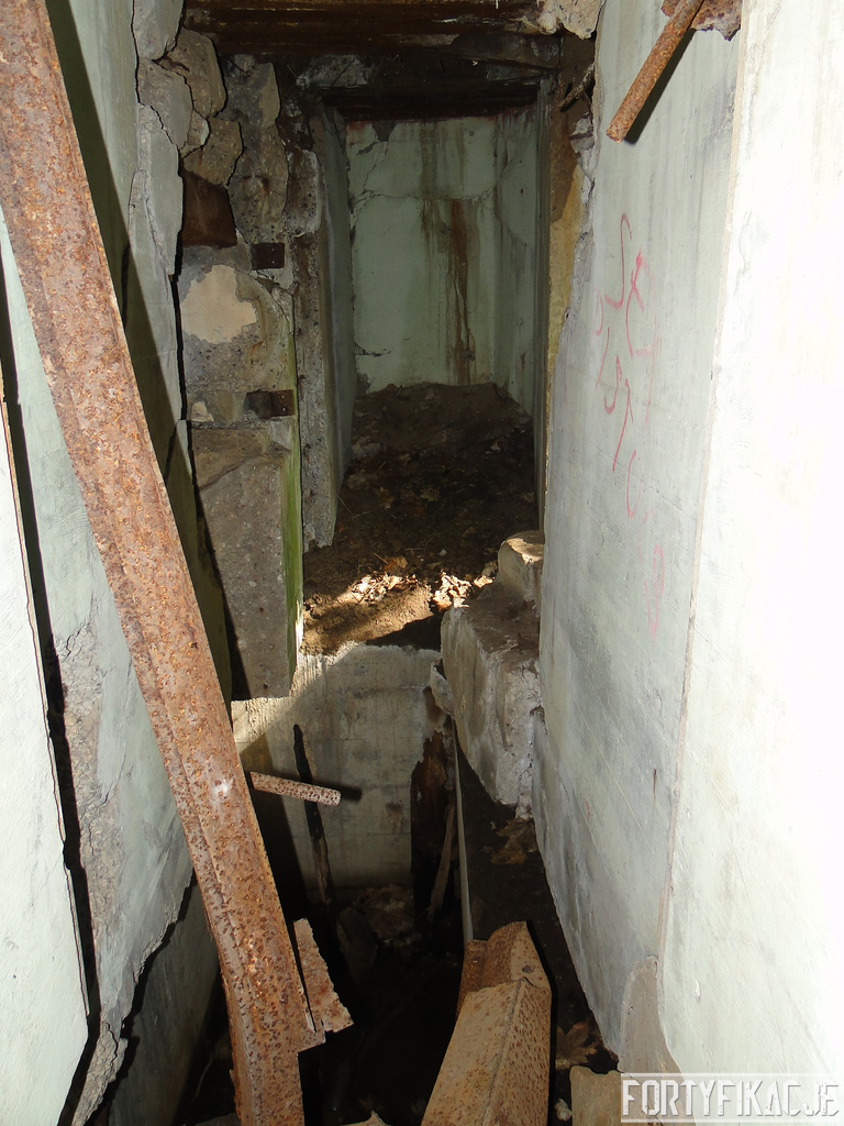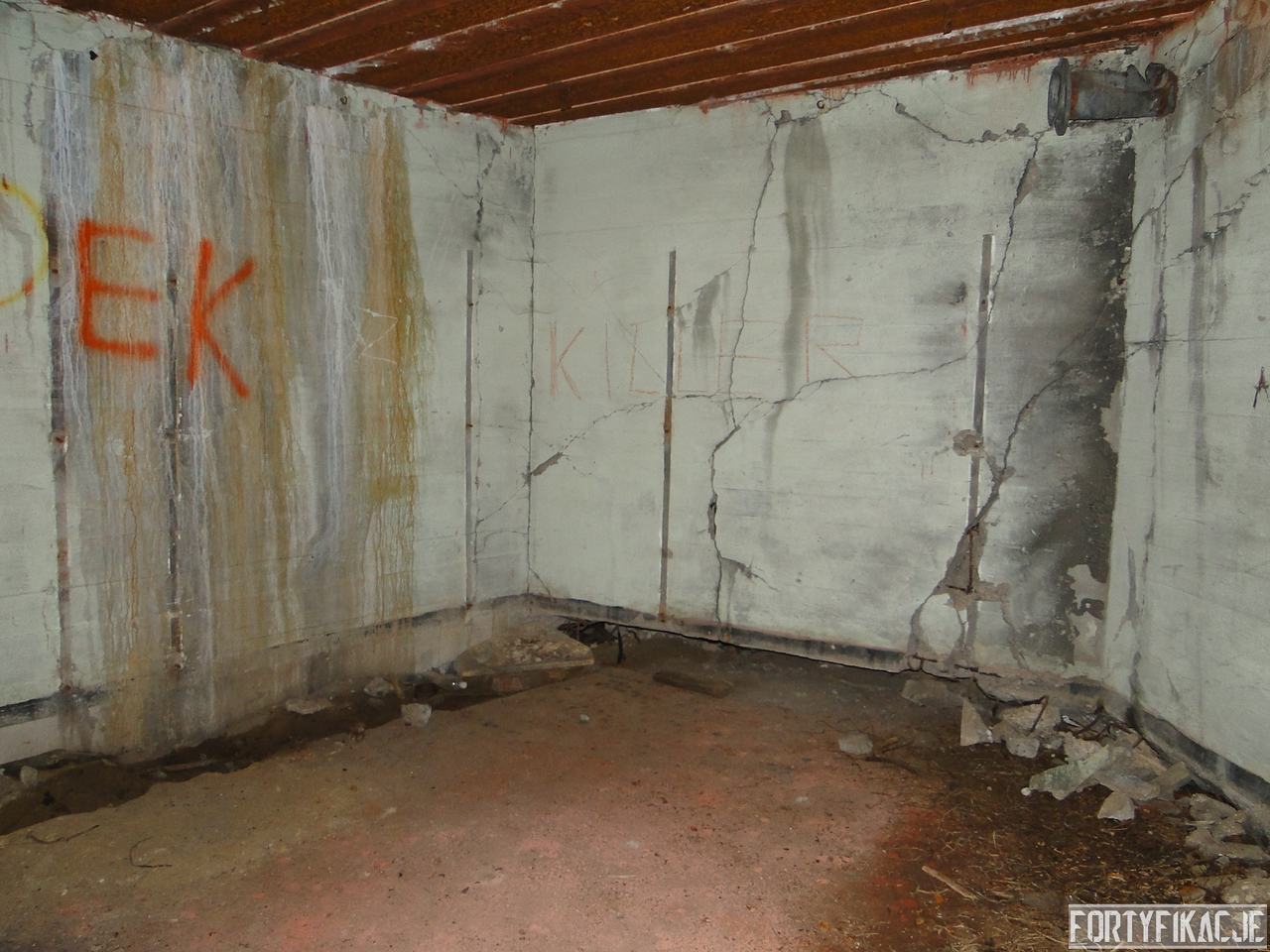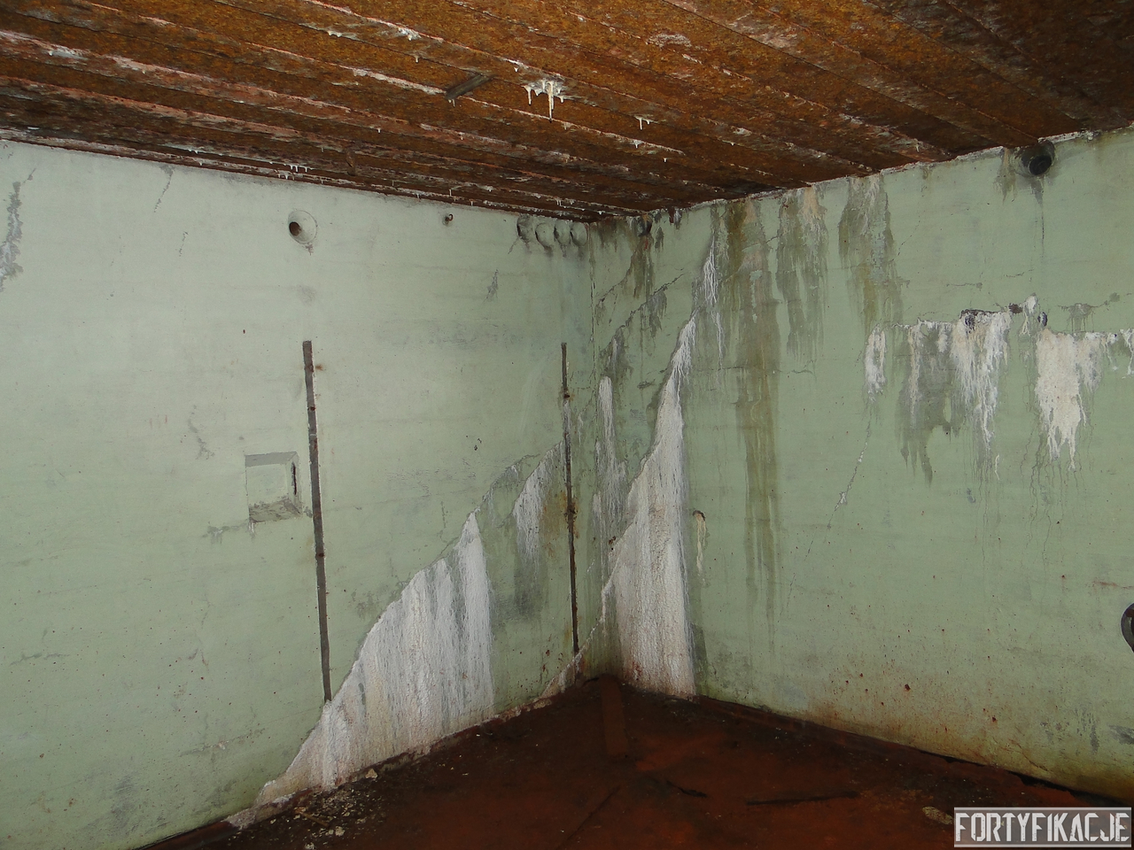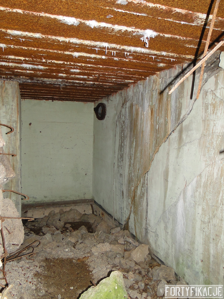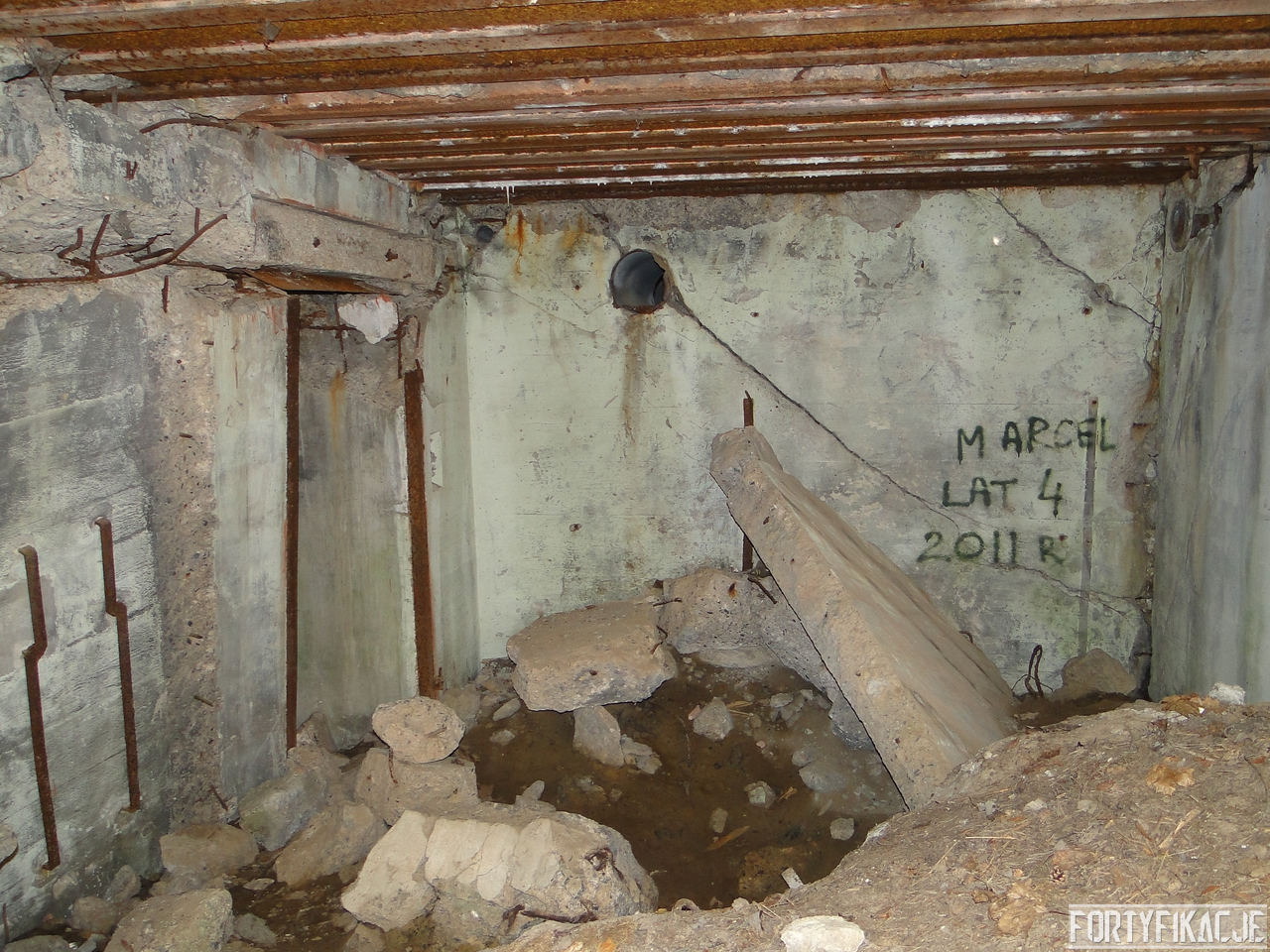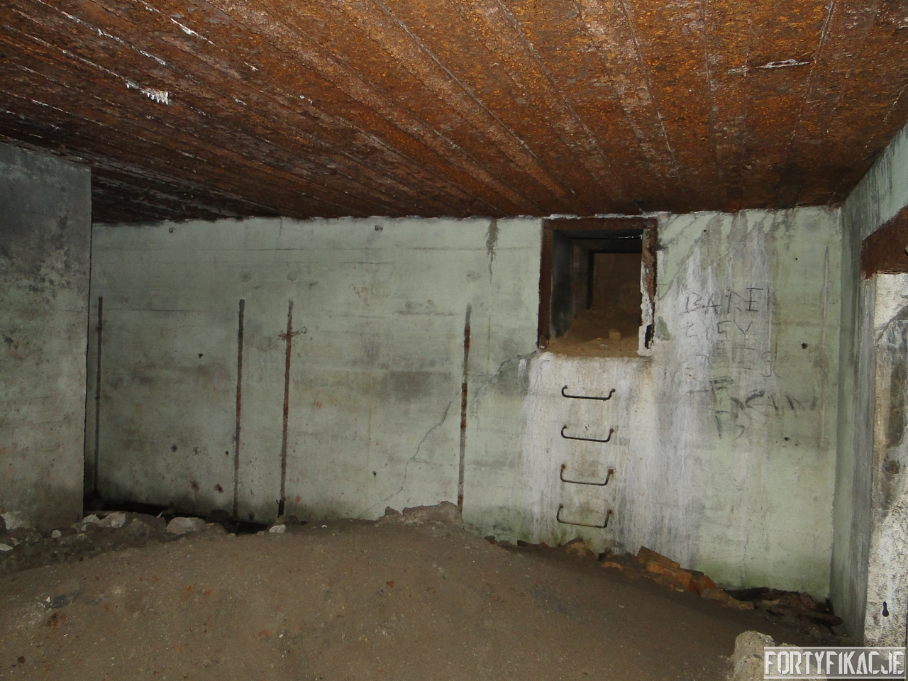 Wejdźmy na pierwszą i najwyższą kondygnację. Mimo dużych zniszczeń, które dotknęły najmocniej właśnie tą kondygnację można tu znaleźć kilka interesujących pomieszczeń i pozostałości po wyposażeniu. Zachowała się kazamata z płytą stalową 7P7 oraz izby pogotowia i załogi. Duża część tej kondygnacji jest zasypana całkowicie gruzem.