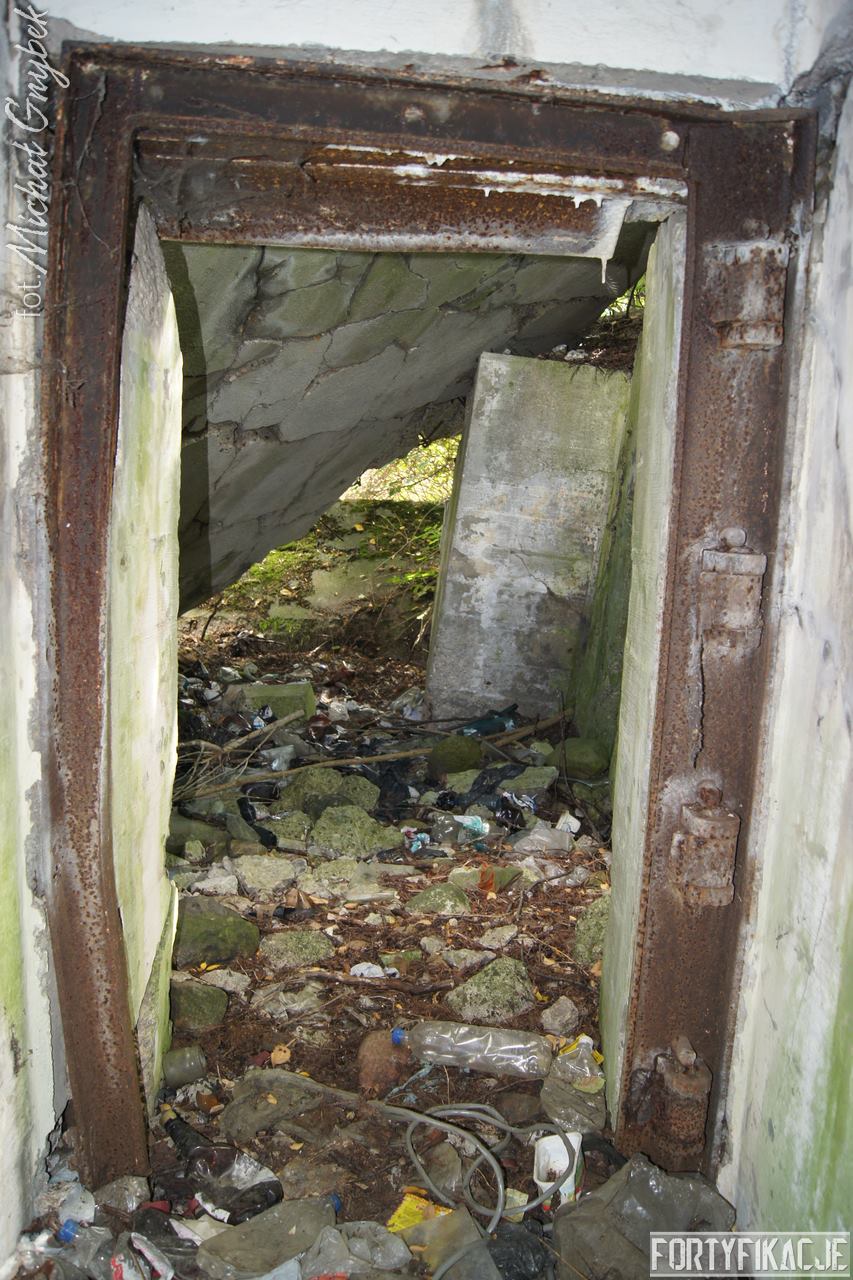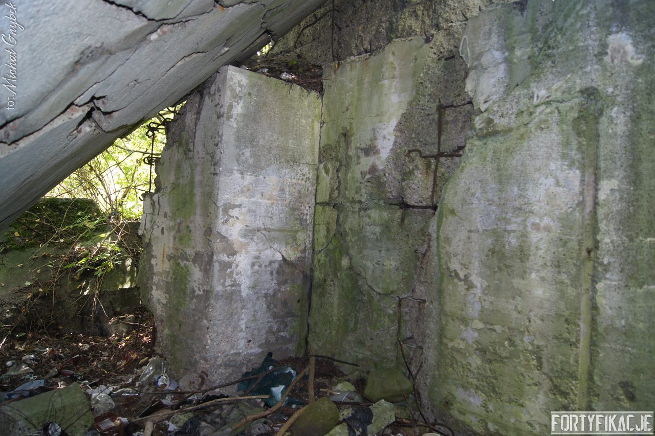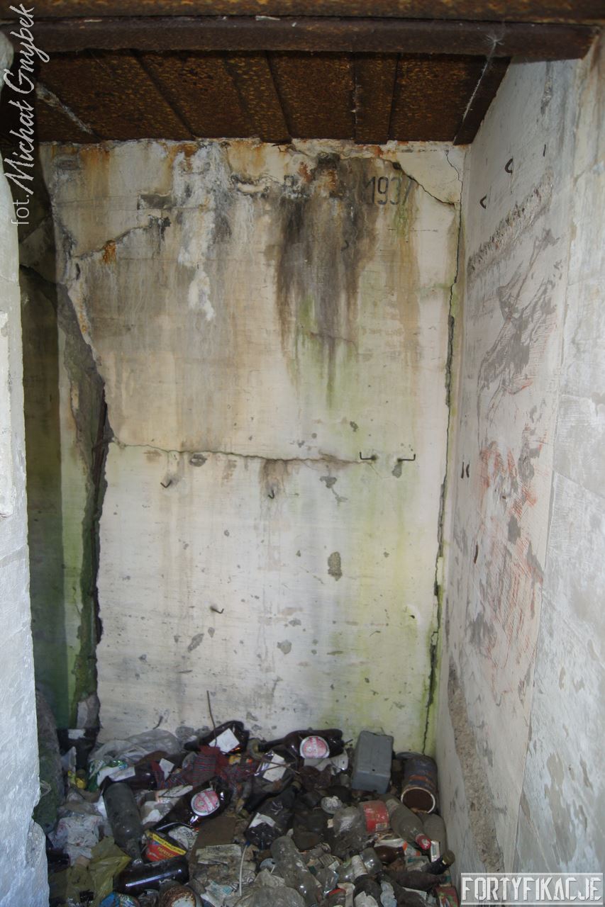 Wnętrze schronu niestety mocno ucierpiało, mimo to można tu odnaleźć kilka ciekawych detali. Na ścianach zachowały się ślady po napisach eksploatacyjnych, w tym mówiący o dacie jego wzniesienia. W tylnej ścianie izby bojowej zachowała się ponadto tarcza stalowa ze strzelnicą 48P8, która stanowiła ochronę dla strzelca broniącego wejścia. Niestety schron - jak widać na poniższych zdjęciach - jest obecnie dosyć mocno zaśmiecony... Być może prędzej lub później znajdą się dobre dusze, które go wysprzątają, bo z pewnością może być on traktowany jako intrygująca atrakcja turystyki historycznej/eksploracyjnej!