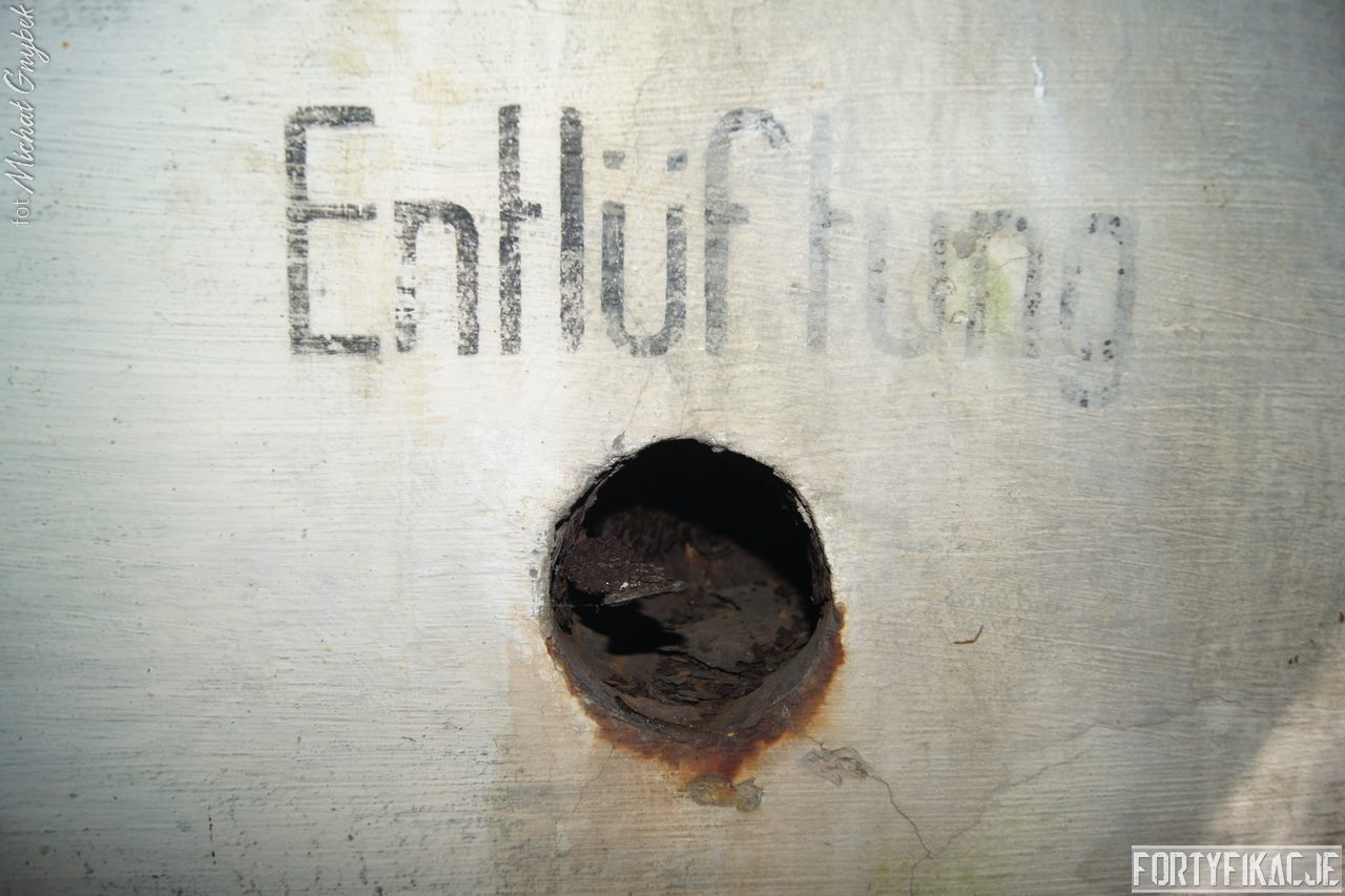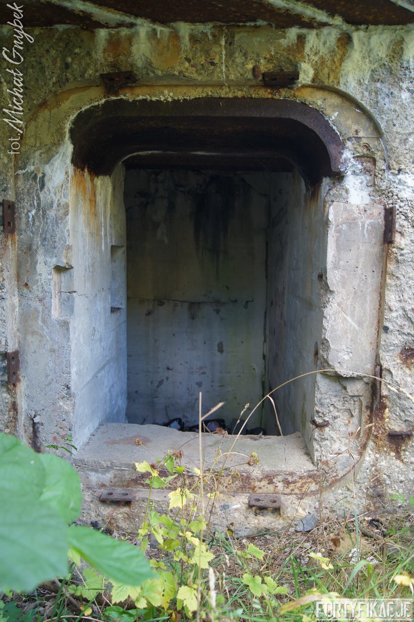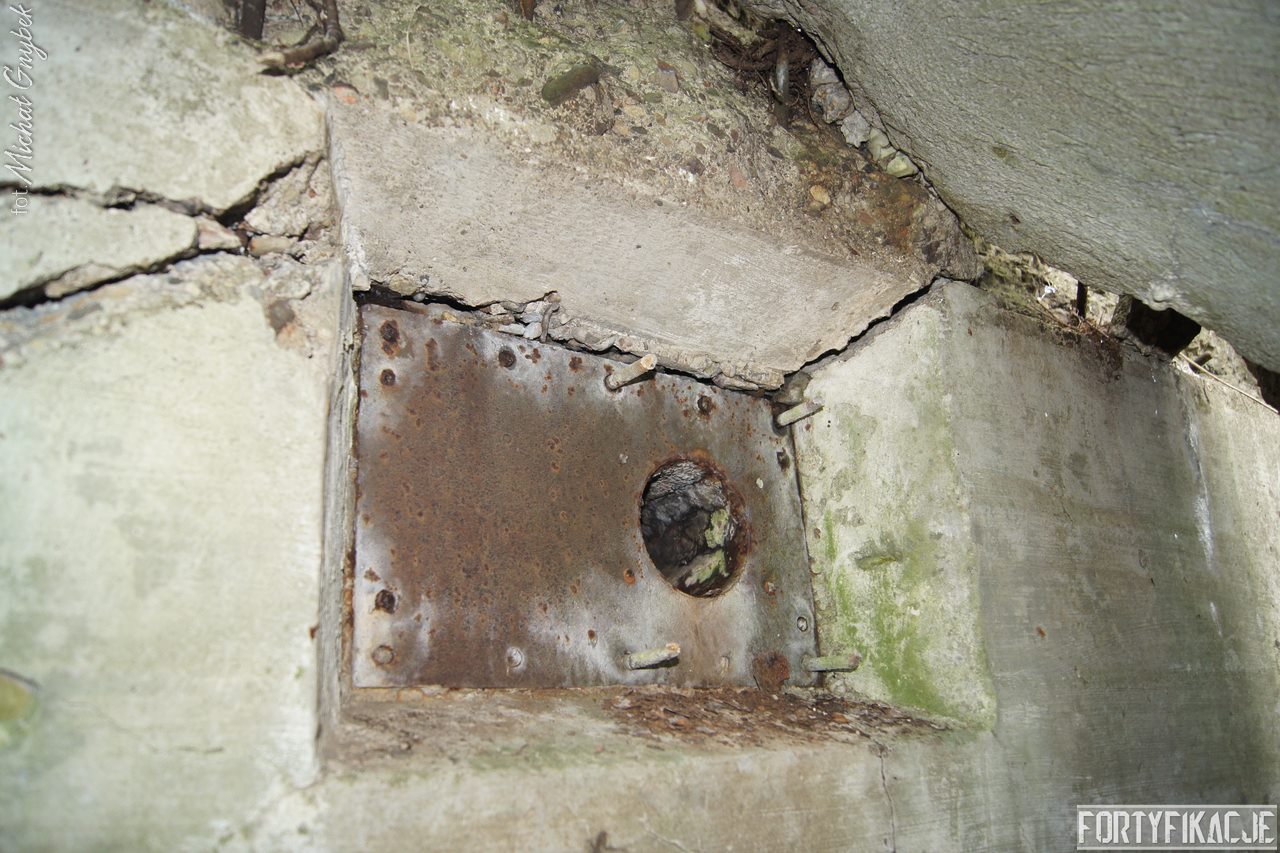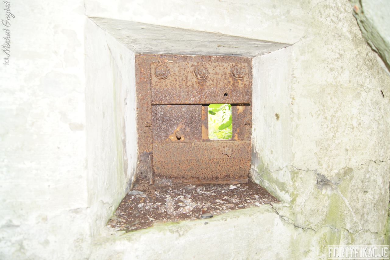 Wnętrze schronu niestety mocno ucierpiało, mimo to można tu odnaleźć kilka ciekawych detali. Na ścianach zachowały się ślady po napisach eksploatacyjnych, w tym mówiący o dacie jego wzniesienia. W tylnej ścianie izby bojowej zachowała się ponadto tarcza stalowa ze strzelnicą 48P8, która stanowiła ochronę dla strzelca broniącego wejścia. Niestety schron - jak widać na poniższych zdjęciach - jest obecnie dosyć mocno zaśmiecony... Być może prędzej lub później znajdą się dobre dusze, które go wysprzątają, bo z pewnością może być on traktowany jako intrygująca atrakcja turystyki historycznej/eksploracyjnej!