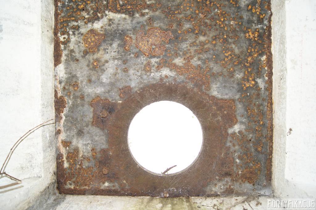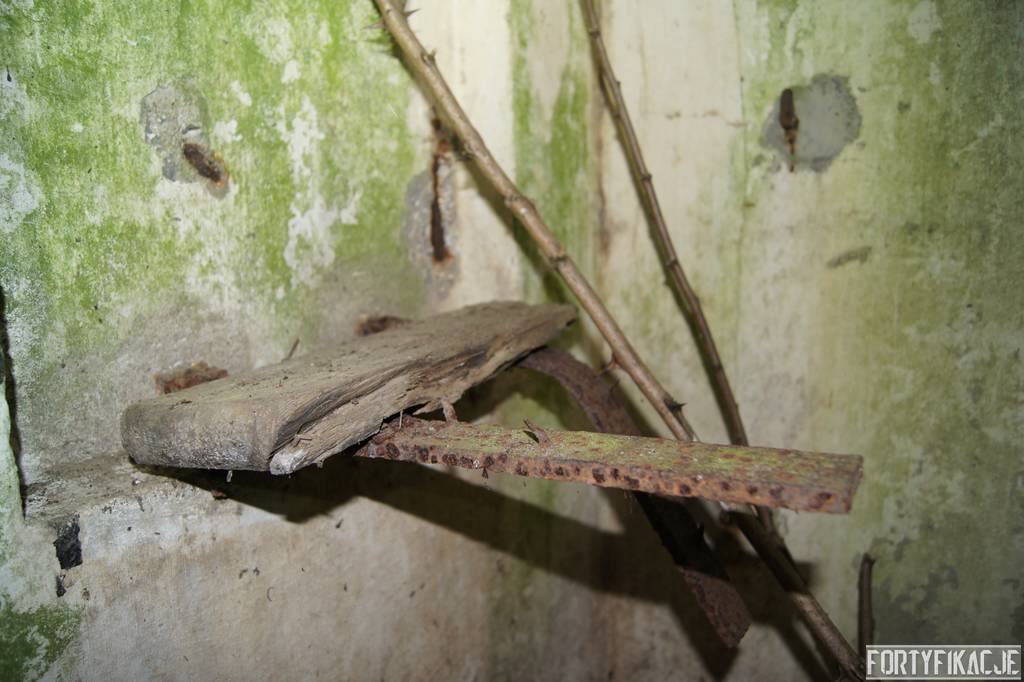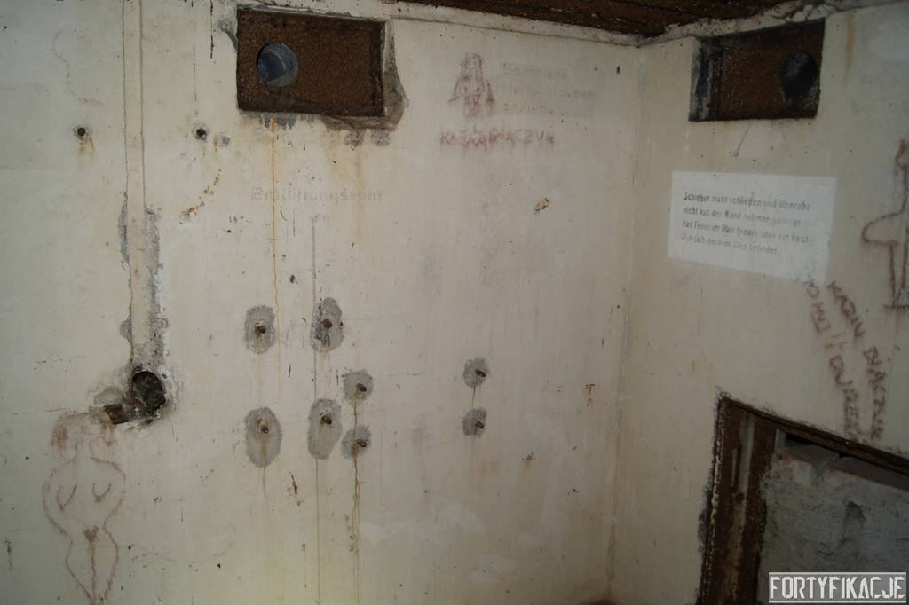 Zajrzyjmy do środka! Obiekt podporządkowany był swej obserwacyjno-dowódczej funkcji. Obiekt posiadał trzy pomieszczenia, w których zachowało się kilka elementów wyposażenia. Co oczywiste najciekawszym jest stanowisko obserwatora, w którym możemy obejrzeć podest, na którym stał obserwator, drewniane składane siedzisko (zachowały się resztki drewnianego blatu!) oraz stalową płytę osłaniającą stanowisko. W samej izbie obserwatora znajduje się również nie lada ciekawostka: jest to czerpnia, która doprowadzała powietrze do izby załogi. Prawdopodobnie samo pomieszczenie służące obserwatorowi nie było gazoszczelne! W izbie załogi zachowana jest strzelnica broni ręcznej z tzw. pancerzem skrzynkowym, a na ścianach widoczne liczne, choć nadszarpnięte przez ząb czasu napisy eksploatacyjne. Niestety obiekt jest podtapiany przez wodę deszczową.