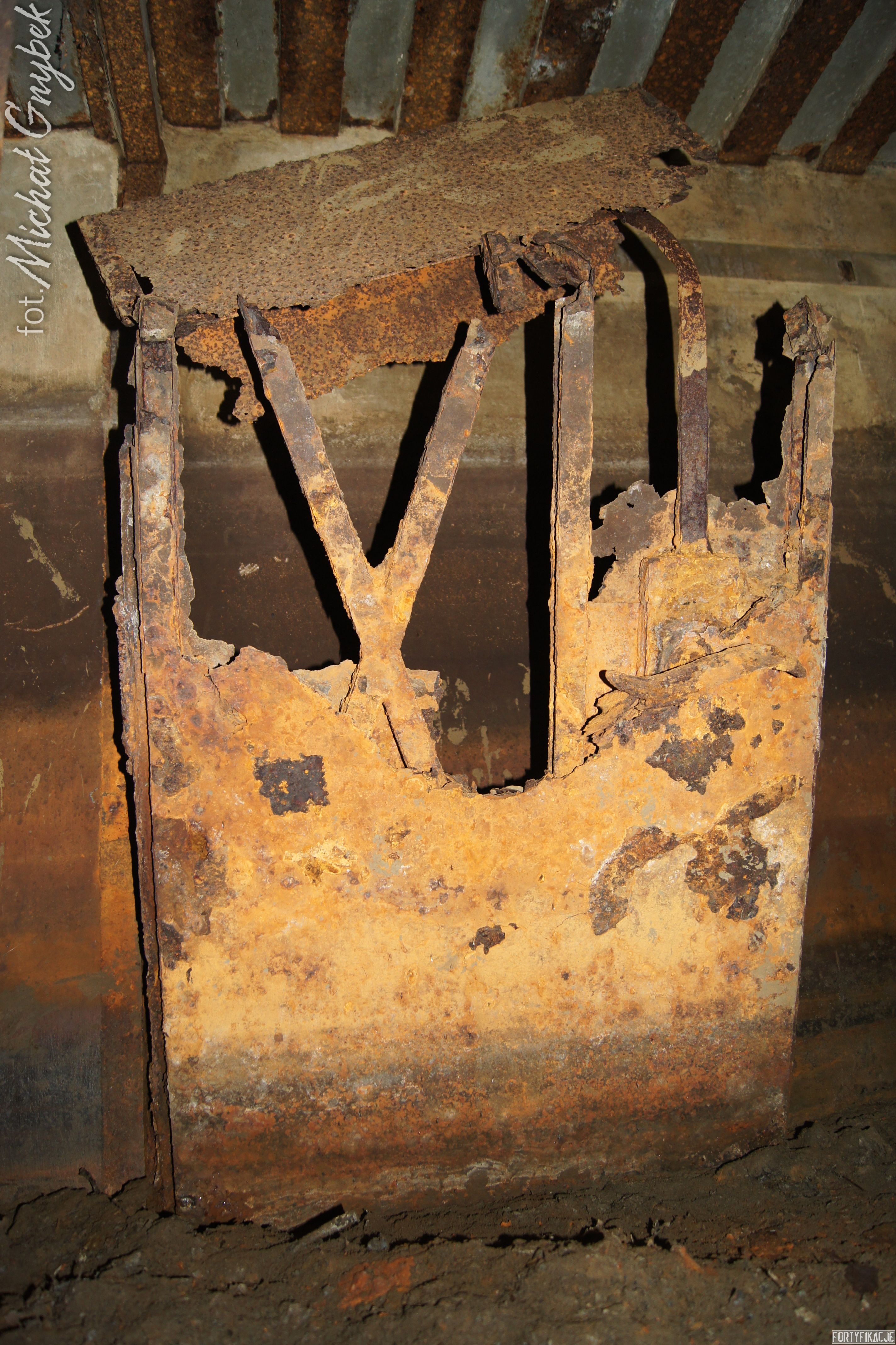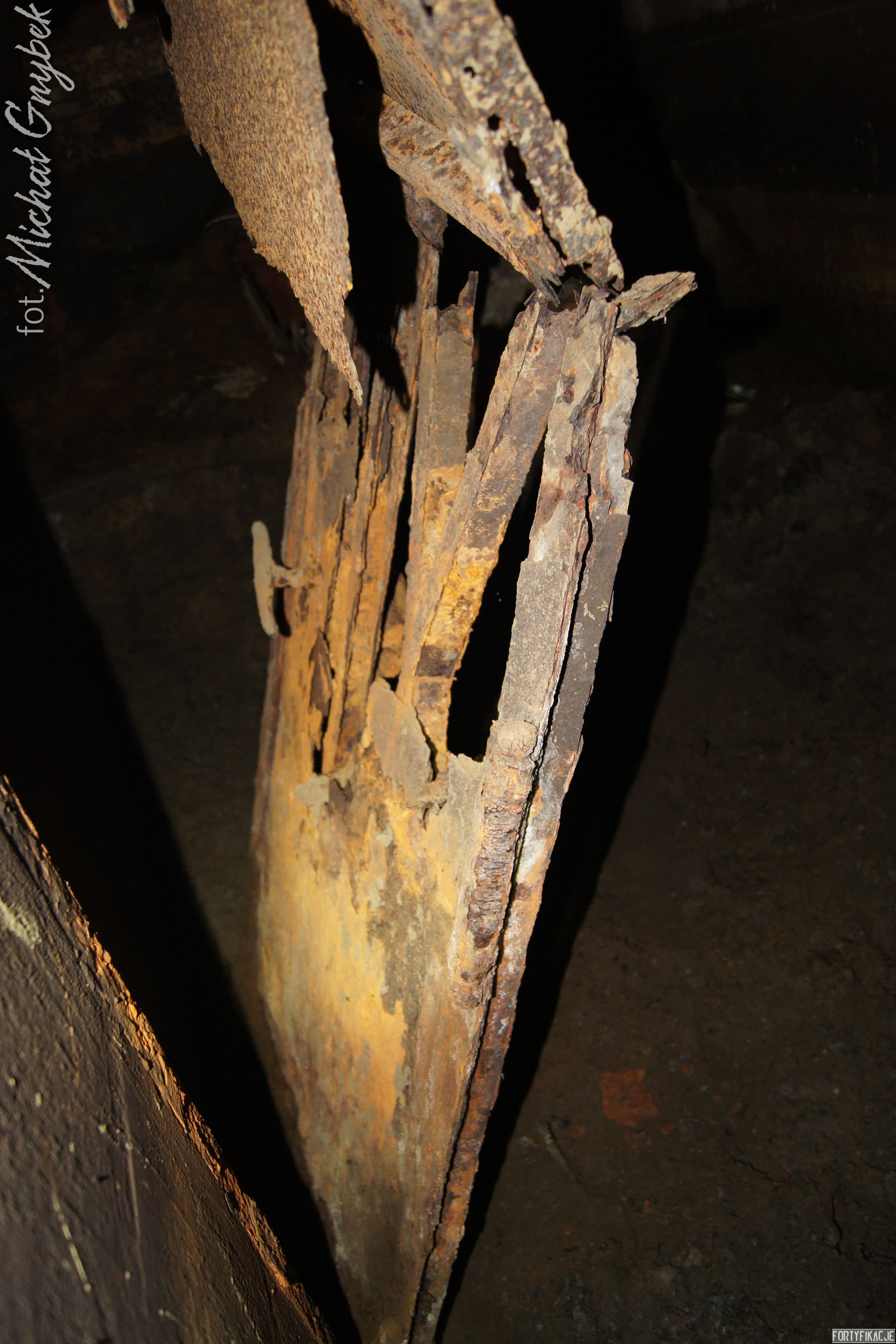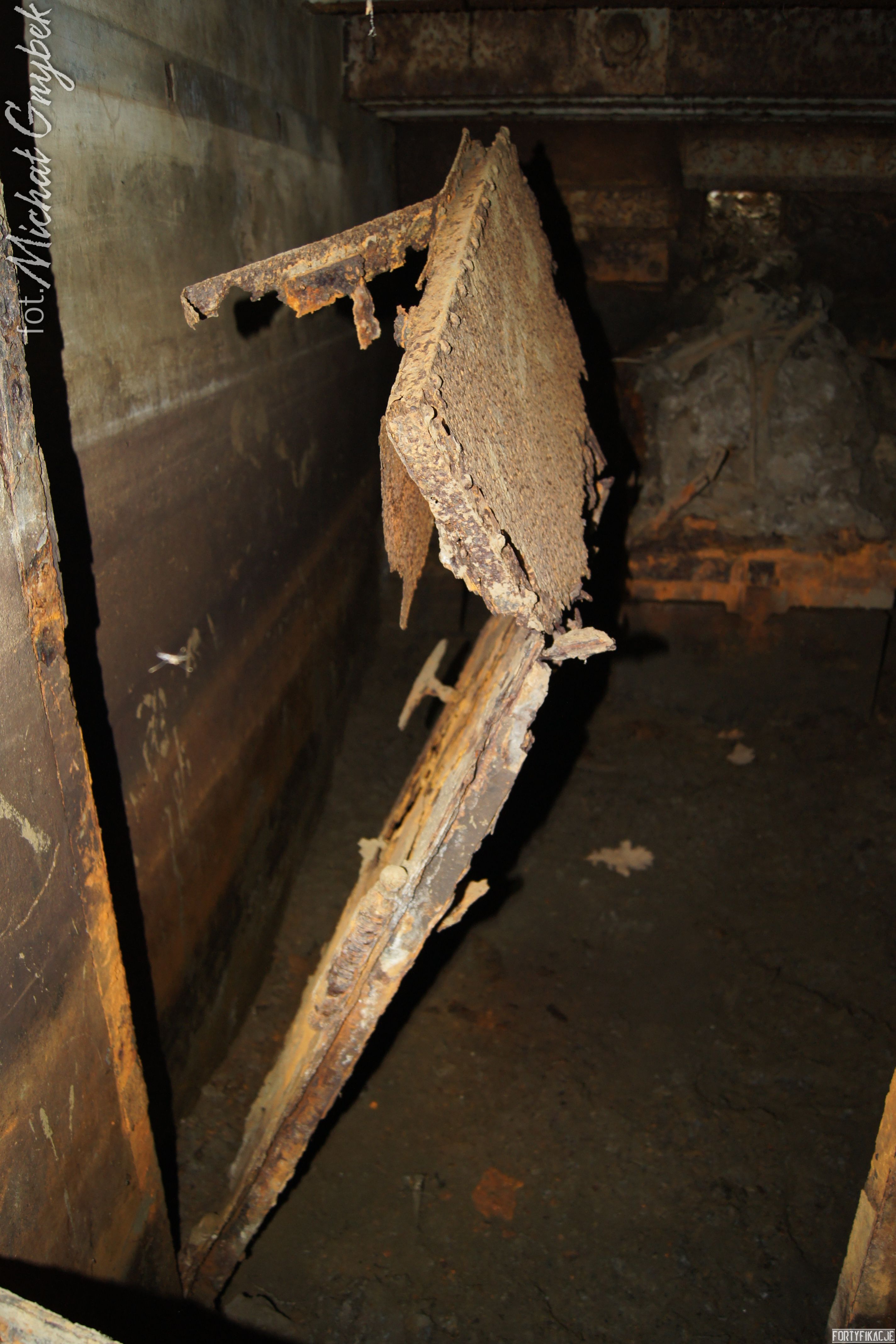 Schron - niestety - regularnie zalewany jest przez wody gruntowe. Z tego powodu jego uchowane wyposażenie niestety ulega coraz większej korozji. Skutki utleniania widać na powierzchni wszystkich stalowych elementów. Można powiedzieć, że i ten obiekt, przynajmniej pod względem elementów stalowych, umiera powolną śmiercią... Mam wrażenie, że jego bogate wnętrze zostało już zaopiekowane i żywię nadzieję, że jest to przynajmniej opieka pasjonatów, a nie złomiarzy... A skarbów tu jest kilka: zachowana płyta stalowa, pozostałości po stoliku pod prowadnicę i lawetę karabinową i wreszcie częściowo zachowane obie pary drzwi wewnętrznych!