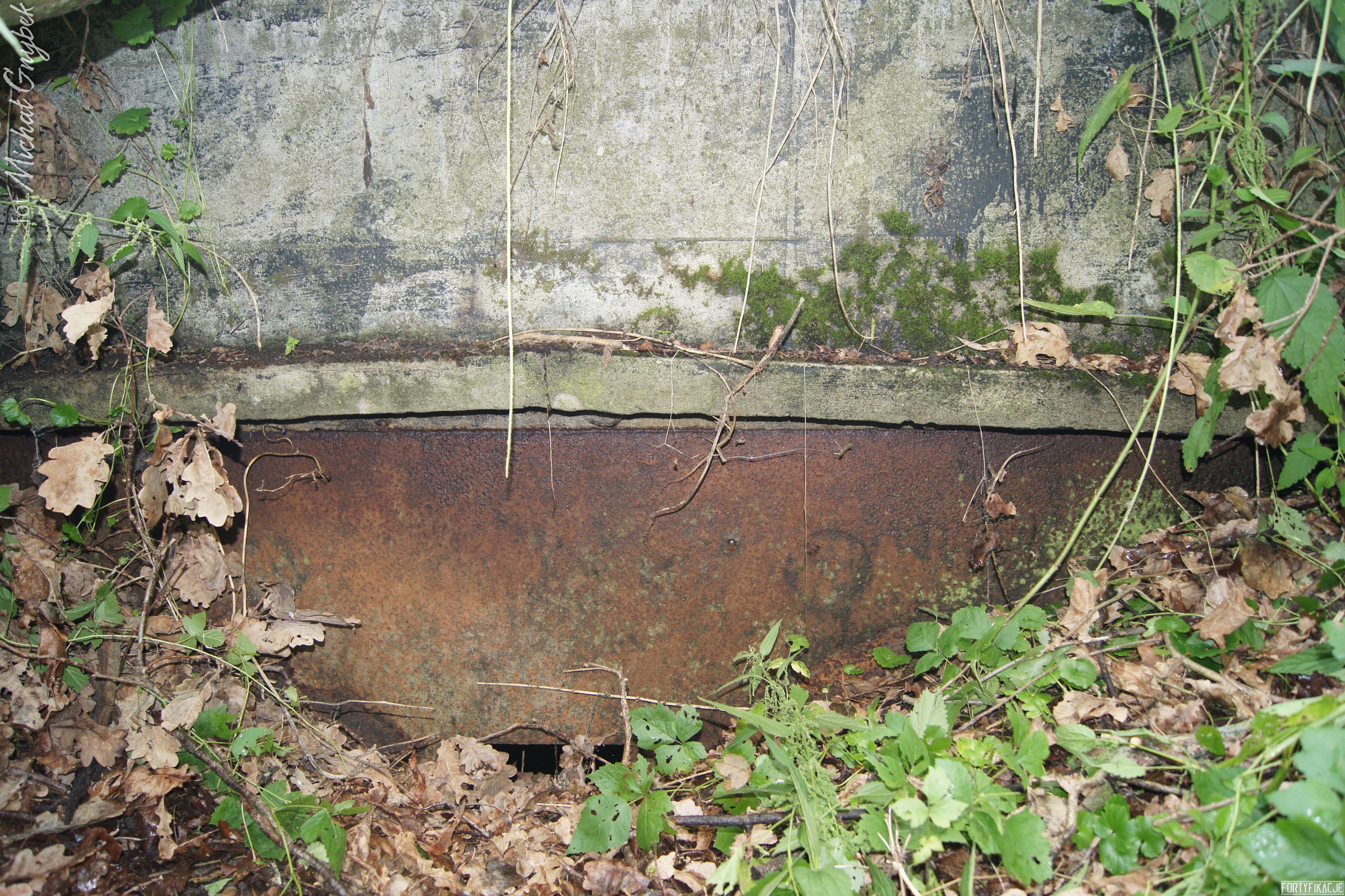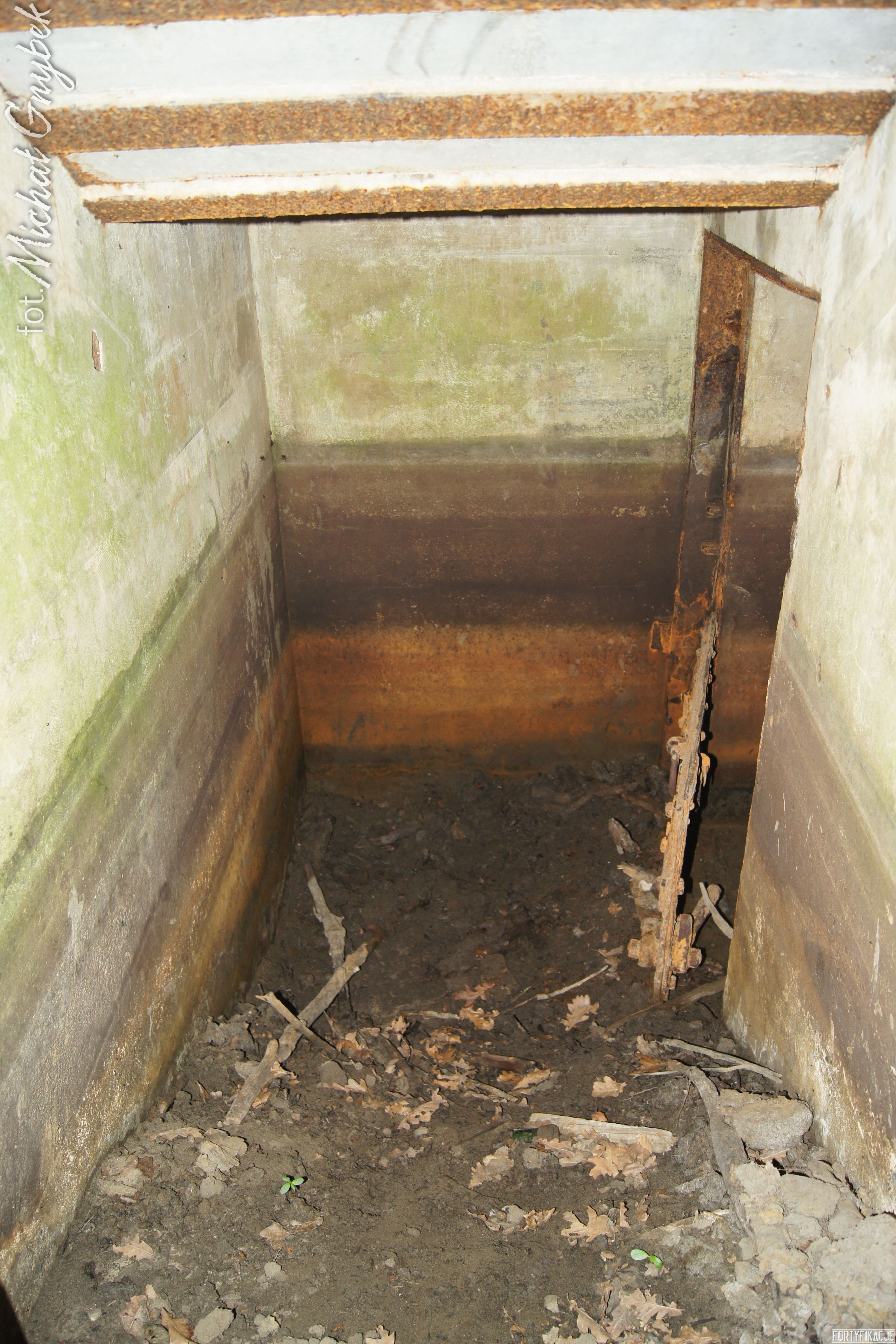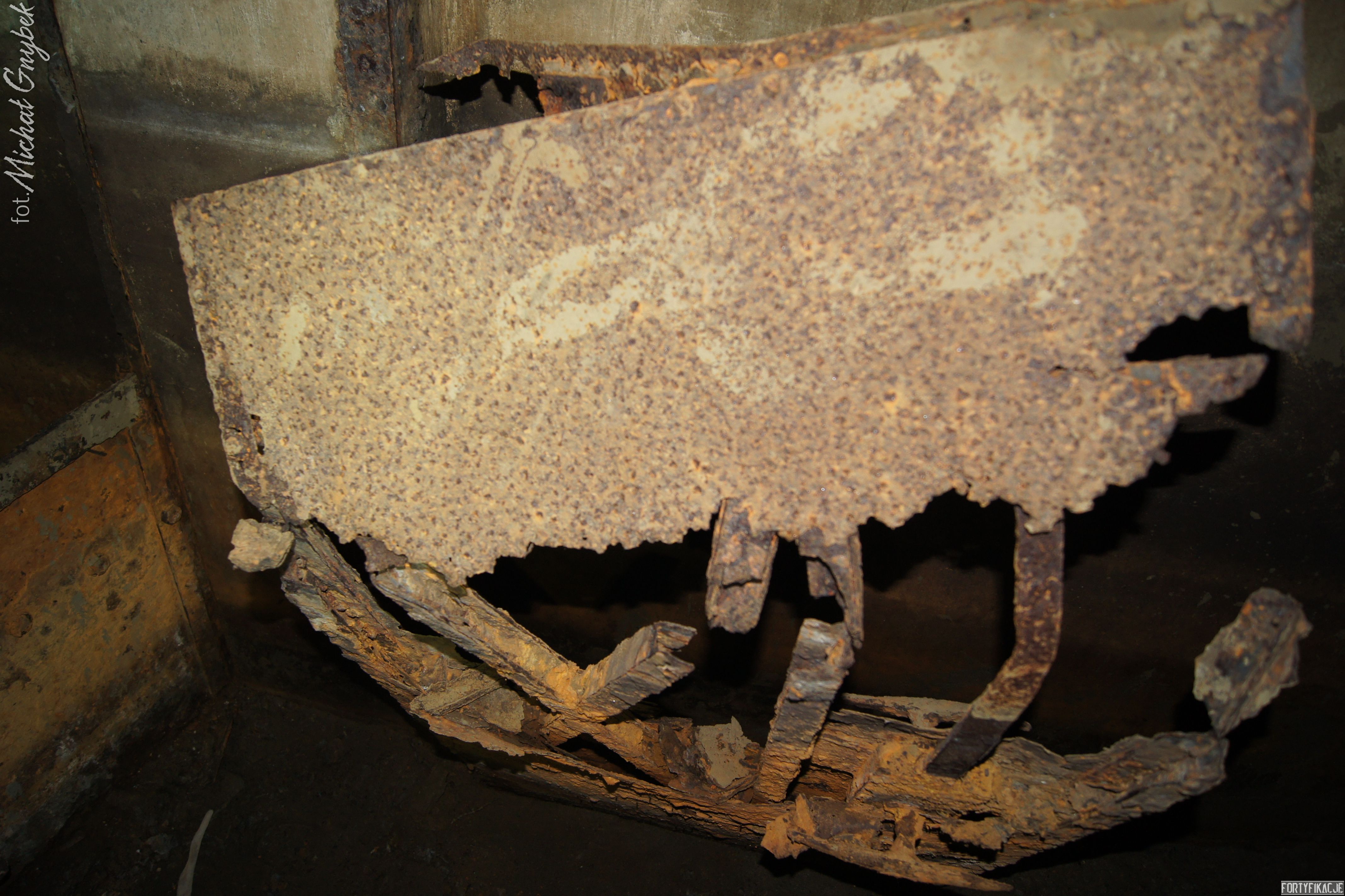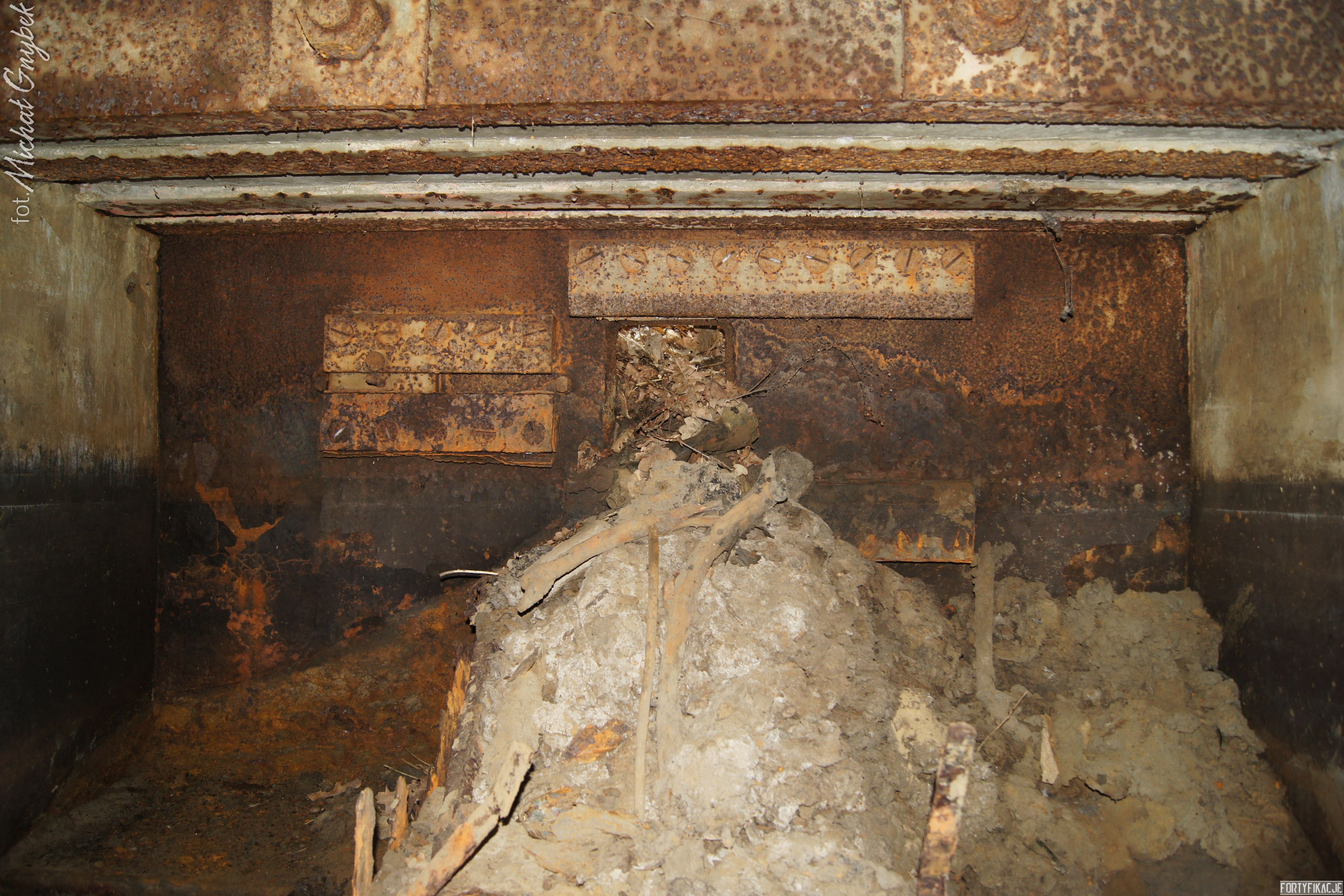 Schron - niestety - regularnie zalewany jest przez wody gruntowe. Z tego powodu jego uchowane wyposażenie niestety ulega coraz większej korozji. Skutki utleniania widać na powierzchni wszystkich stalowych elementów. Można powiedzieć, że i ten obiekt, przynajmniej pod względem elementów stalowych, umiera powolną śmiercią... Mam wrażenie, że jego bogate wnętrze zostało już zaopiekowane i żywię nadzieję, że jest to przynajmniej opieka pasjonatów, a nie złomiarzy... A skarbów tu jest kilka: zachowana płyta stalowa, pozostałości po stoliku pod prowadnicę i lawetę karabinową i wreszcie częściowo zachowane obie pary drzwi wewnętrznych!